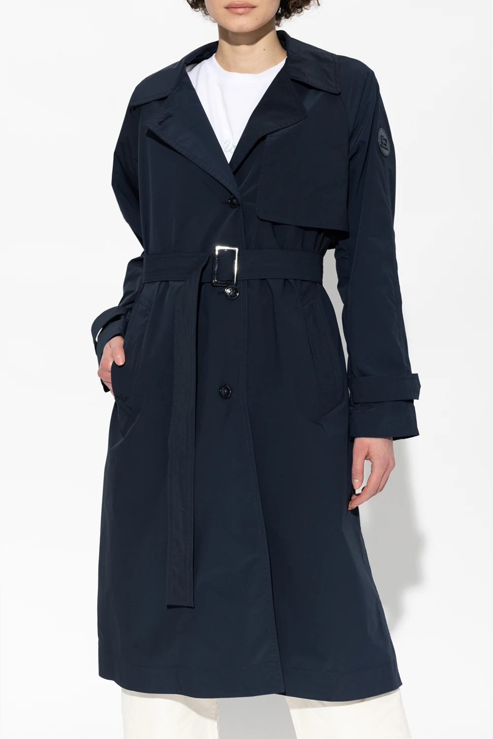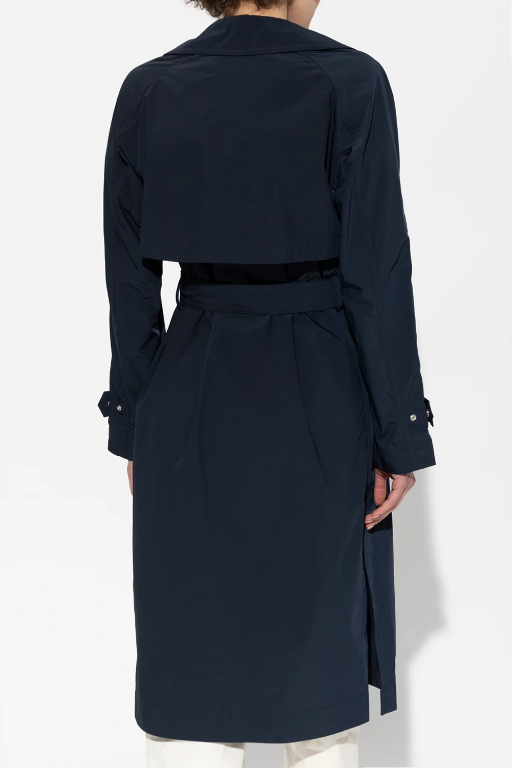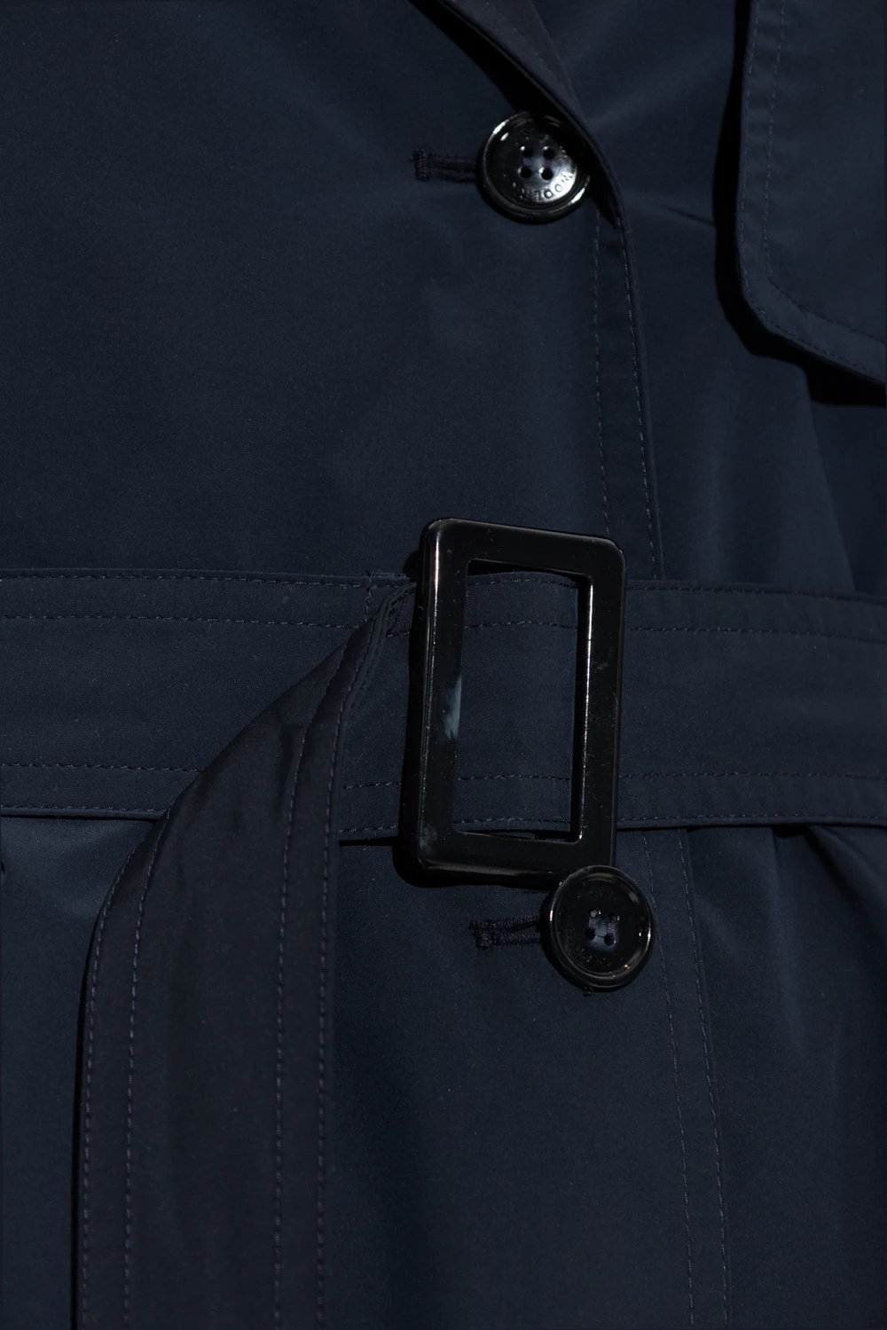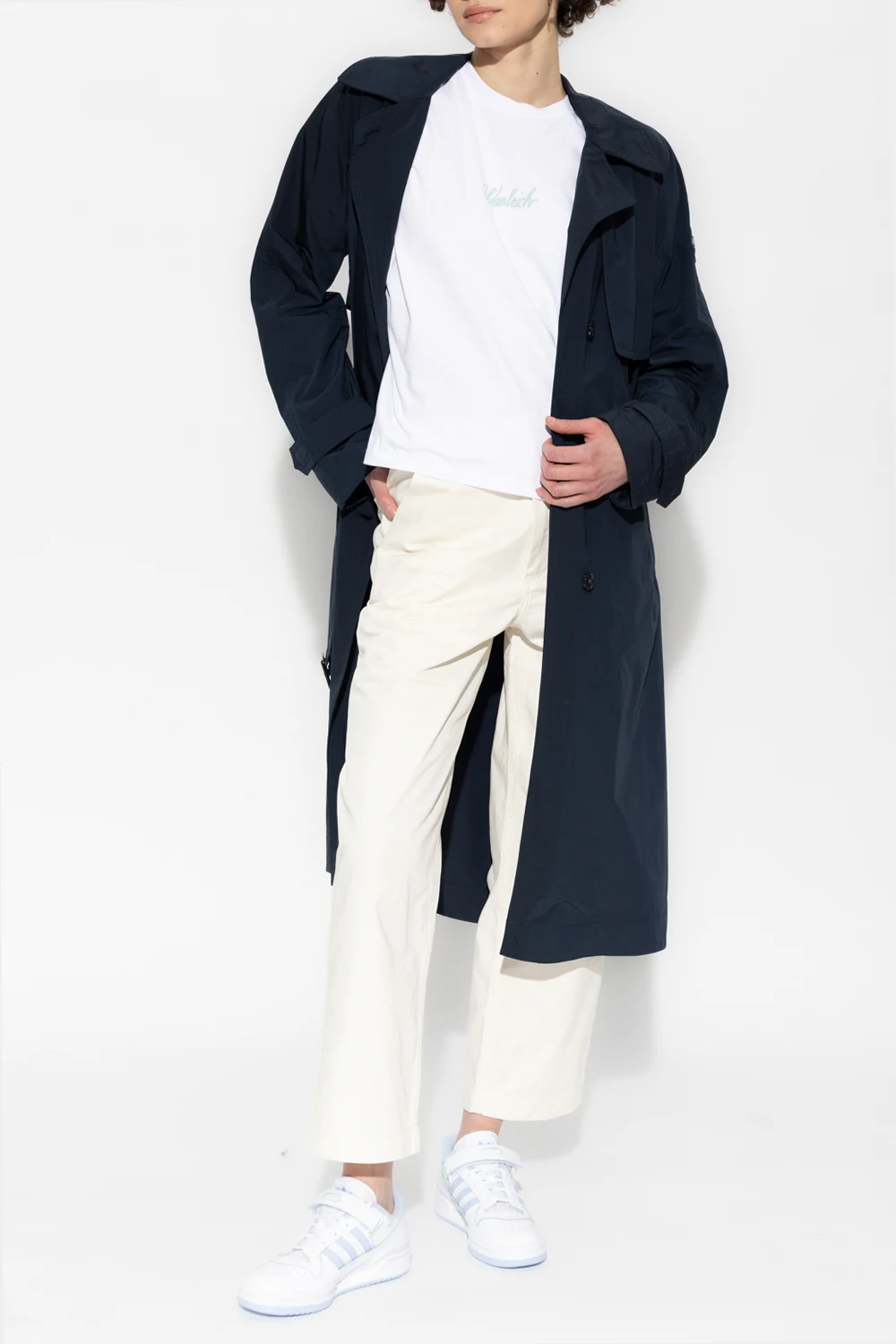 Navy trench coat from Woolrich. Fastened with buttons, this design features a buckled waist belt, sleeve patch with a logo, two snap-fastened pockets, double rear vent, notch lapels and long sleeves with snap-fastened cuffs.