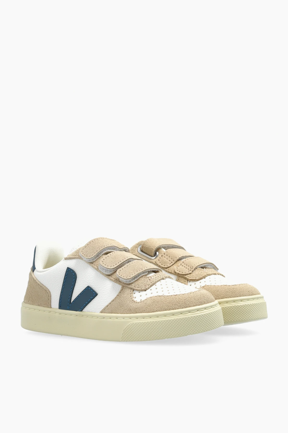 Introducing the SMALL V-10 CHROMEFREE LEATHER sneakers from the esteemed Veja Kids collection. These children\'s athletic shoes encapsulate a harmonious blend of classic design and modern elegance, tailored for the discerning young wearer. Crafted from a material reminiscent of suede leather and textile, these sneakers boast a perforated front for enhanced ventilation. The beige upper, accented with white and blue, offers a refined aesthetic, complemented by the iconic \'V\' logo gracing the sides. With three velcro straps ensuring ease of wear, and a rubber sole providing exceptional comfort and traction, these shoes promise both style and function. The interior is luxuriously cushioned for superior comfort, while the heel is adorned with the brand name, \"VEJA\". Why Choose These Shoes? Exquisite design with a timeless appeal. Eco-friendly materials, promoting sustainability. Effortless on and off with velcro closure. Comfortable fit with a padded interior. Made with care in Brazil using plant-tanned leather.