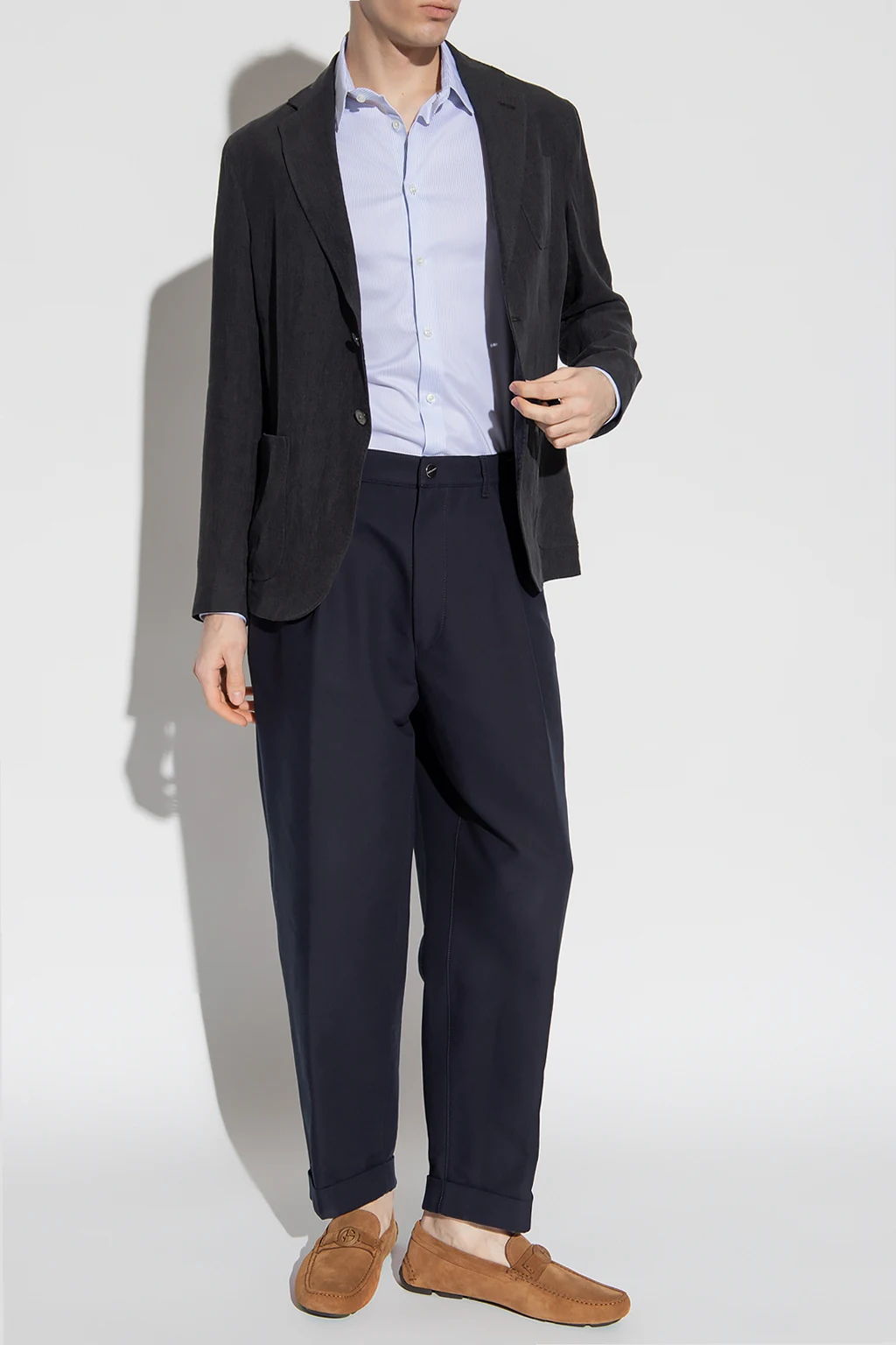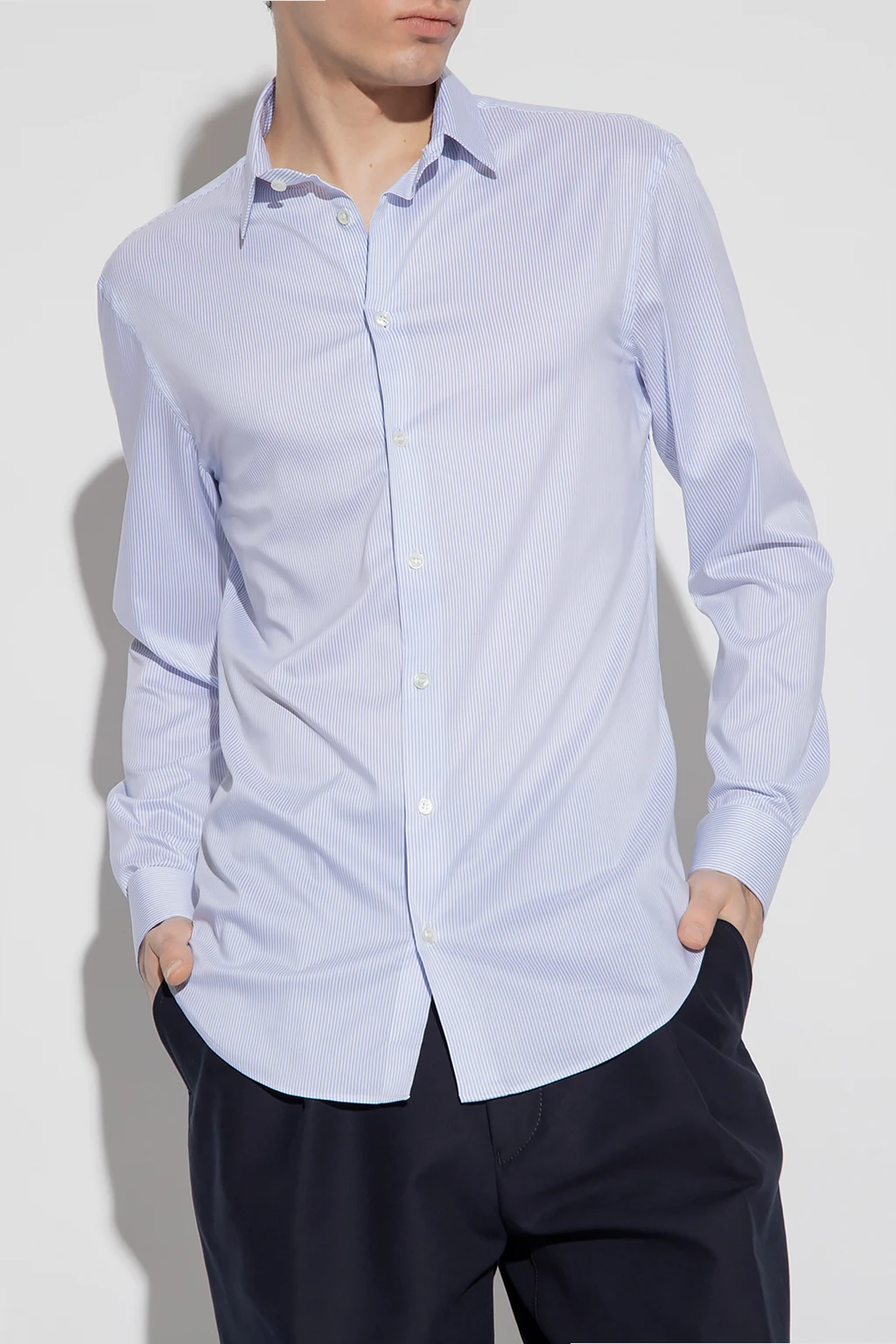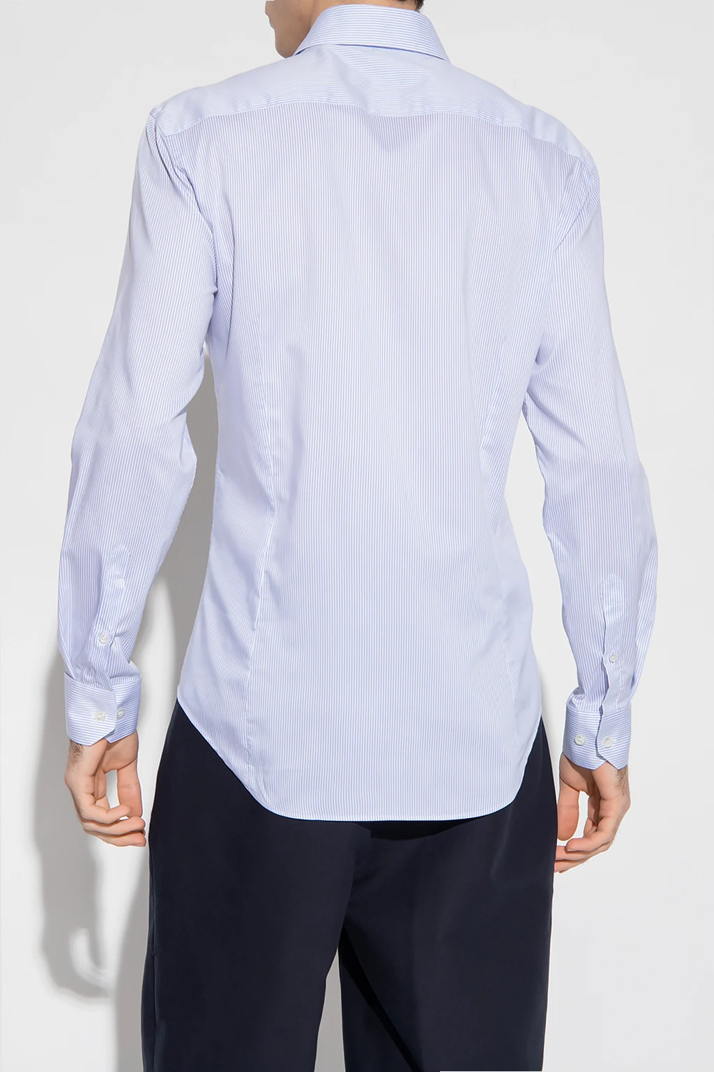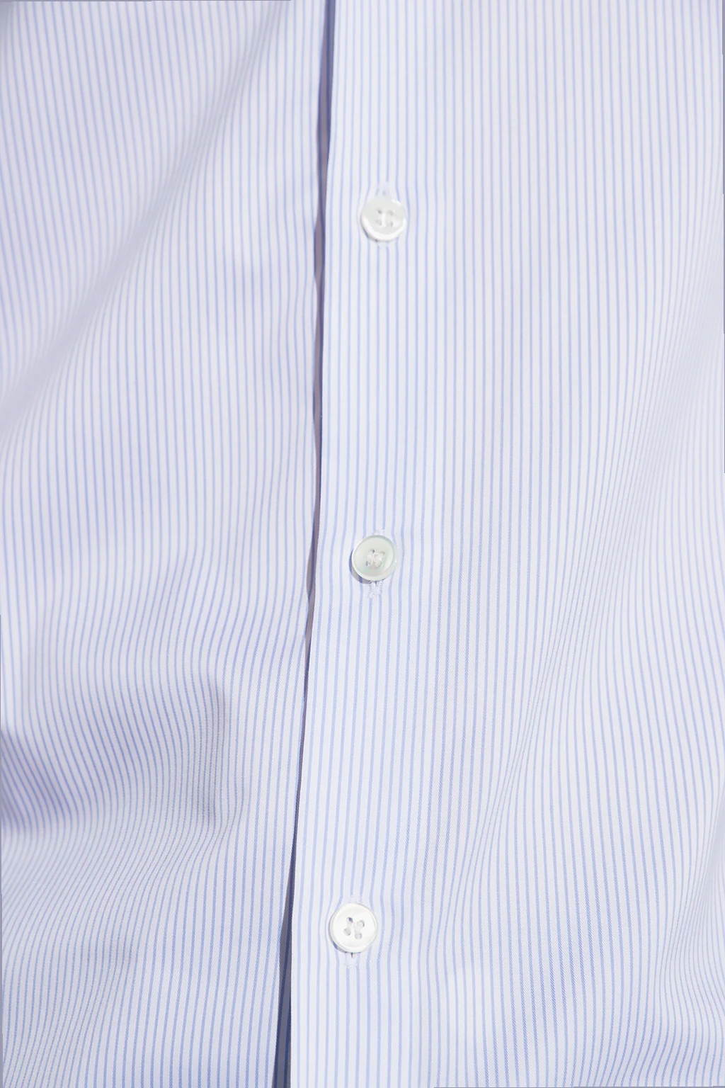 White fitted shirt from Giorgio Armani. Fastened with buttons, this design features a pinstripe pattern and long sleeves with buttoned cuffs.