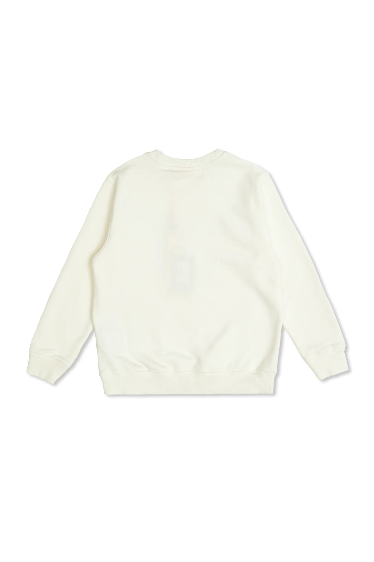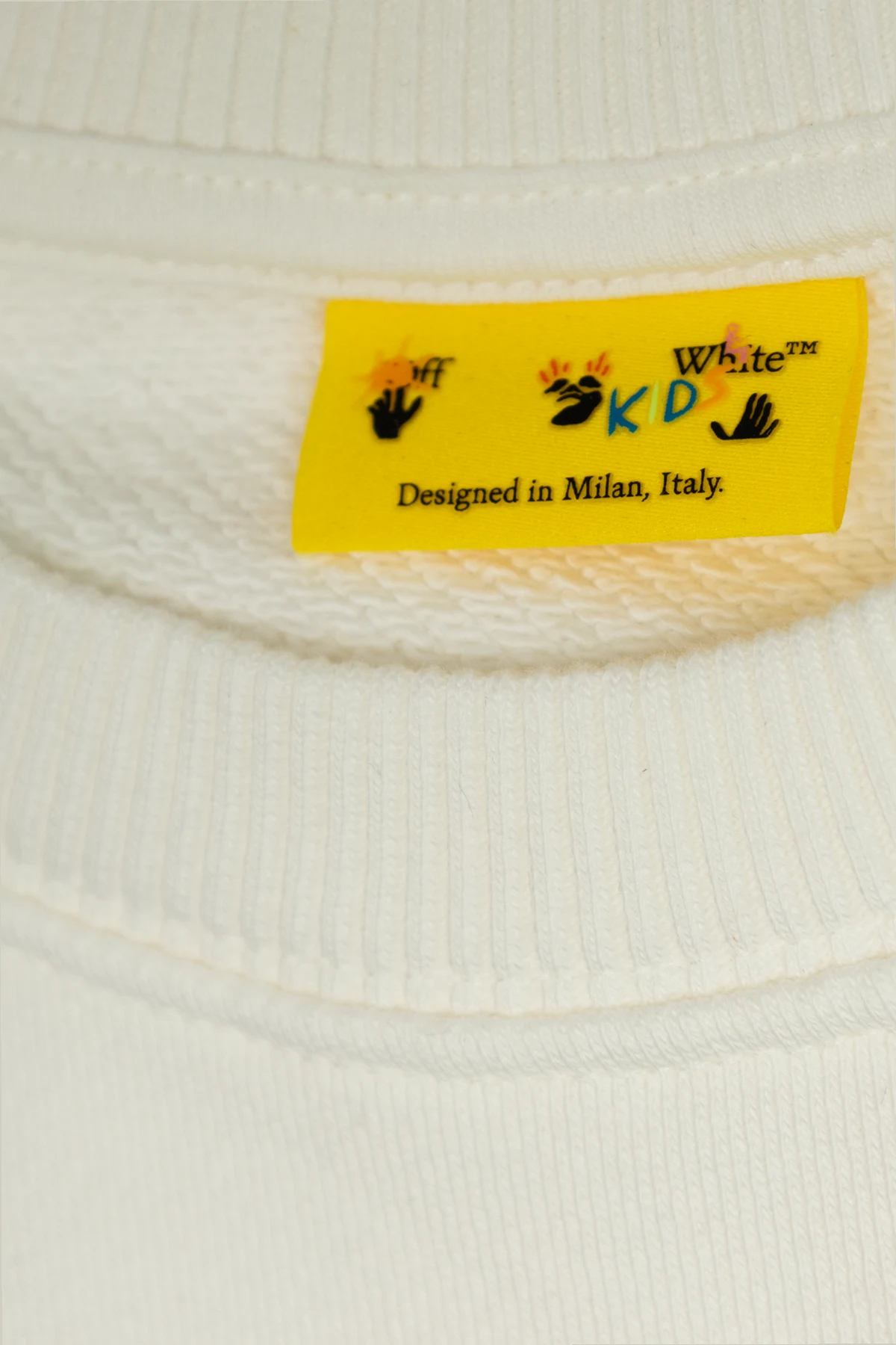 Introducing the Bluza z nadrukowanym logo from the esteemed children\'s collection of Off-White Kids. This white sweatshirt is a pure expression of simplicity and iconic style, designed for children aged 4 to 14. Crafted from soft cotton, it offers a classic silhouette with long sleeves and a round neckline, ensuring both comfort and elegance. The front proudly displays the Off-White logo, adorned with black contours and striking blue accents, adding a touch of modernity to the garment. Inside, a yellow label states \"Off-White KD,\" a testament to its design origins in the fashion capital, Milan, Italy. Why Choose This Product? Elegant simplicity with a touch of urban flair. Crafted from high-quality, soft cotton. Ideal for children aged 4 to 14. Designed in Milan, embodying Italian craftsmanship.