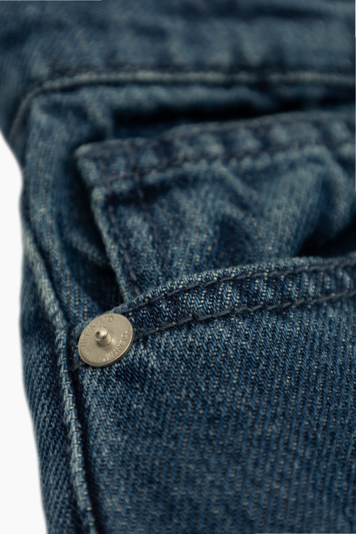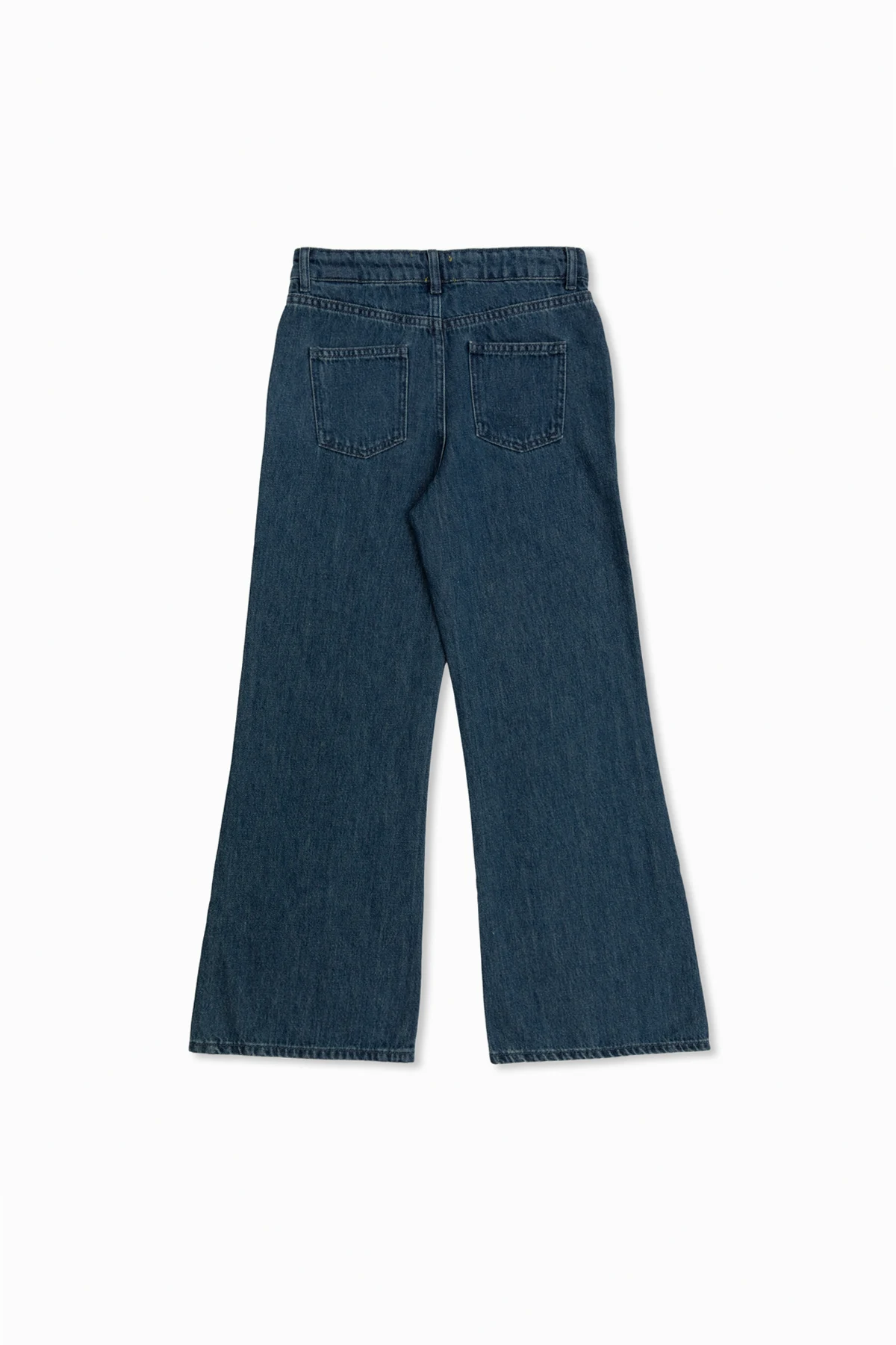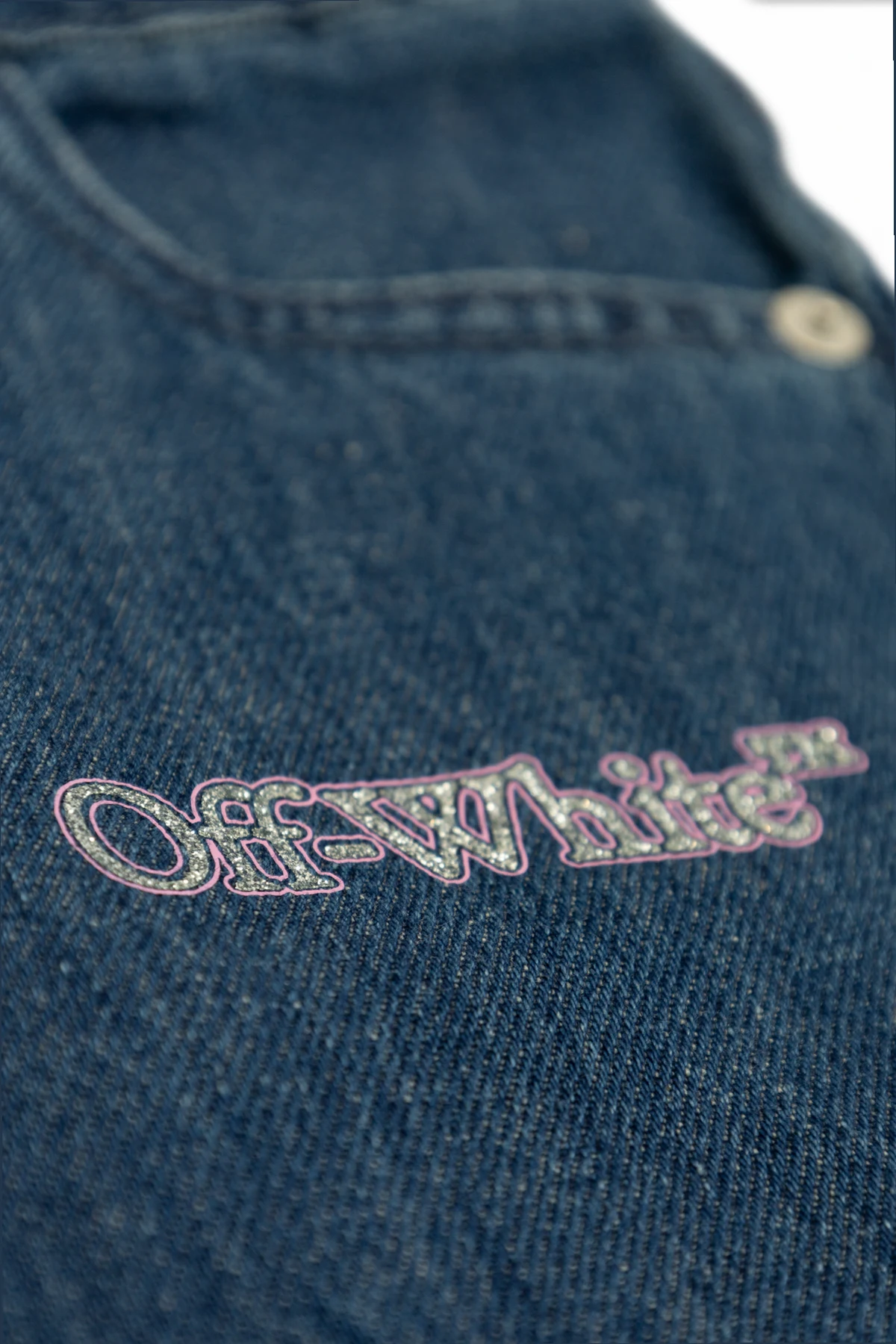 Introducing the exquisite Flared Jeans from the exclusive children\'s collection by the renowned brand Off-White Kids. Tailored for girls aged 4-14, these jeans epitomize both style and resilience, crafted from classic blue denim. Featuring a straight cut with subtly flared legs, these jeans offer a regular waistline that ensures comfort and a timeless fit. The denim material is not only robust but also exudes high quality, making it perfect for everyday wear. Meticulous attention to detail is evident in the embroidered Off-White logo in white with delicate shading, positioned above the front pocket. Standard front and back pockets, reinforced with metal rivets, enhance the jeans\' classic appeal. The jeans are secured with a button and zipper closure, a hallmark of traditional denim design. Why Choose This Product? Elegant and durable blue denim material. Stylish flared leg design. Comfortable regular waistline. Iconic embroidered Off-White logo. Reinforced with metal rivets for added strength. Convenient button and zipper closure.