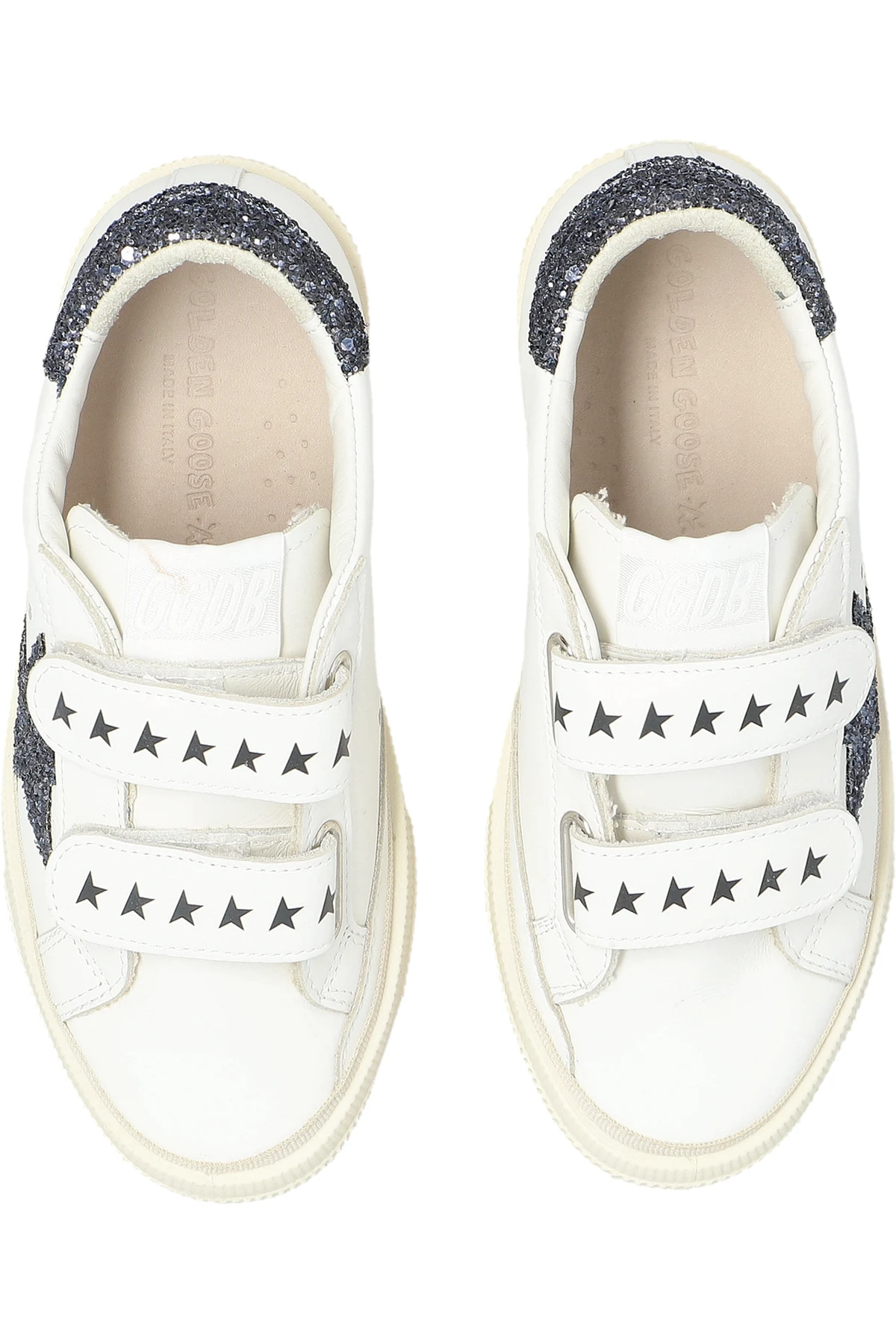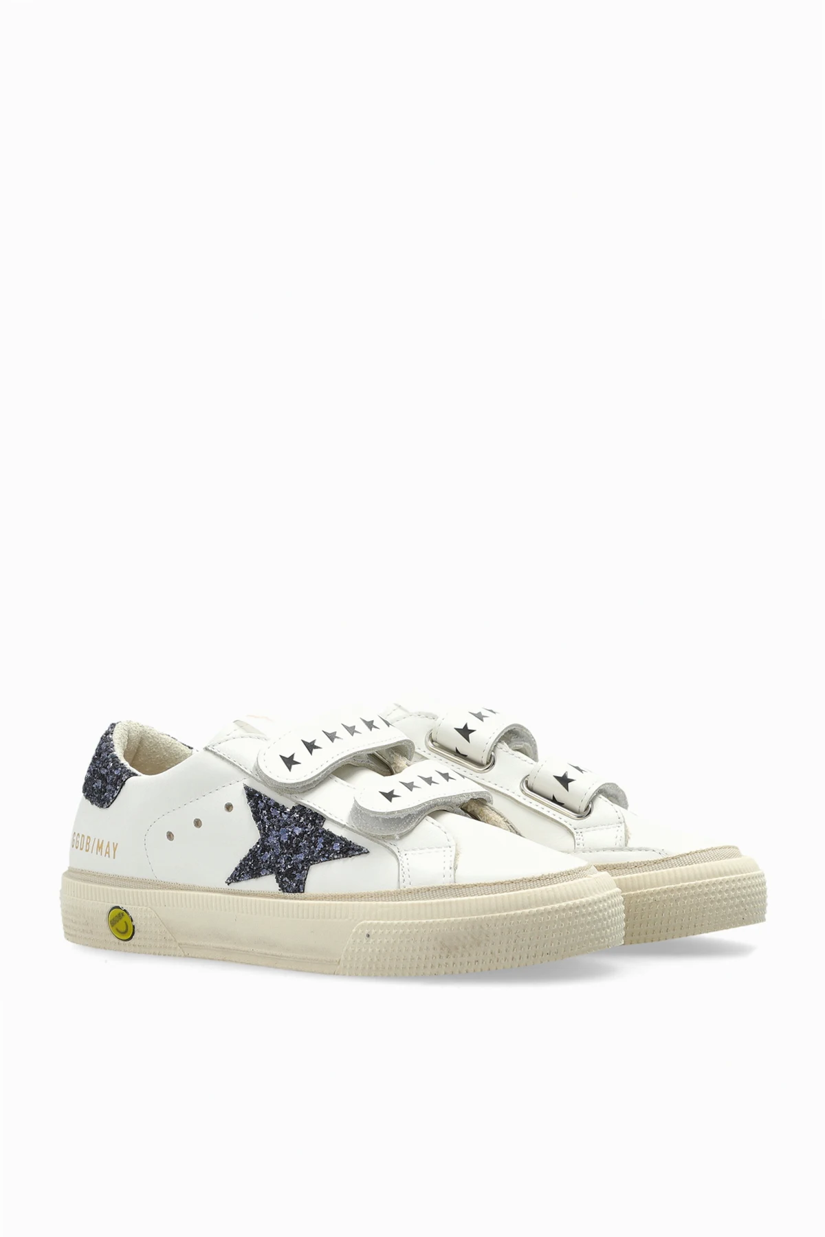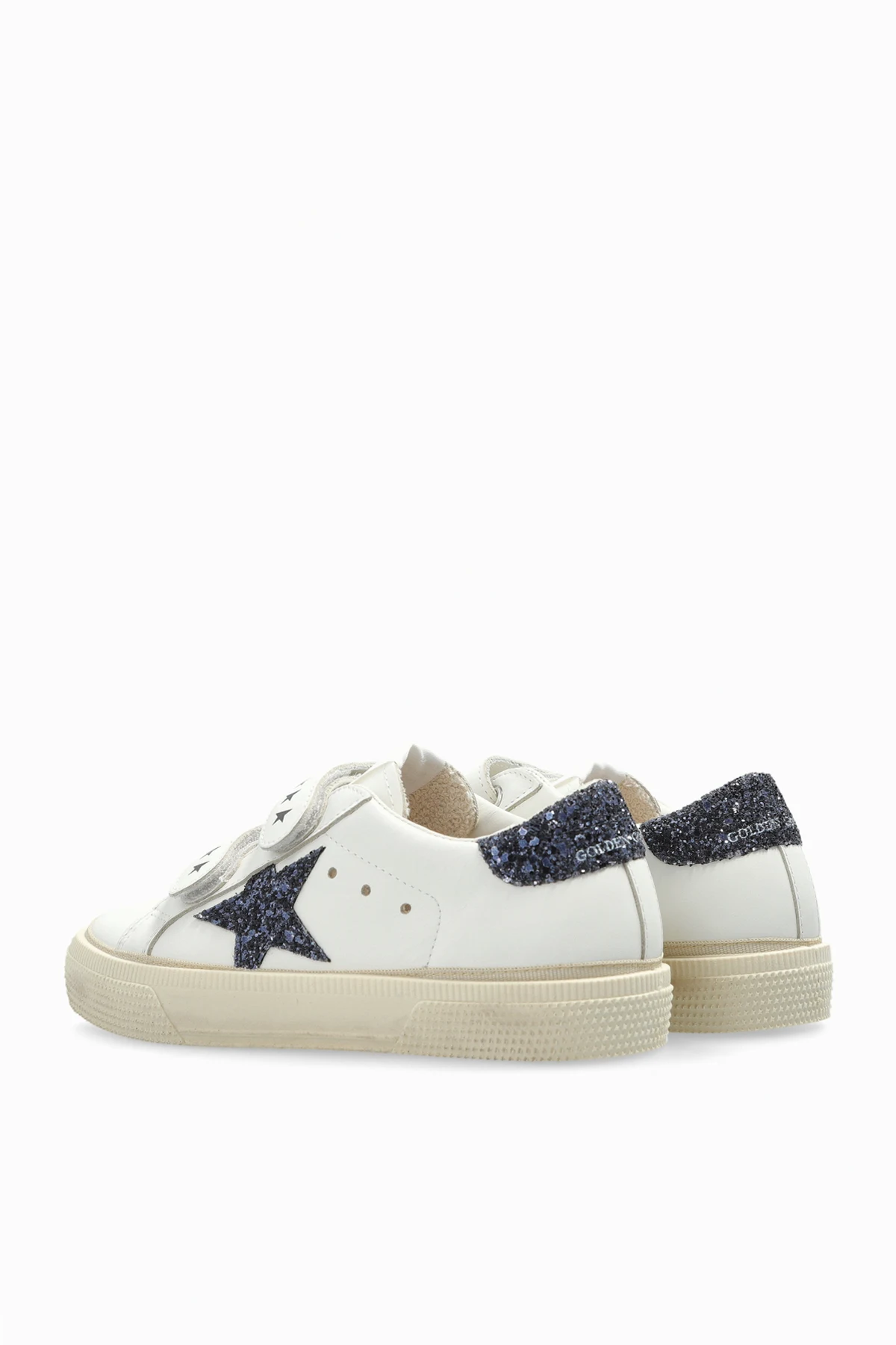 Introducing the ‘May School’ Sneakers by Golden Goose Kids — a consummate fusion of playful sophistication and refined Italian craftsmanship. These low-profile sneakers boast a timeless round toe, sculpted white sole, and a pristine leather upper that radiates effortless elegance. Accented with Golden Goose’s signature large star in shimmering navy glitter along the outer side, and enriched by coordinating glitter at the heel, these shoes capture the youthful spirit of the brand. The dual wide hook-and-loop straps, adorned with whimsical black star graphics, ensure easy and secure closure, while the golden “GGBDMAY” signature subtly partners with the design as a symbol of exclusivity. Lined with soft fabric for maximum comfort, set on a resilient rubber sole, and highlighted by the unique, artfully distressed finish, these sneakers stand as an iconic statement of style and individuality. Why choose this product? Exquisite premium leather exterior with artisanal details Iconic star motif and vintage-inspired, intentionally distressed look Secure, easy-to-use velcro closures for convenience Luxurious comfort, ideal for dynamic everyday wear Authentic designer signature with each pair