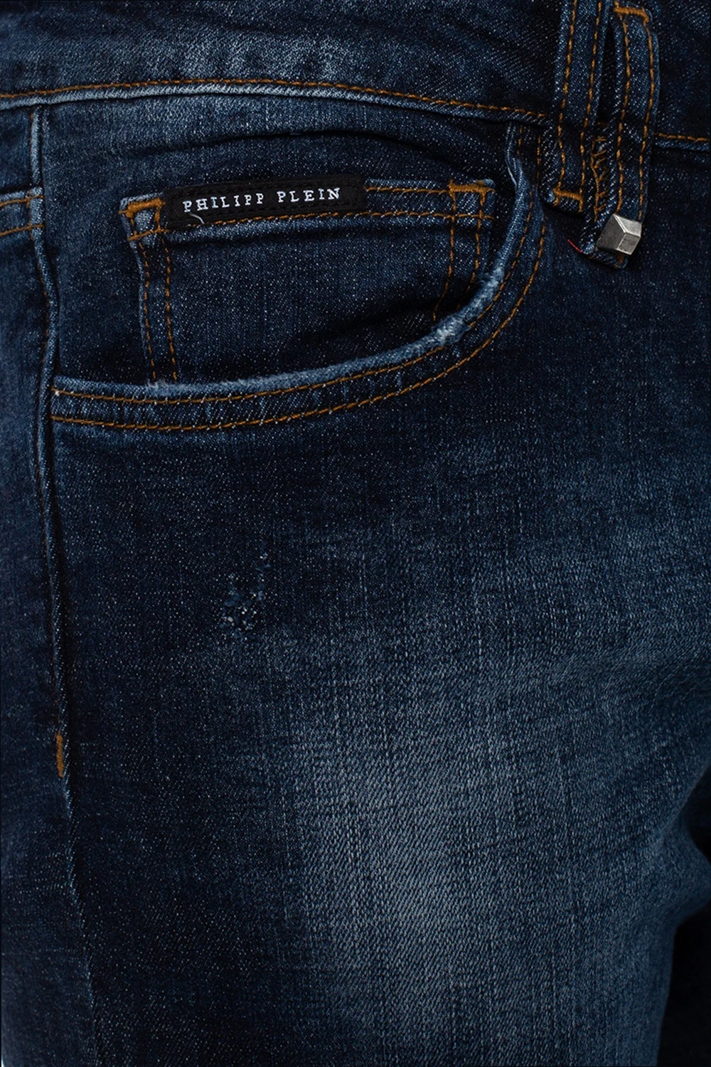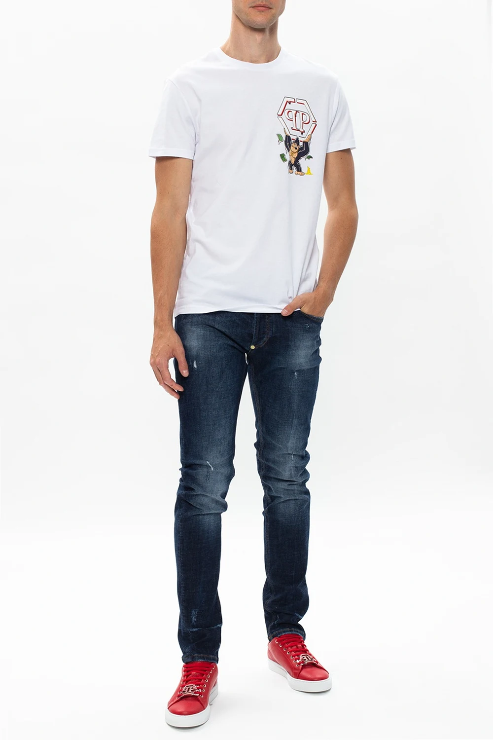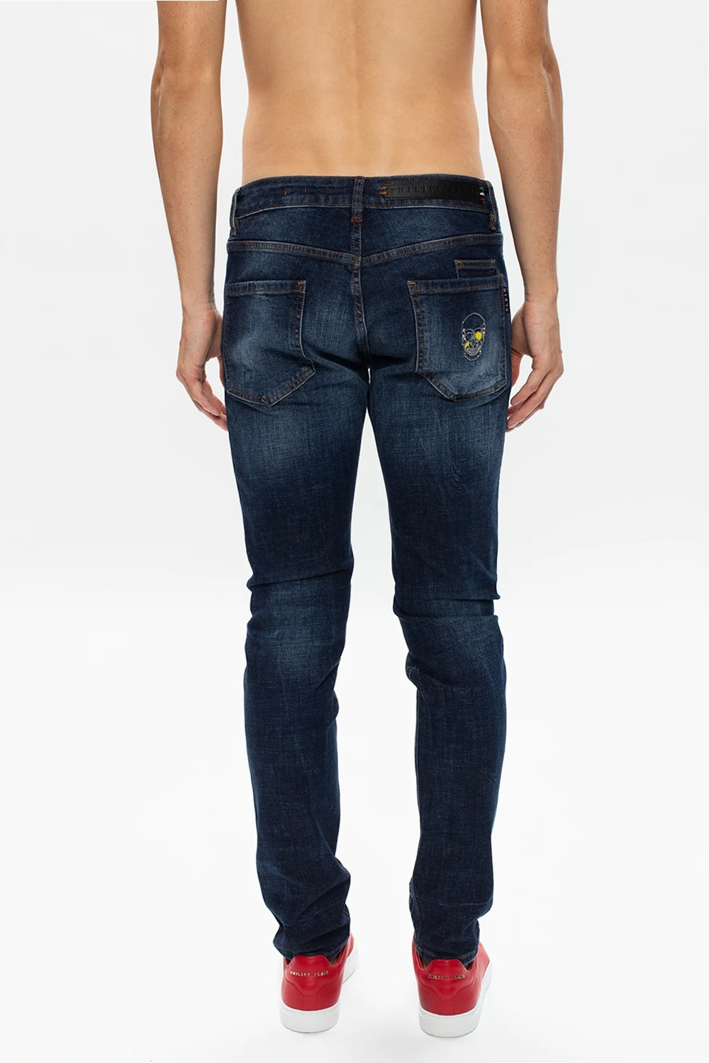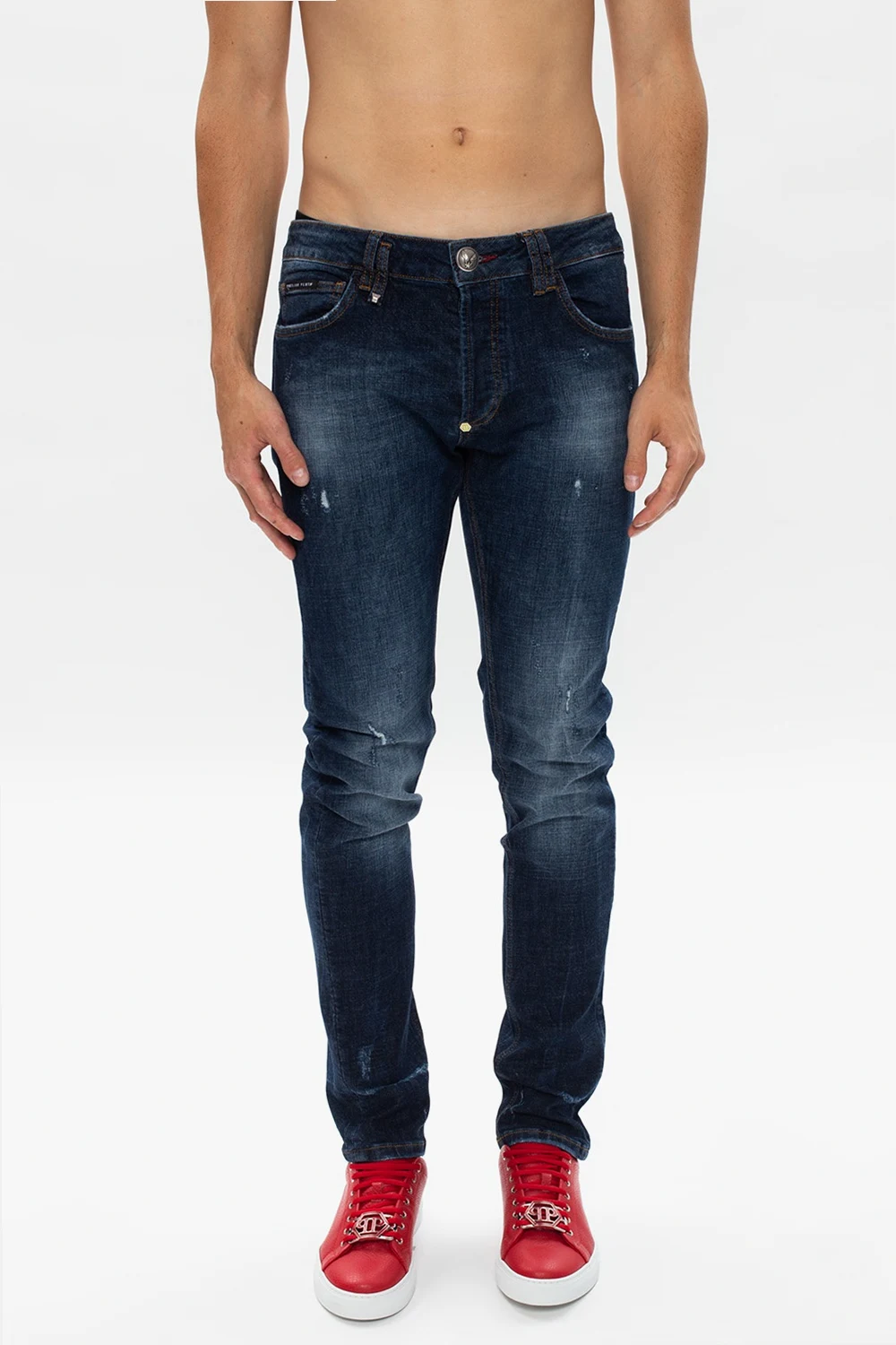 Blue jeans with a raw edge from Philipp Plein. Fastened with buttons, this tapered leg design comes with a logo, skull motif, three front pockets and two back pockets.