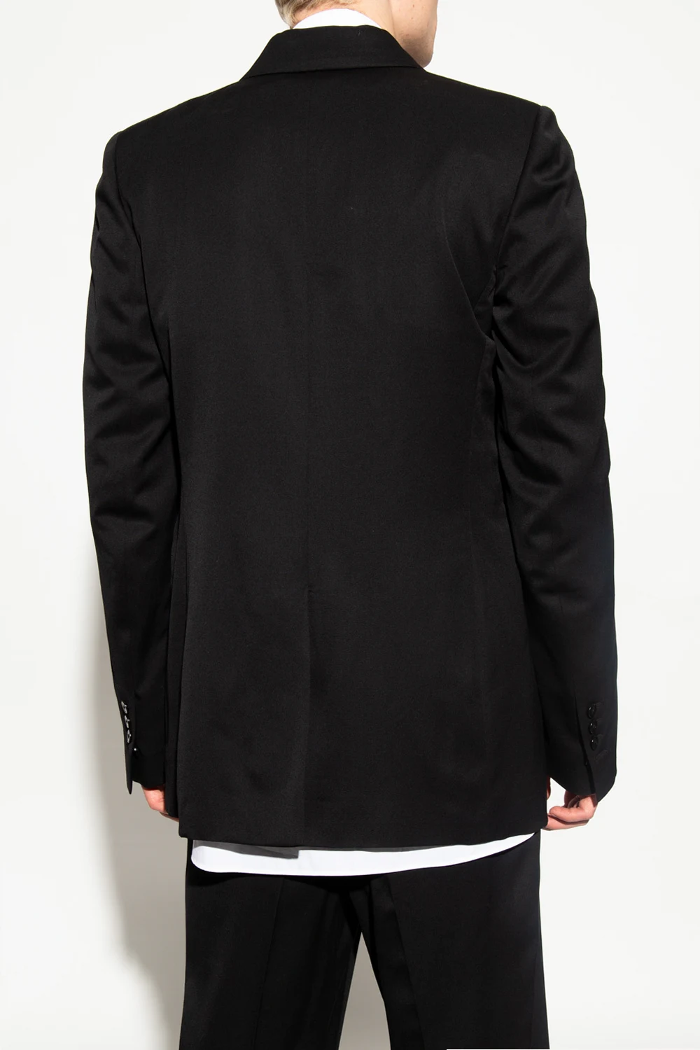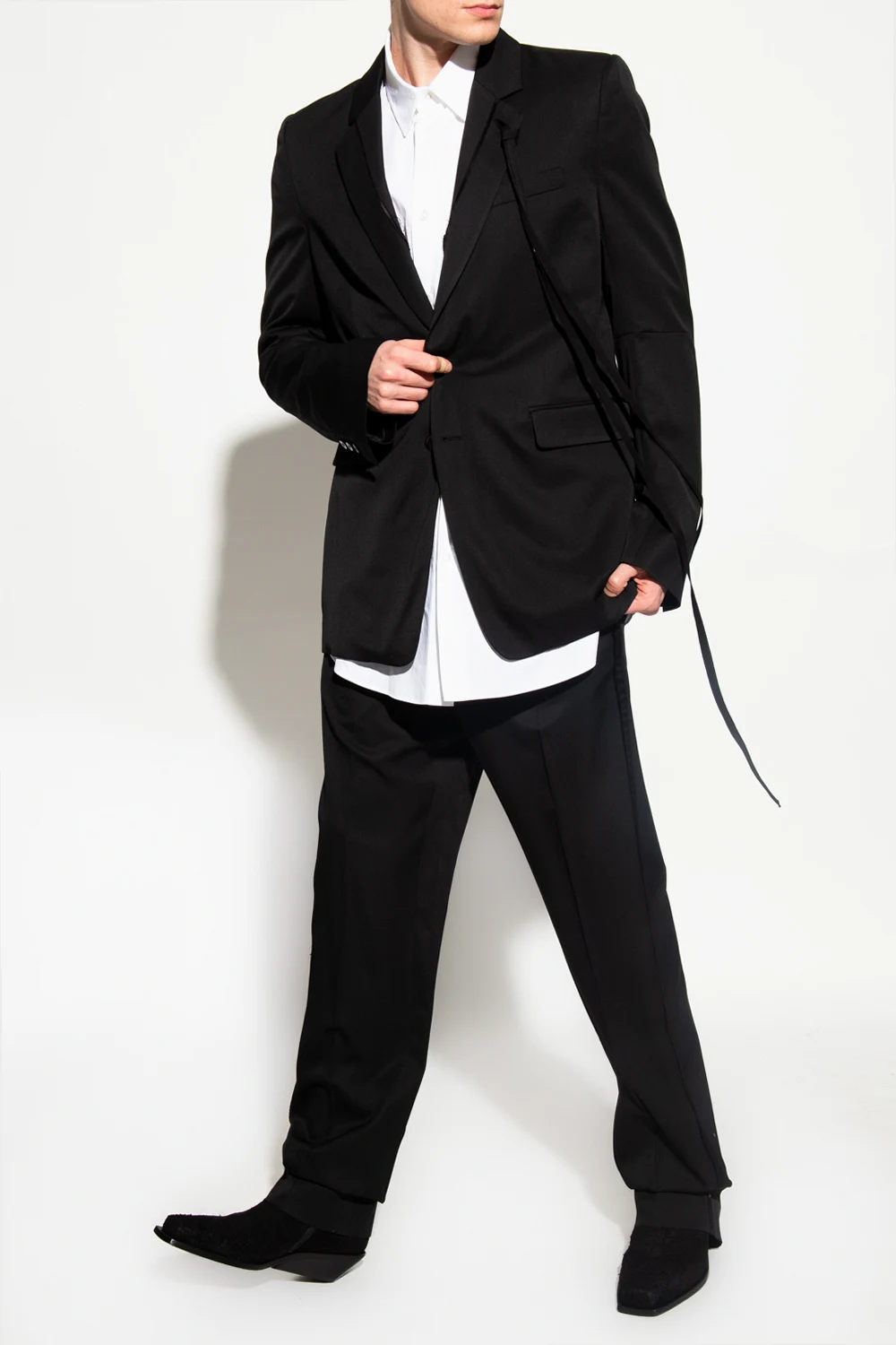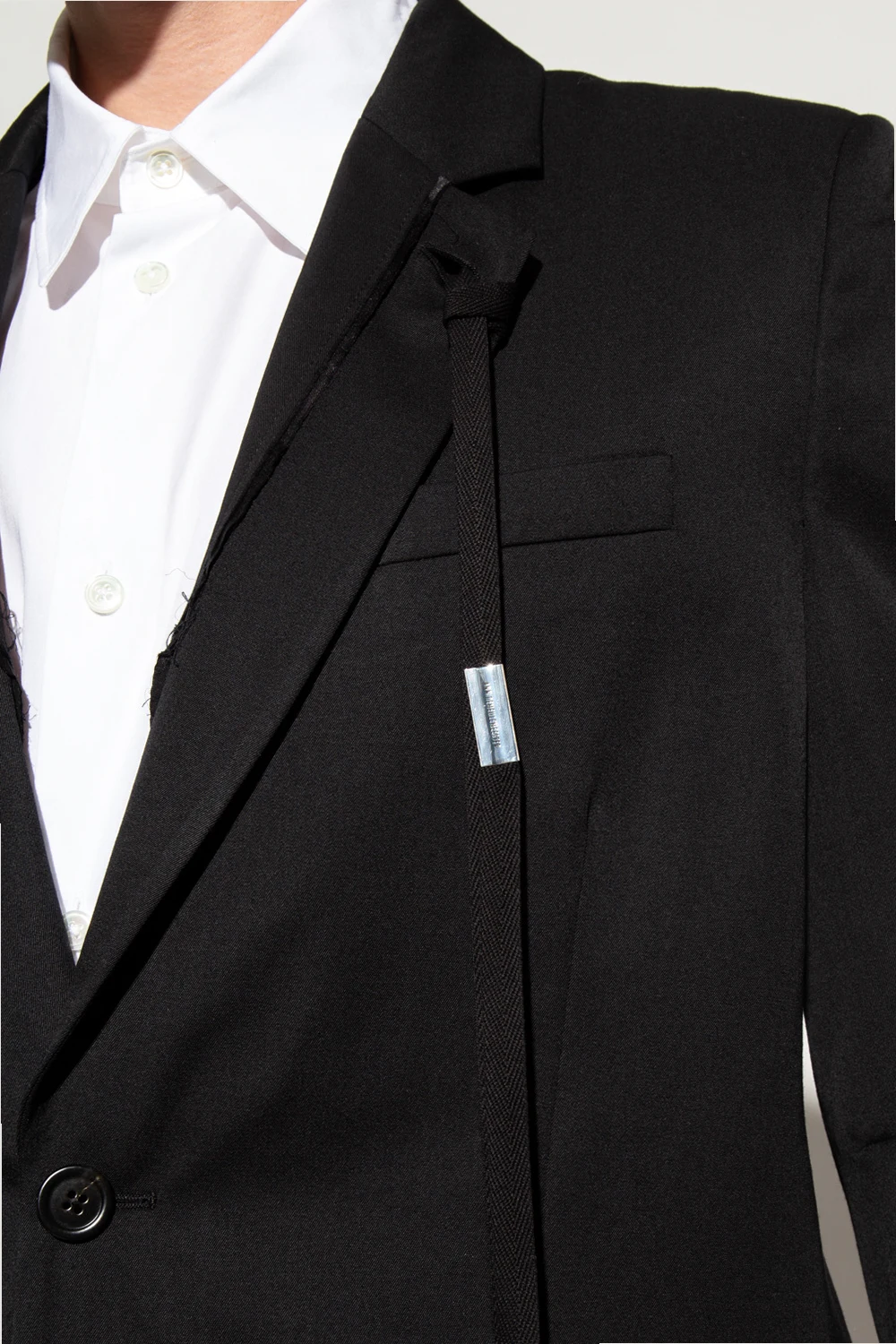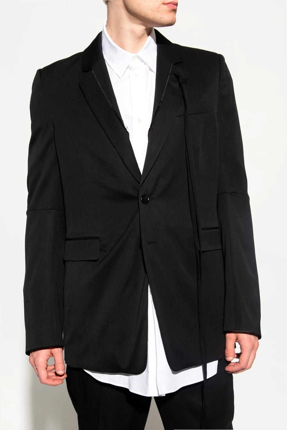 Black ‘Xaveer’ blazer from Ann Demeulemeester. Crafted from wool, this style features a double-button fastening, distinctive tapes with metal logo hardware on the front, two flapped pockets, notch lapels with silk inserts, a single back vent and long sleeves with button closures on the cuffs.