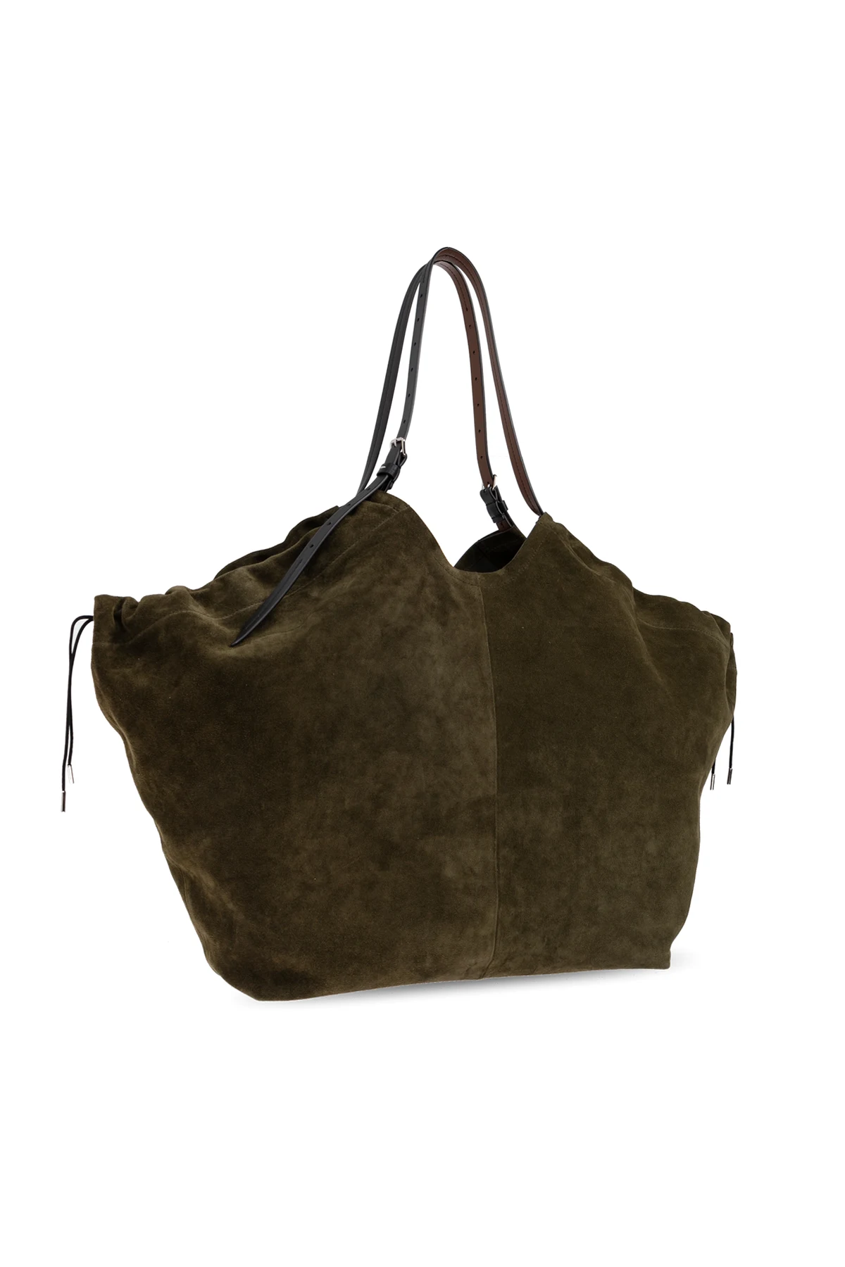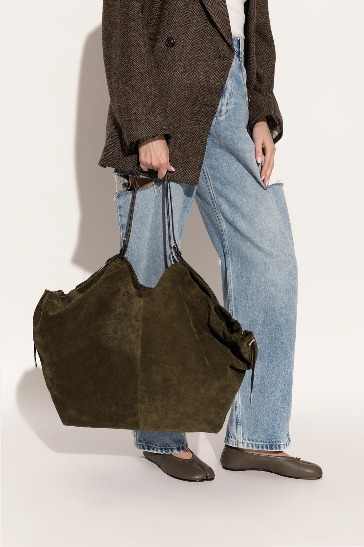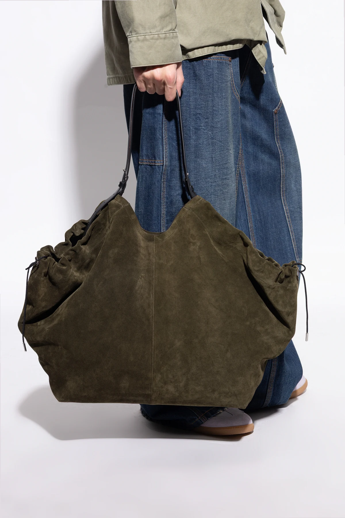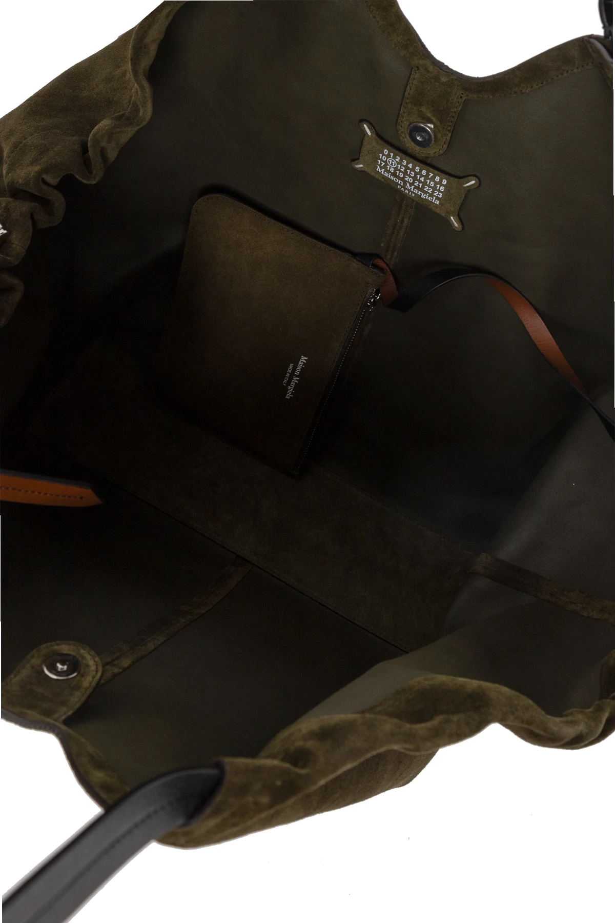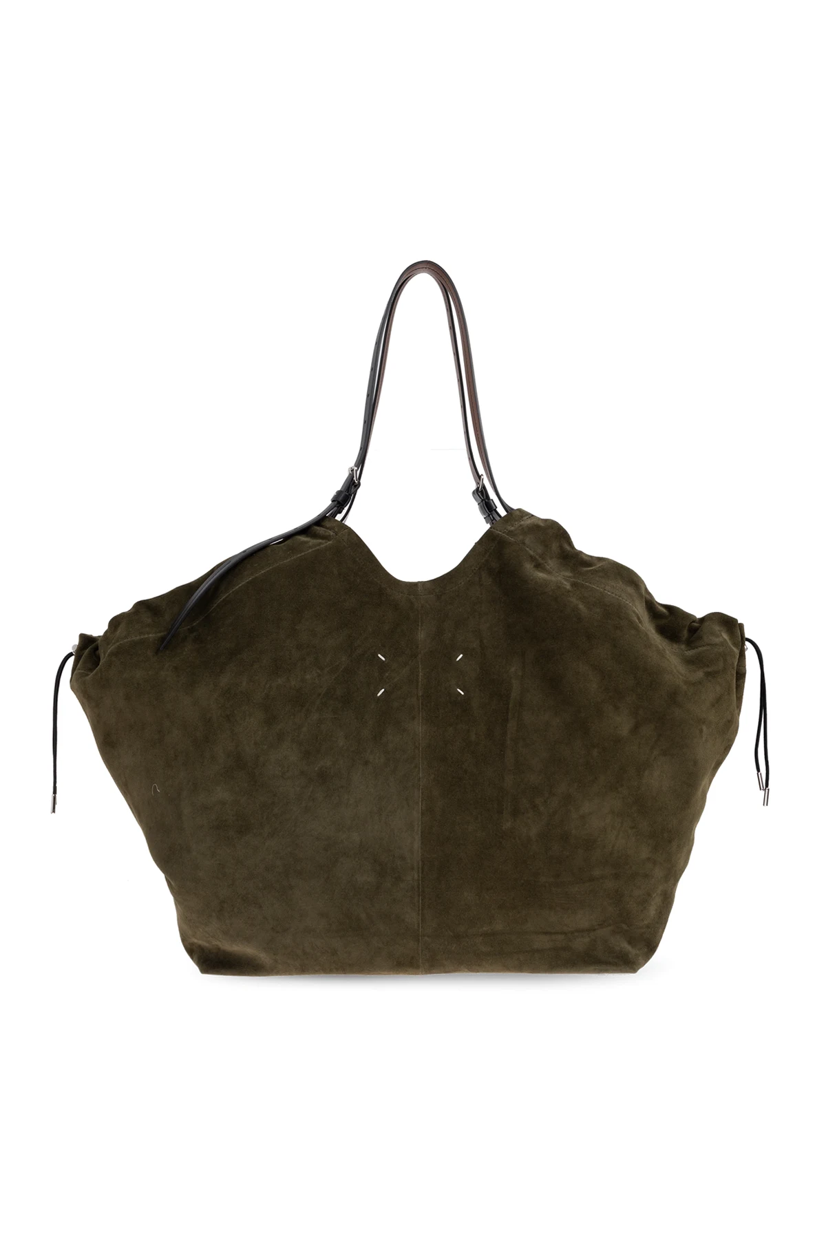 The Maison Margiela Suede Shopper Bag masterfully embodies the maison’s avant-garde sensibility with refined understatement. Crafted from sumptuous, high-quality suede, its tactile, velvety finish radiates exclusivity and sophistication. The distinctive trapezoidal silhouette, elegantly widened at the top with artful side “wings” and a gently undulating upper edge, evokes a sculptural yet minimalist allure. Cloaked in a deep, versatile khaki green, this shopper’s smooth, pattern-free surface showcases timeless luxury suitable for both men and women. Contrasting elongated leather handles provide architectural contrast and effortless comfort in carry. Maison Margiela’s unisex vision and signature attention to unexpected shapes make this bag a striking accessory that transcends fleeting trends. Why choose this product? Luxurious, full-grain suede with an exceptionally soft, supple texture Iconic Maison Margiela design—sculptural, deconstructed, and unmistakably modern Elegant, deep-green hue for versatile styling across seasons and wardrobes Contrasting, sleek leather handles offer durability and a contemporary touch Exclusively minimalist—unadorned by patterns or prints for a truly elevated look
