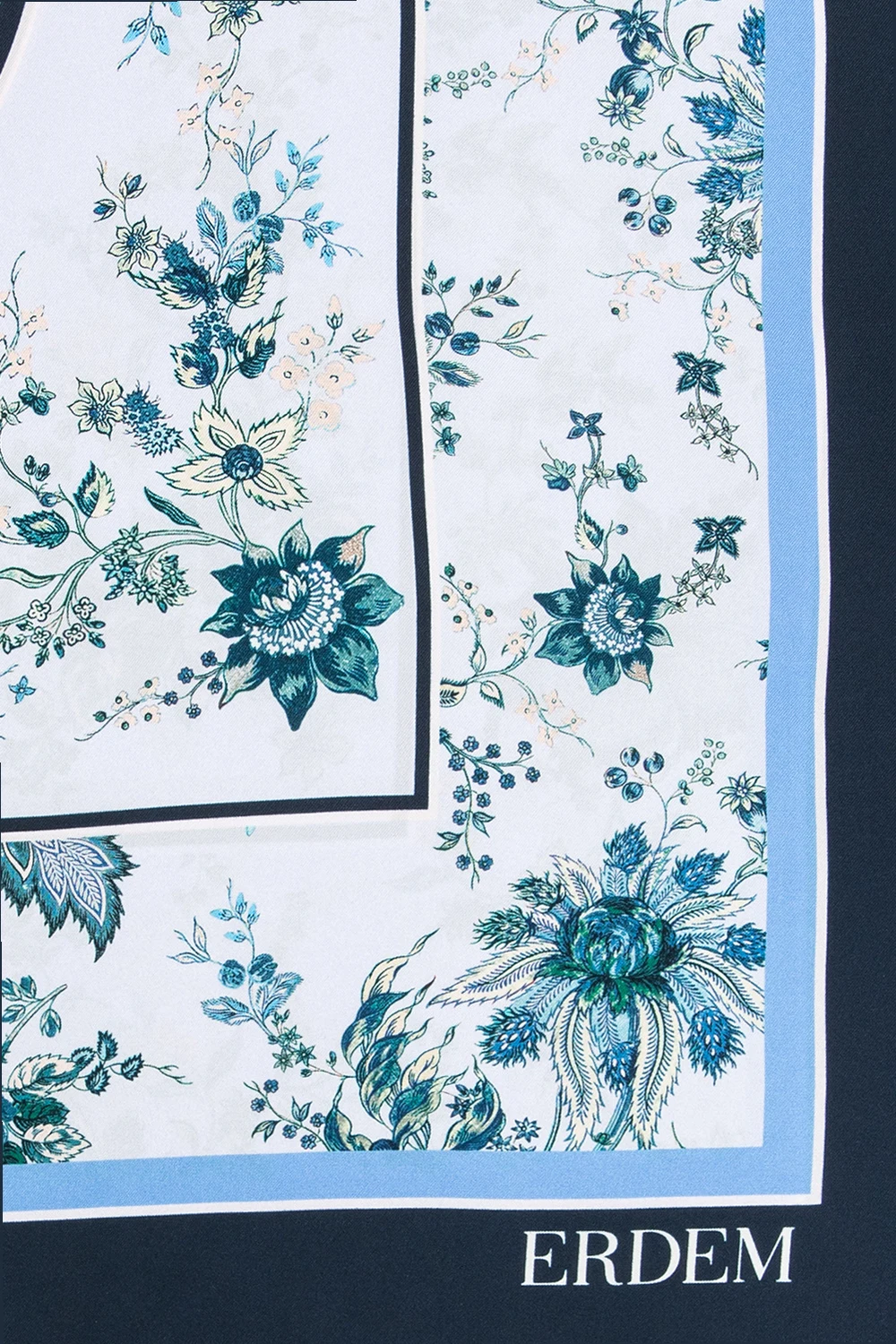 Light purple, blue and navy scarf from Erdem. Made of silk, this design is enriched by a multicolored floral motif and a white logo print.