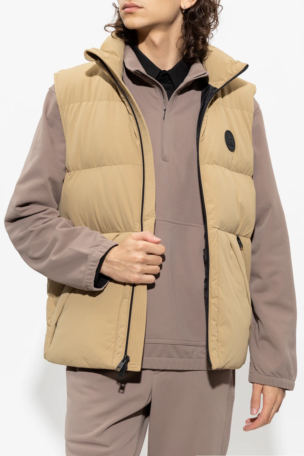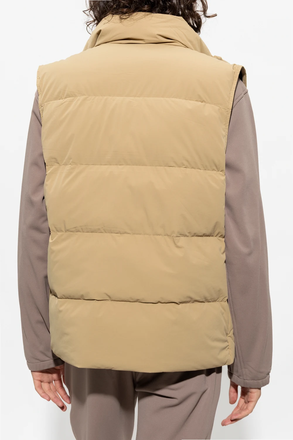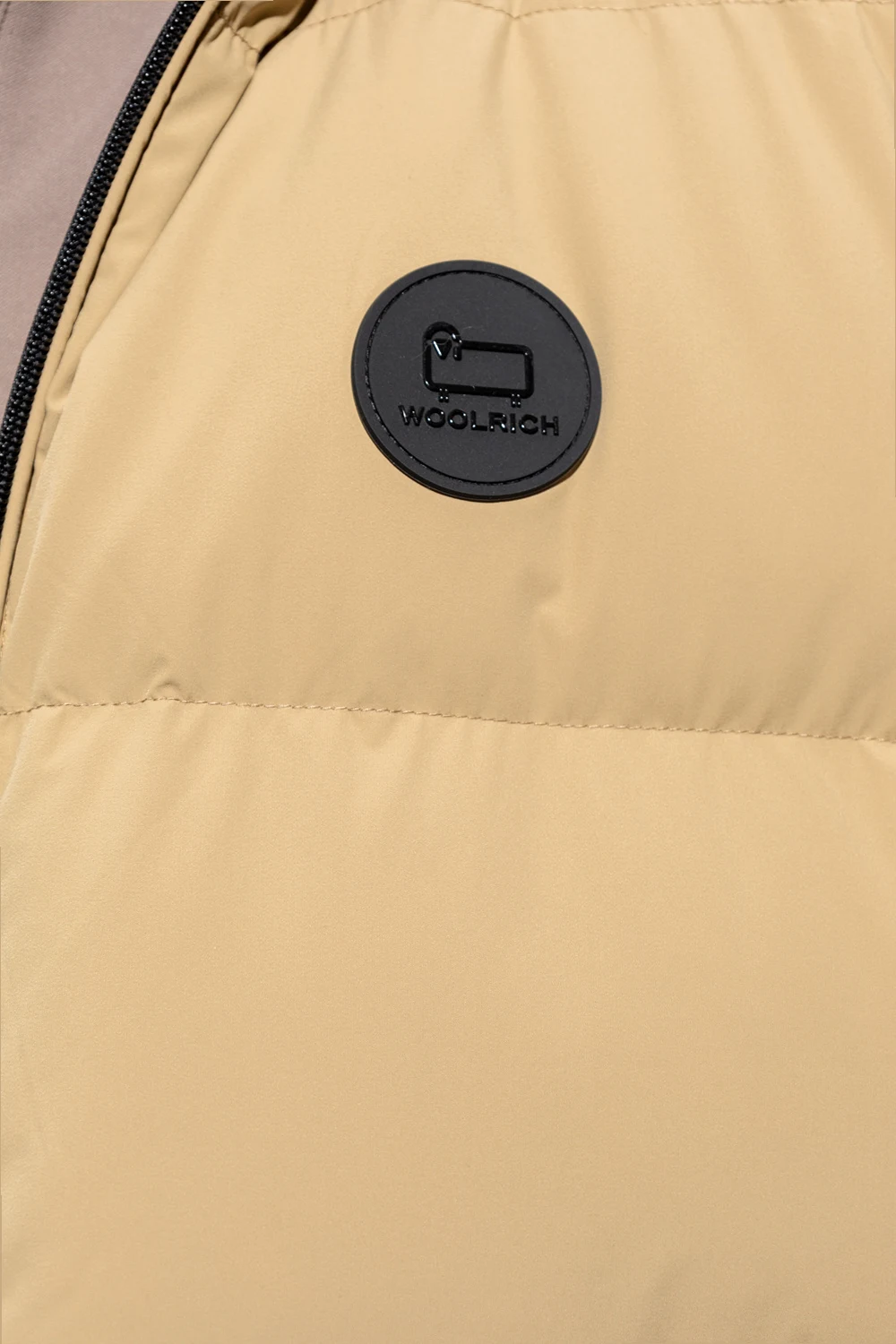 Beige vest with a standing collar from Woolrich. Insulated with RDS-certified down, this style features a two-way zipper, two zip pockets, a black rubber logo patch on the front and a drawcord-adjustable hem.
