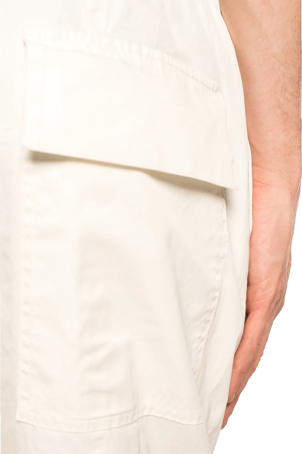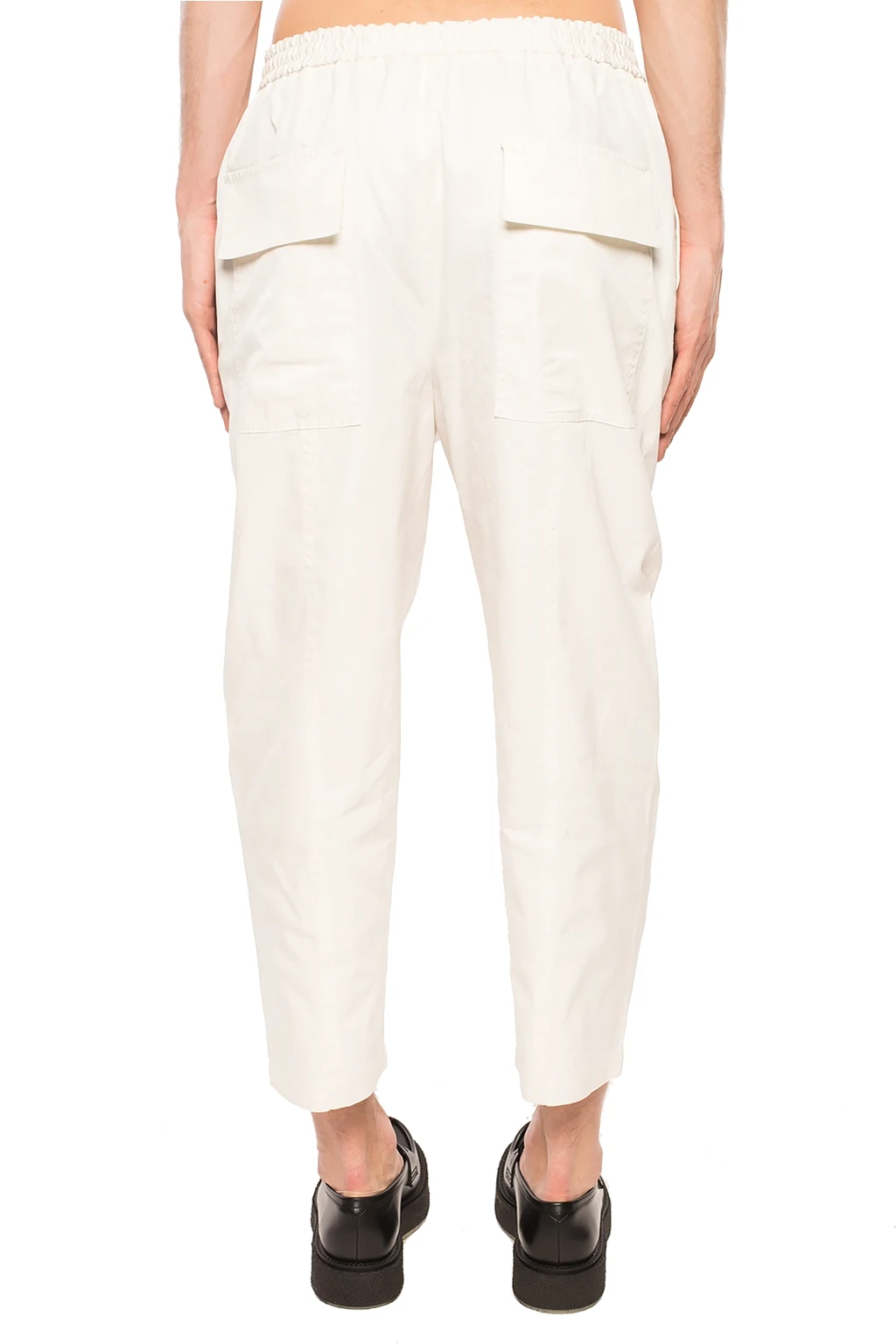 Cream trousers from Jil Sander. Made of cotton. Drawstring waist. Two slip pockets on the front, two flap pockets at the back. Tapered legs.