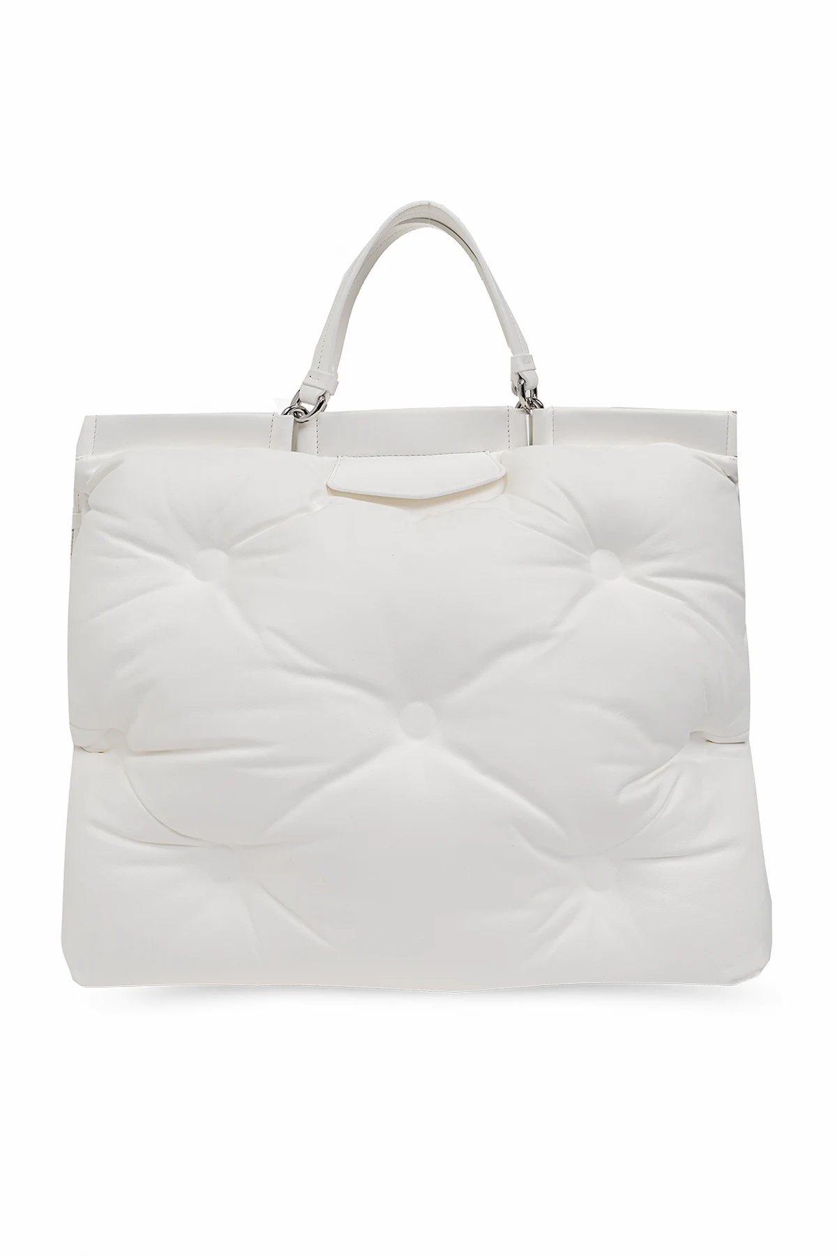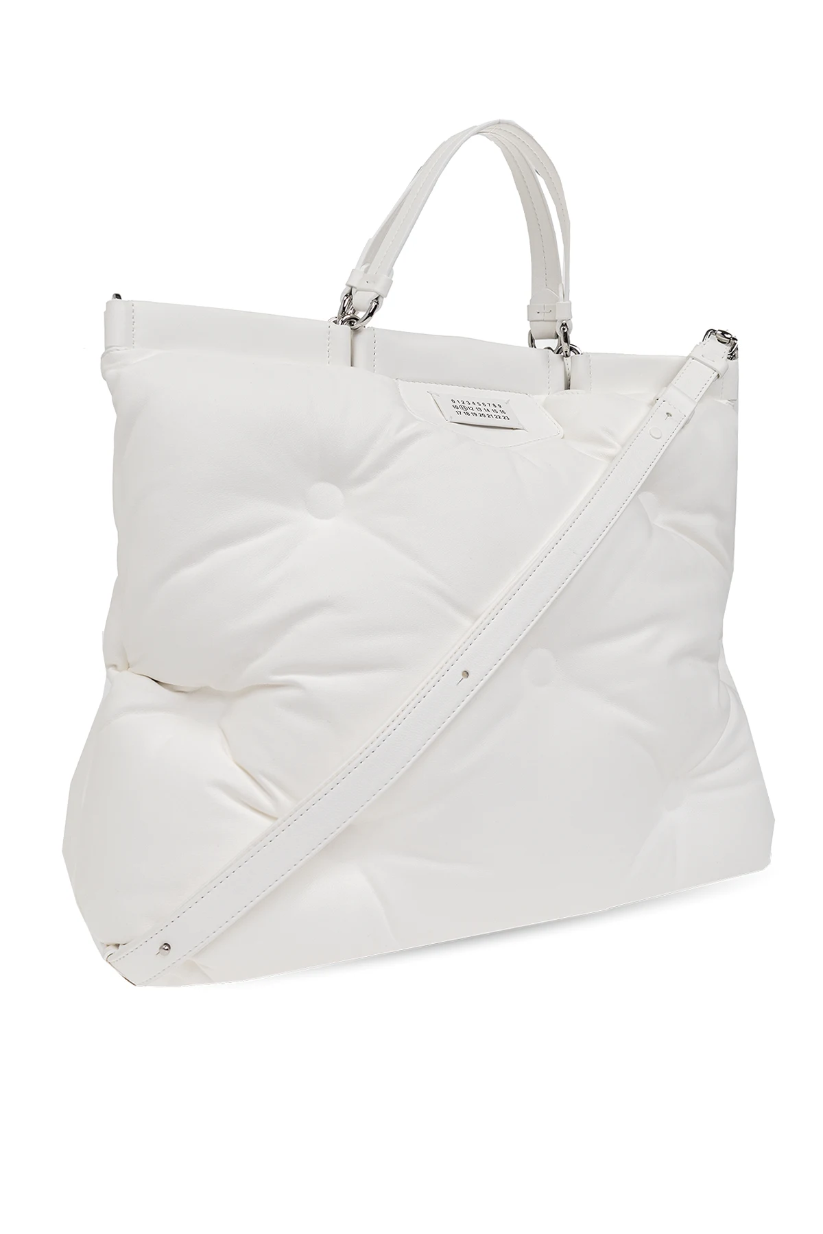 White ‘Glam Slam Shopper Large’ shopper bag from Maison Margiela. Crafted from quilted leather, this design secures with a magnetic fastener and features a signature logo patch on the front. It is complete with a detachable and adjustable shoulder strap, two half-round handles, silver-tone metal hardware and one internal compartment with a zip pocket.