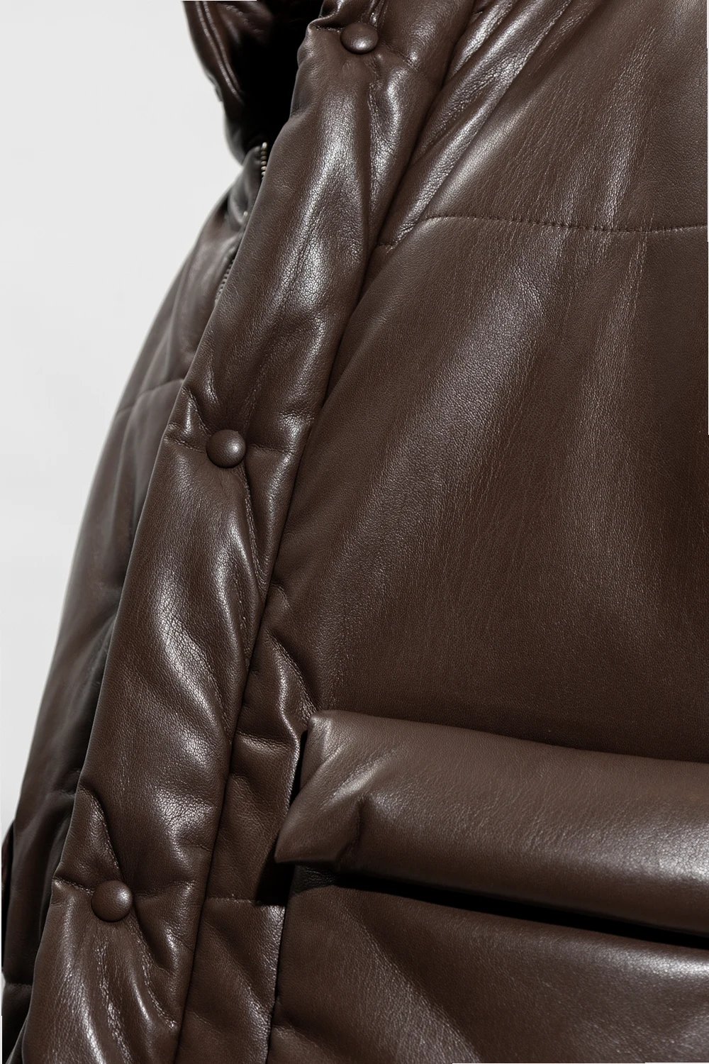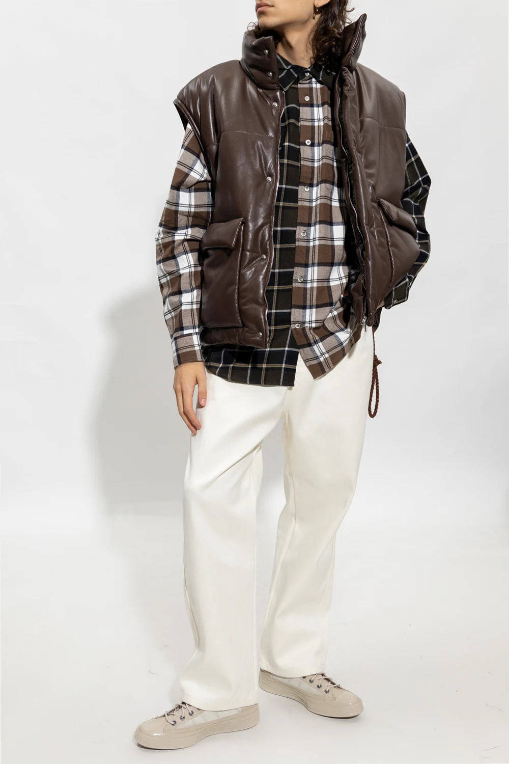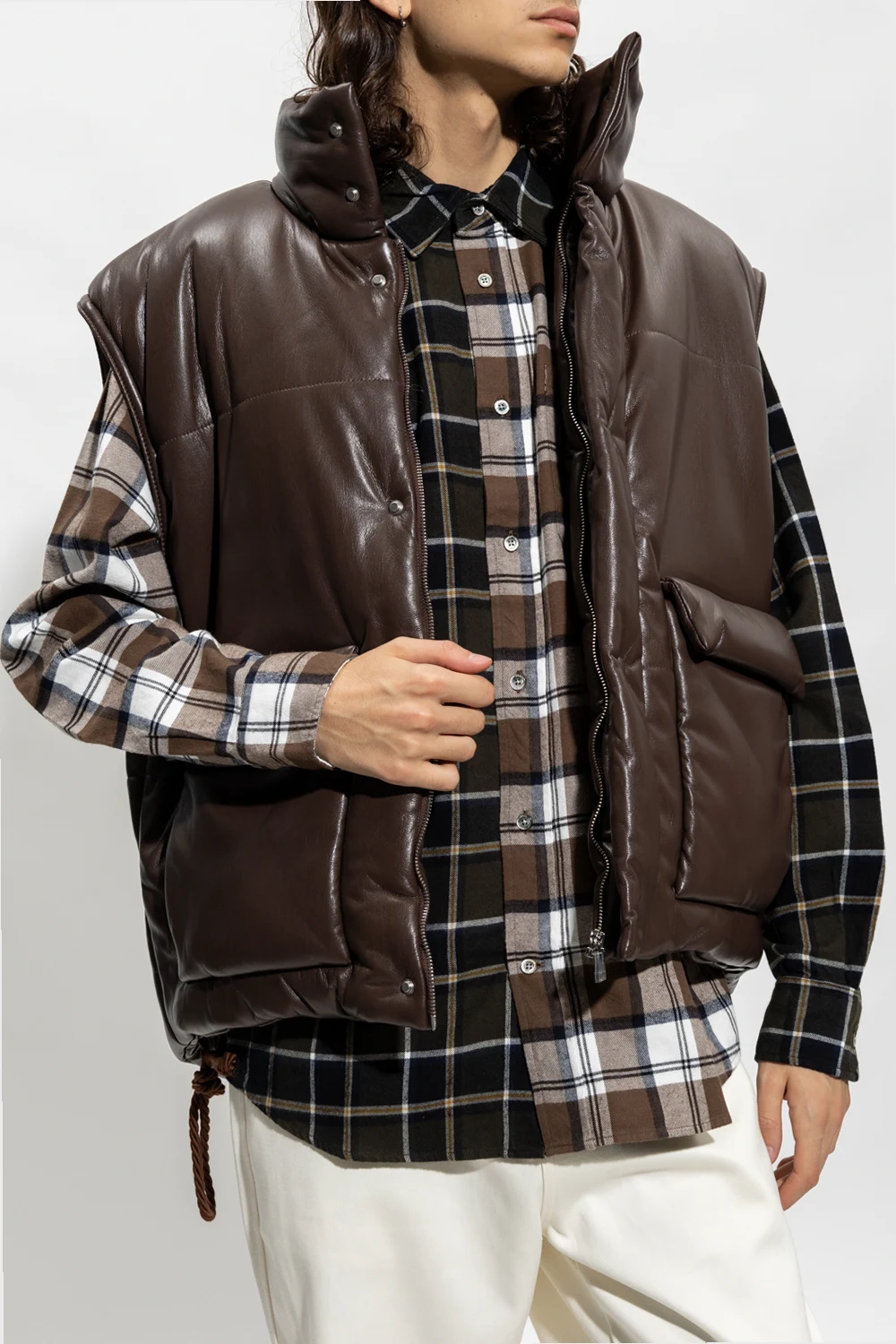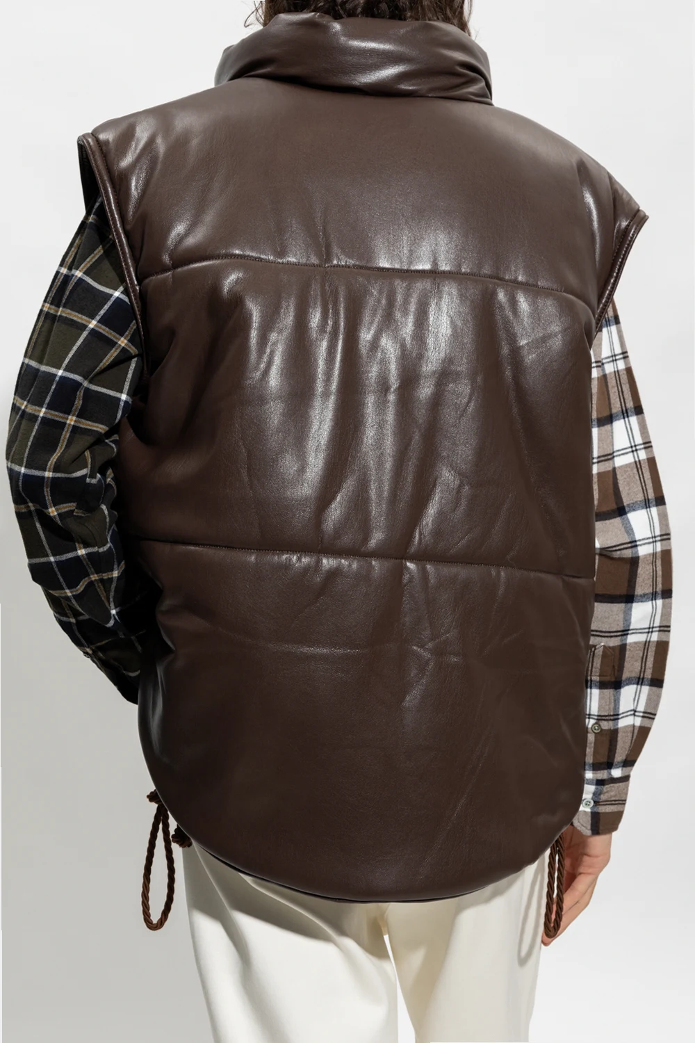 Dark brown ‘Jovan’ vest from Nanushka. Crafted from vegan leather, this garment features a stand collar, zip and snap fastenings, two snap-fastened flap pockets, two slip pockets and drawstrings on the sides.