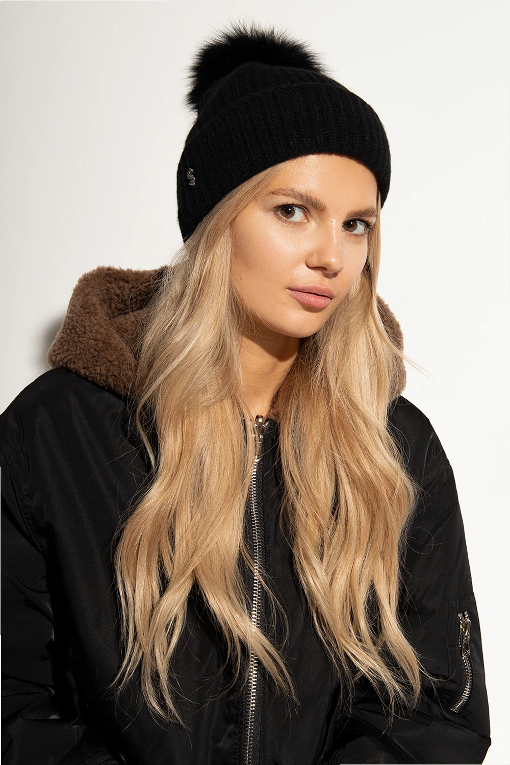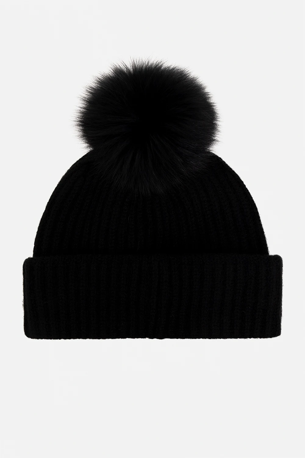 Black ribbed beanie with a logo appliqué and fur pom-pom from Yves Salomon.