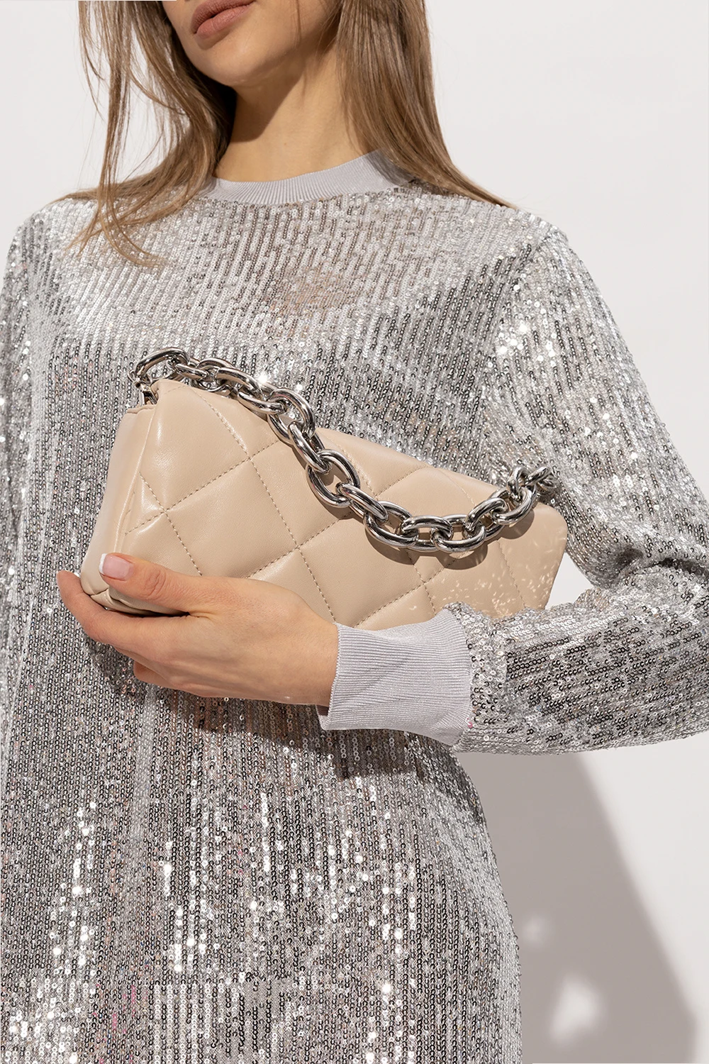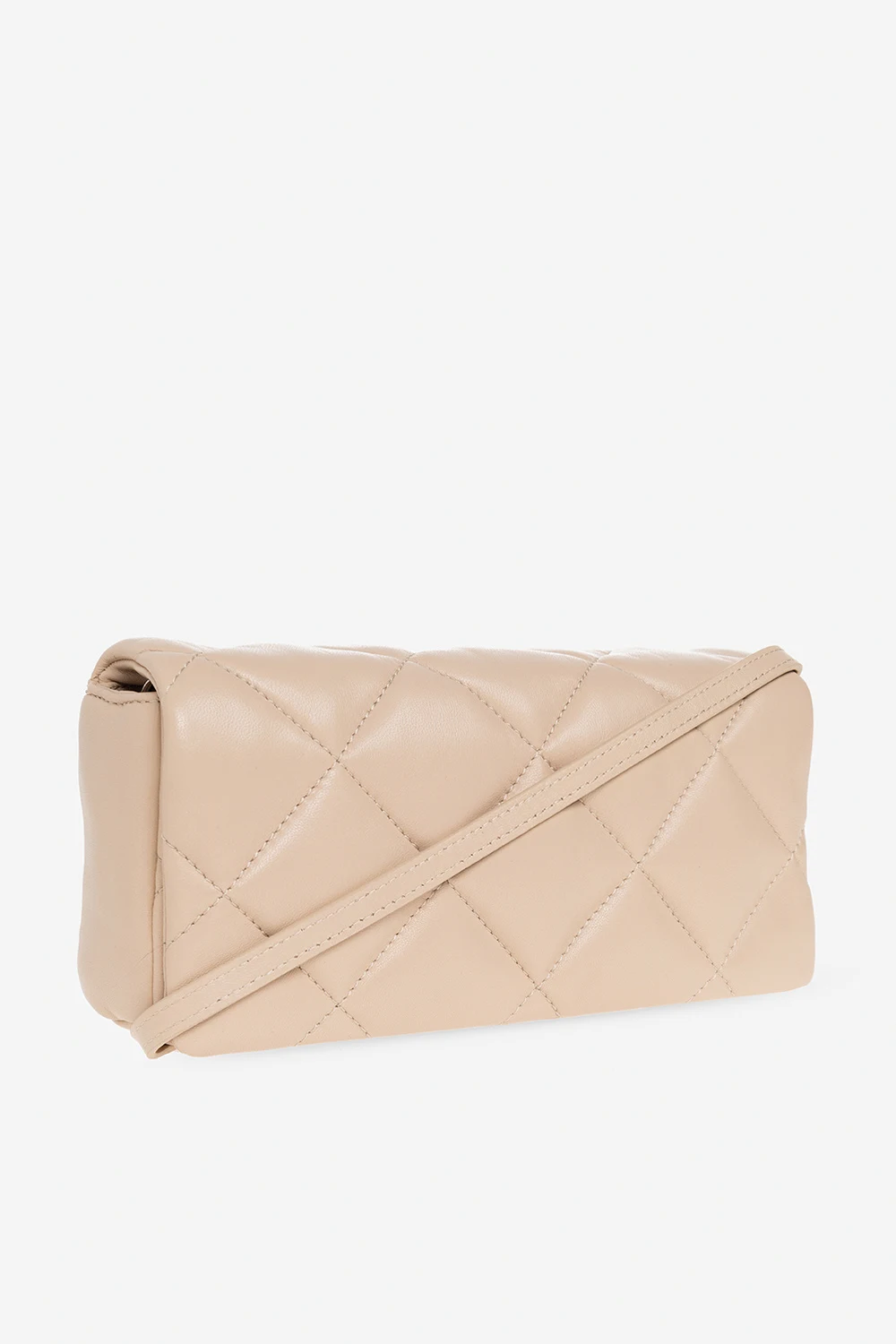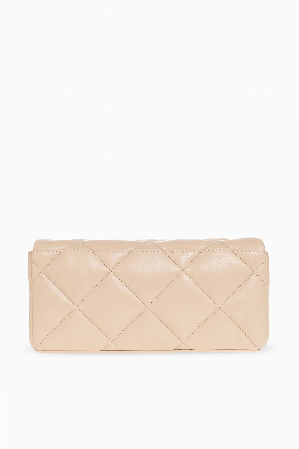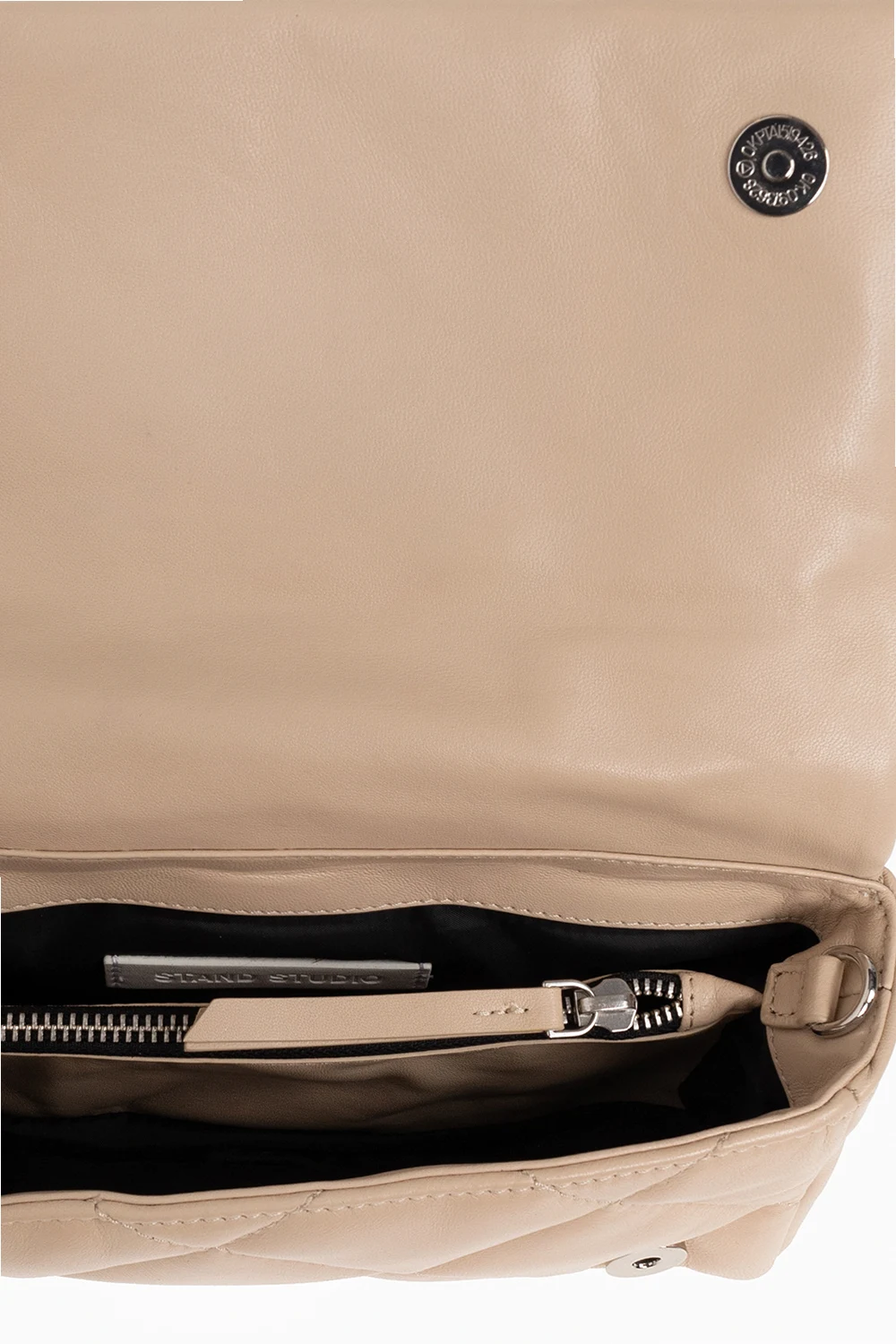 Light beige ‘Hery’ quilted shoulder bag from Stand Studio. Crafted from lamb leather, this model secures with a magnetic snap and is complete with a half-round chain handle, detachable, adjustable strap, silver-tone metal hardware and two separate internal compartments with one zip pocket.