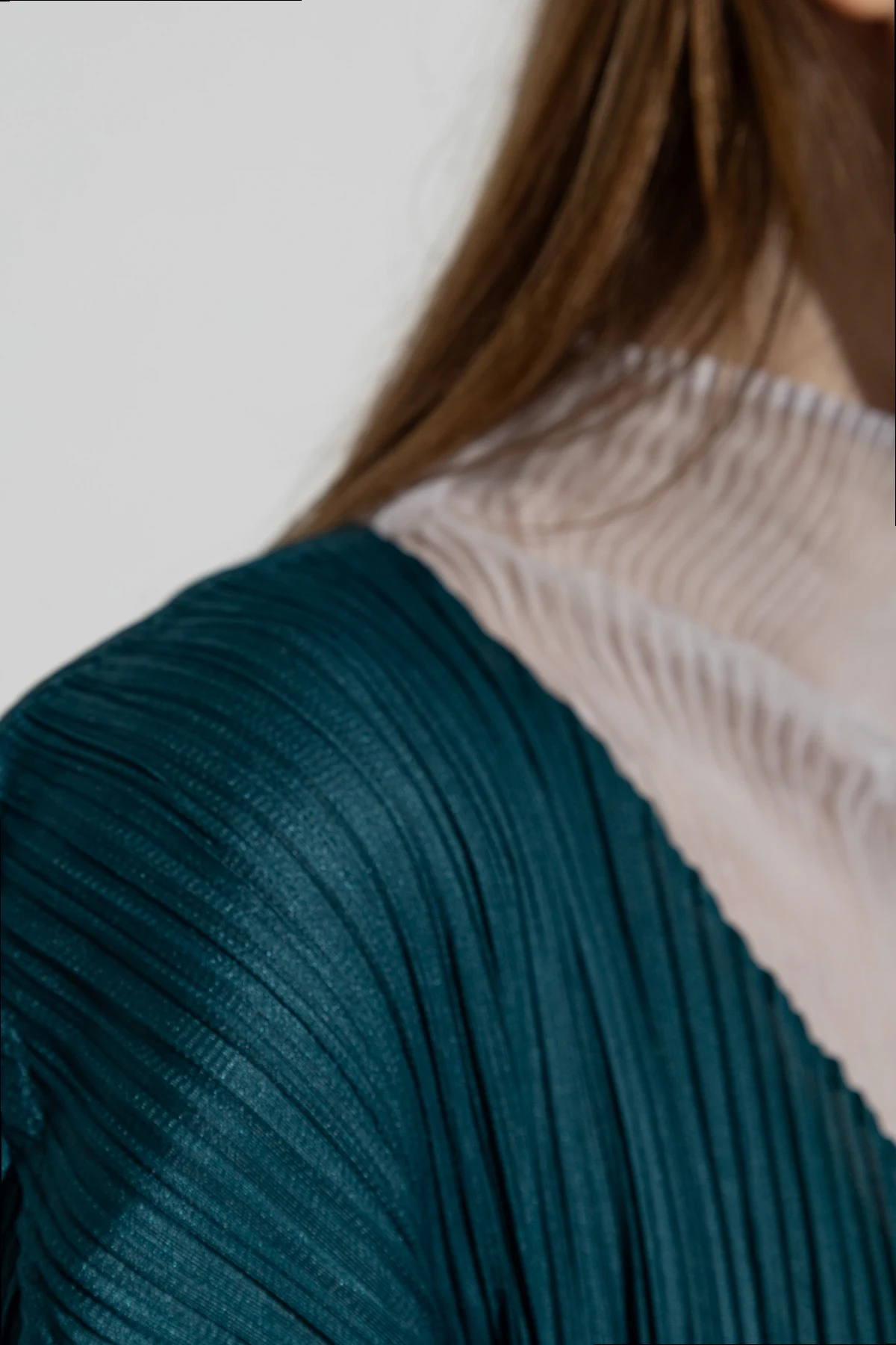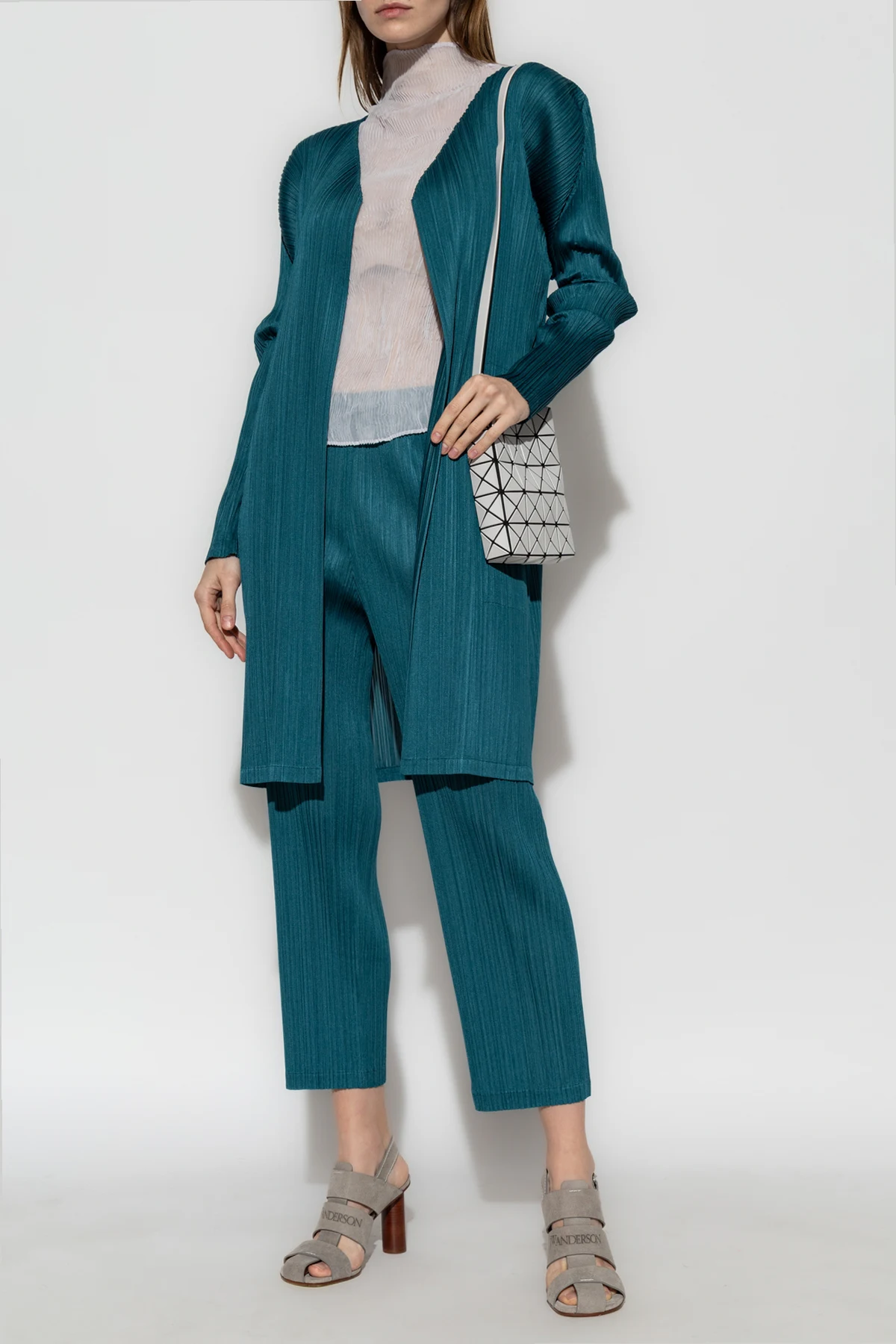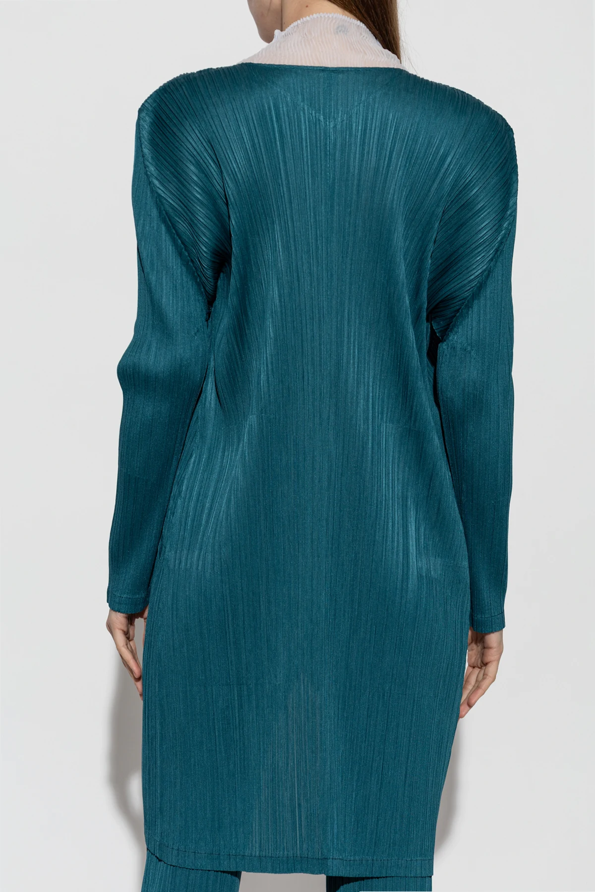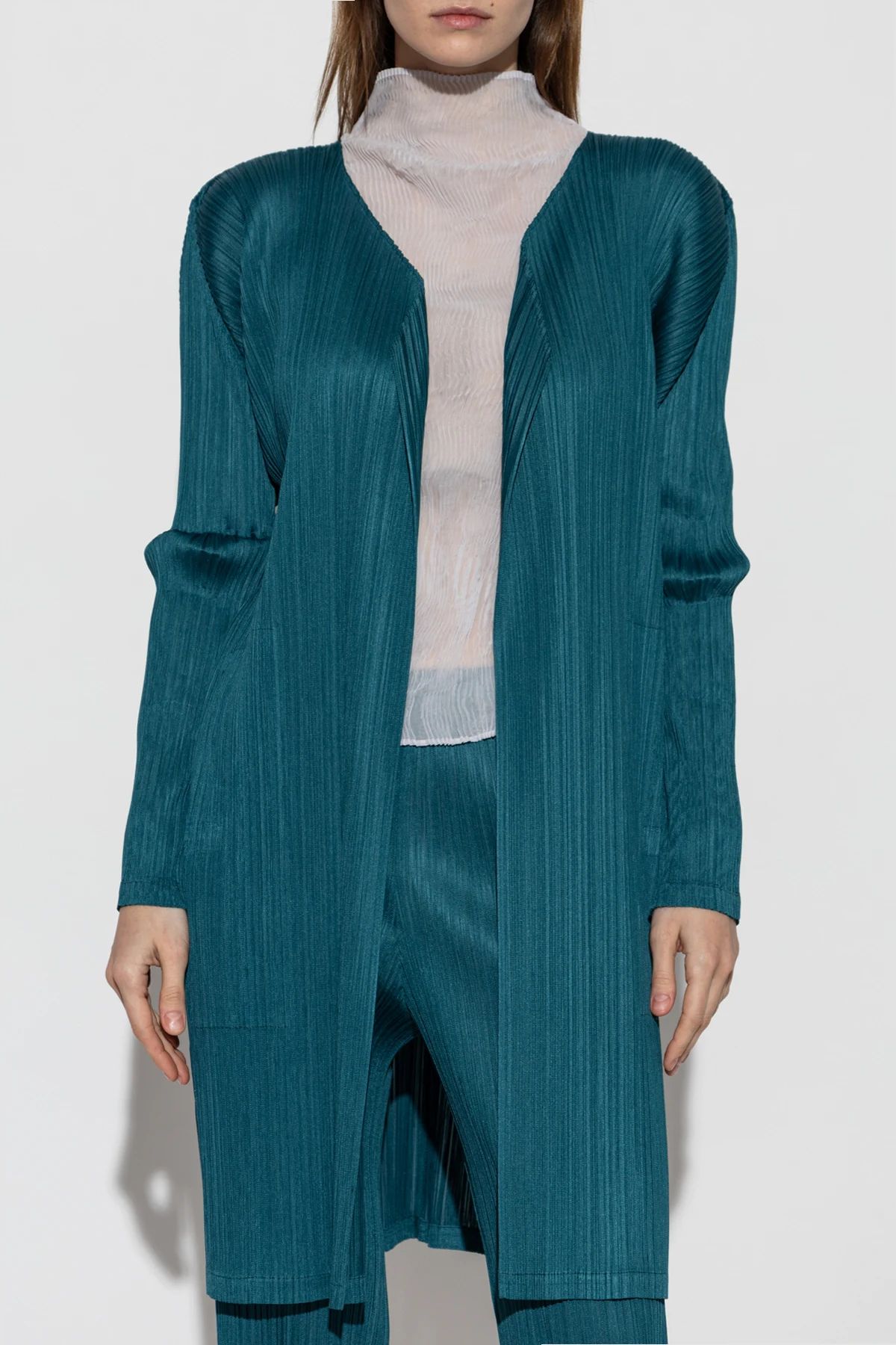 Introducing the Pleated Coat from the exclusive collection by Pleats Please Issey Miyake. This sartorial masterpiece, in a captivating shade of green, epitomizes the fusion of traditional Japanese craftsmanship and contemporary tailoring, curated by the creative genius Satoshi Kondo. Crafted from luxurious polyester, the coat boasts a pleated fabric that infuses structure and elegance into its minimalist silhouette. With a sleek, open-front design devoid of closures, and long sleeves, it offers unparalleled sophistication. The knee-length cut enhances its timeless appeal, making it a versatile addition to any wardrobe. Why Choose This Product? Iconic design from a renowned Japanese label. Exquisite pleated texture for a sculptural effect. Minimalist elegance with a modern edge. Versatile knee-length style.