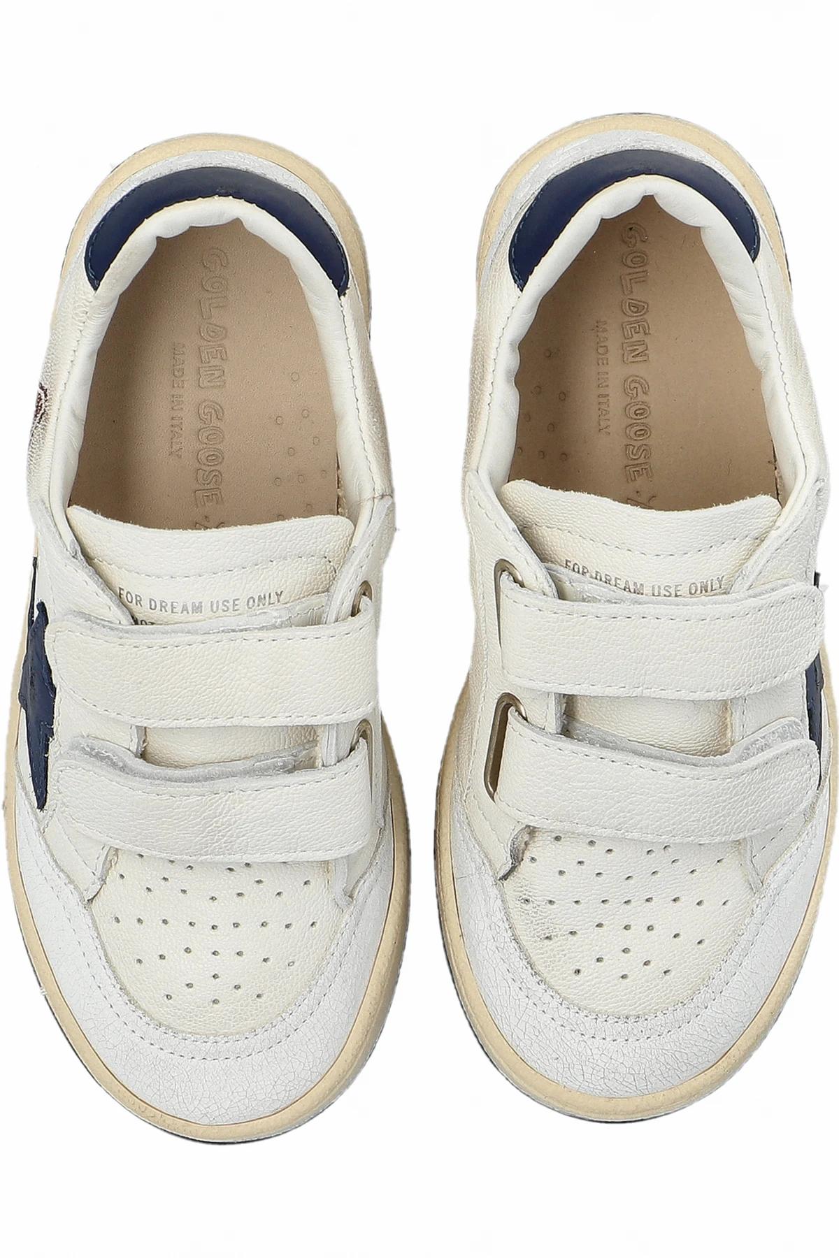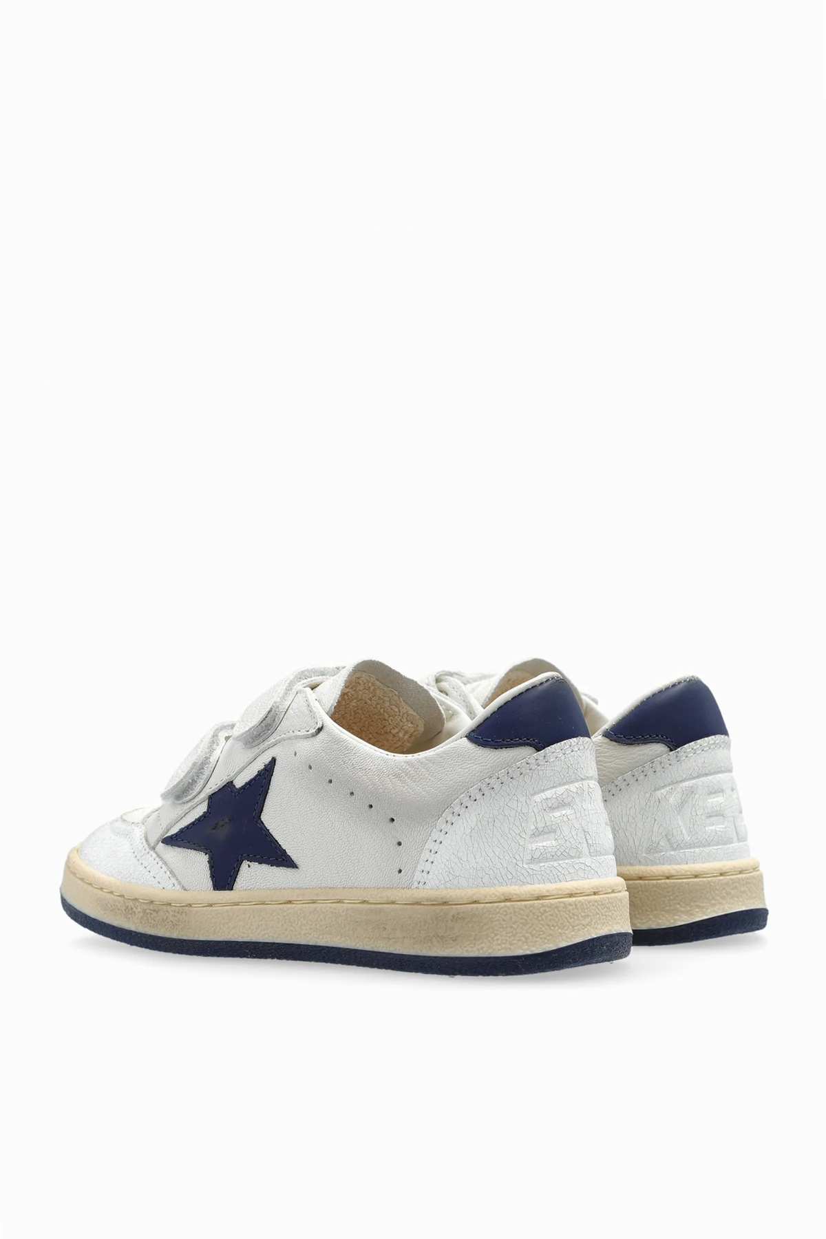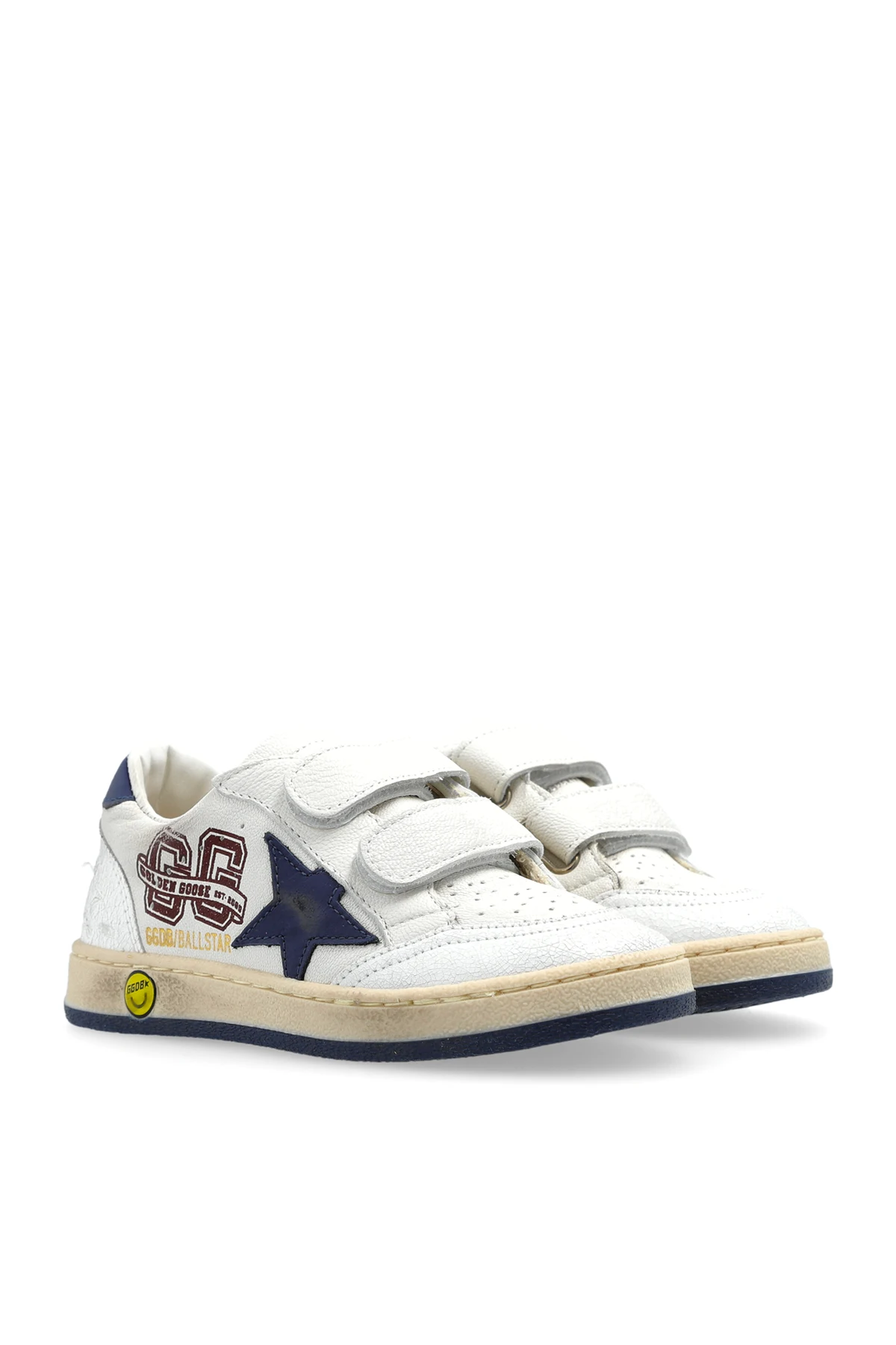Introducing the Ball Star sneakers from the esteemed Golden Goose Kids collection, where elegance meets playful sophistication. These children\'s sports shoes boast a pristine white leather upper, accentuated by a distinctive dark navy star and the stylishly emblazoned \"GG\" in rich maroon. The timeless design is further enhanced by a unique distressed effect, a hallmark of Golden Goose\'s artisanal craftsmanship. Featuring dual velcro straps for effortless wear, these sneakers prioritize both style and convenience. The perforated front ensures breathability, while the cushioned interior promises unparalleled comfort. A beige sole with a darker base is playfully adorned with a yellow smiley face detail, adding a whimsical touch to this luxurious footwear. Dlaczego warto kupić ten produkt? Effortless Elegance: Crafted from premium leather with a sophisticated distressed finish. Comfort and Convenience: Easy velcro closure and soft interior lining. Iconic Design: Distinctive navy star and maroon \"GG\" logo. Unique Details: Playful yellow smiley on the sole. Renowned Brand: From the luxurious Italian brand, Golden Goose.