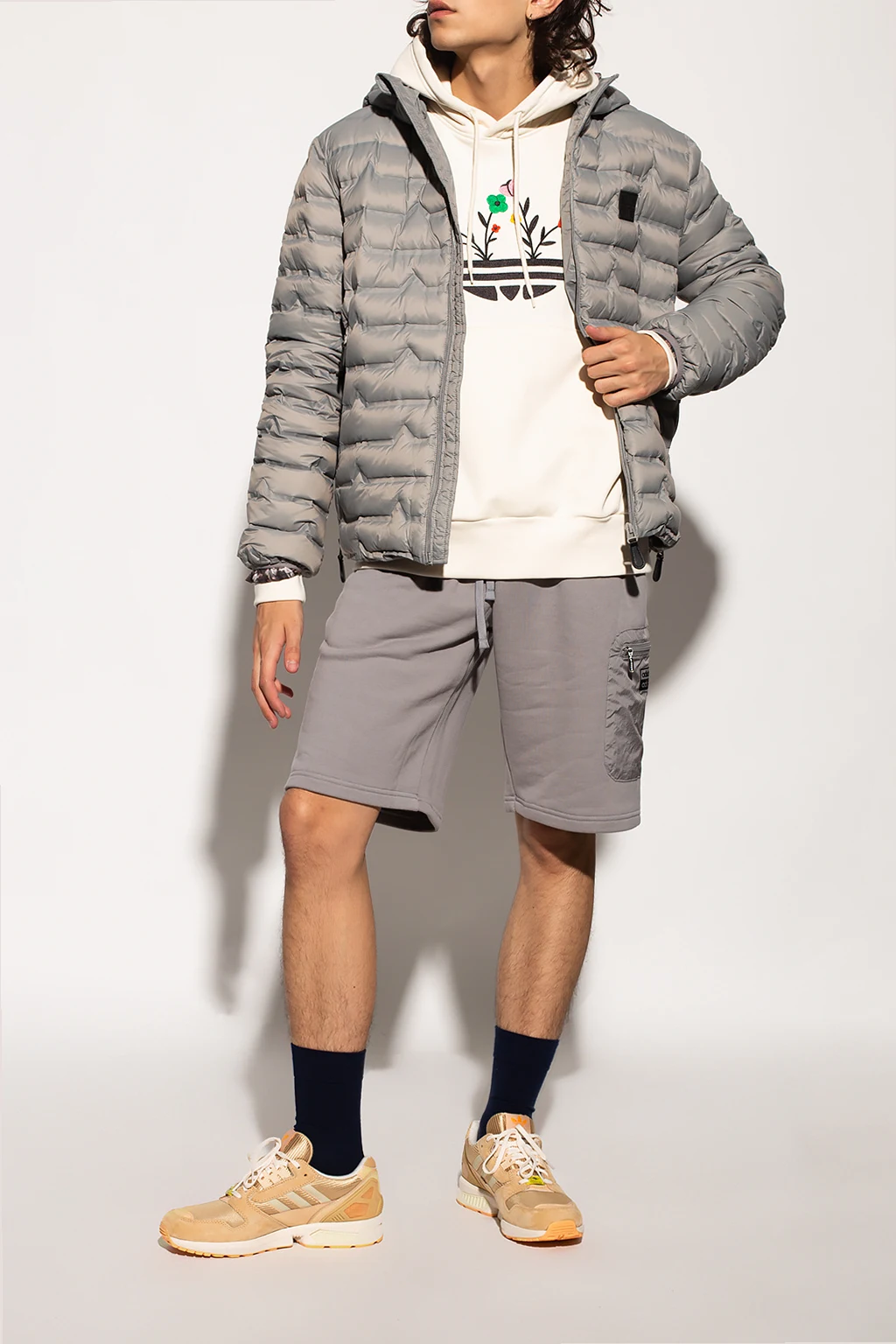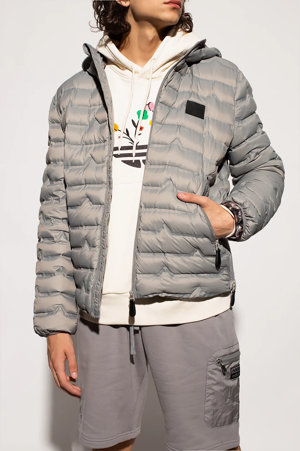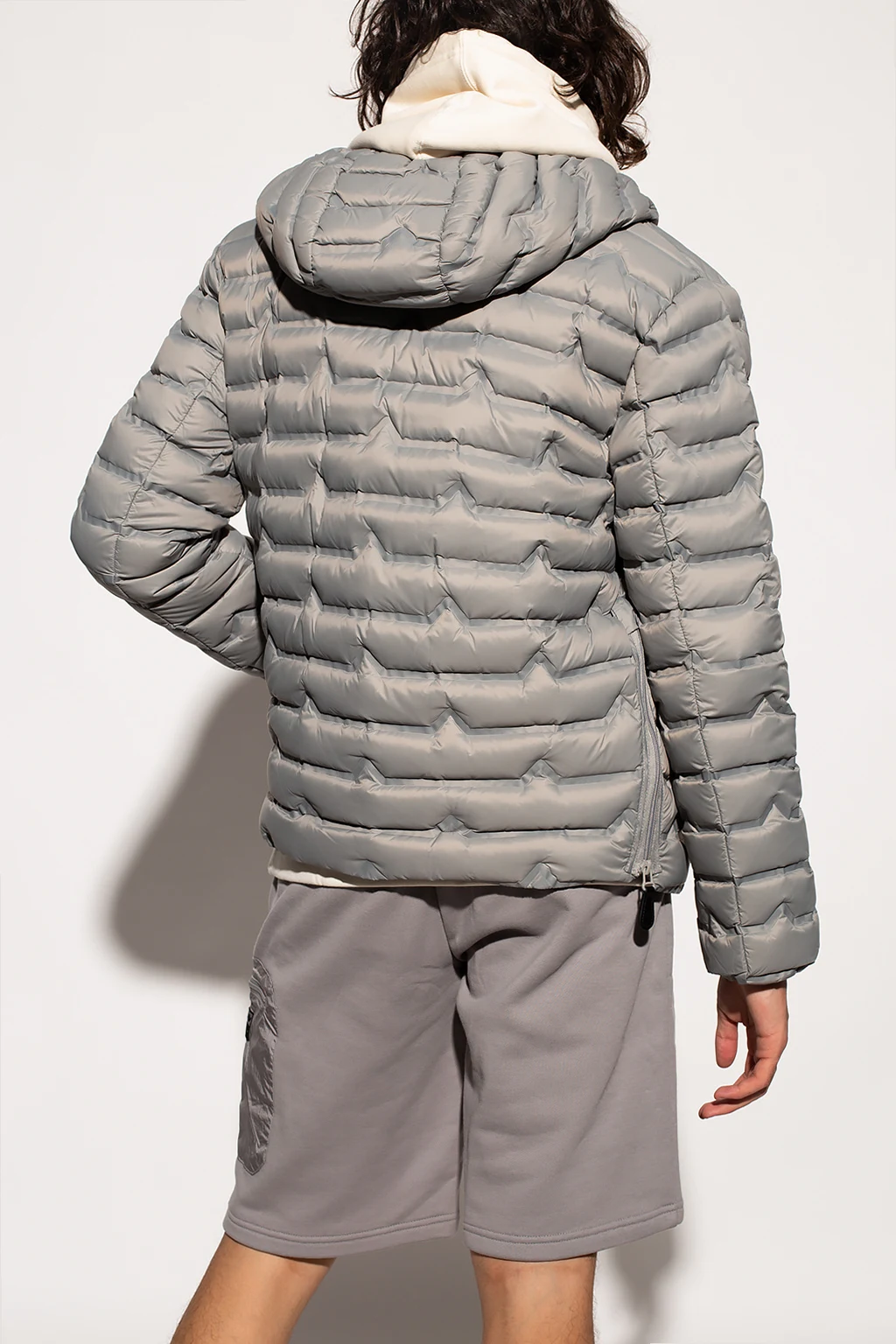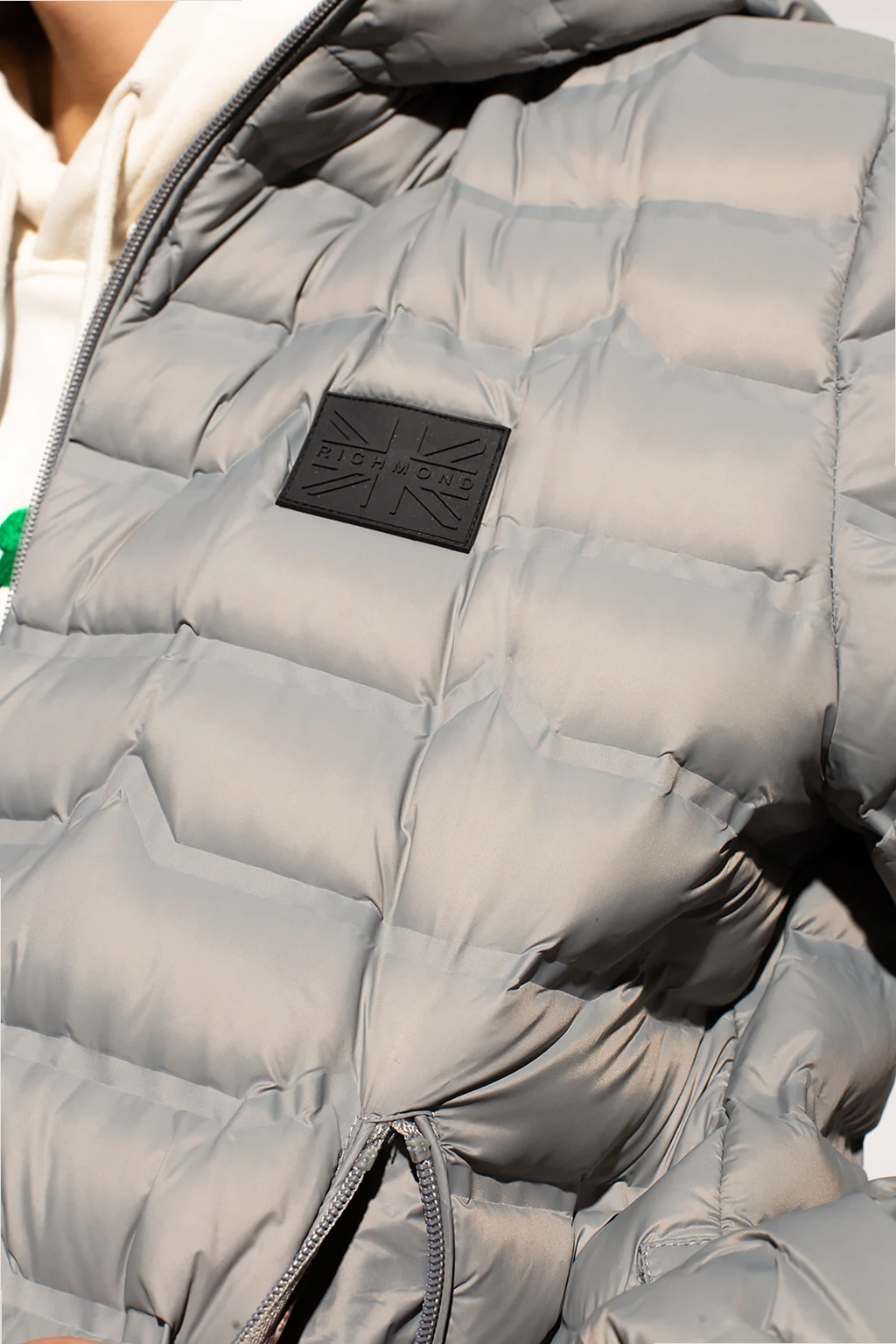 Light grey quilted down jacket with a hood from John Richmond. Emblazoned with a black, tactile logo appliqué, this style features zip closures, two zipped pockets on the front and long sleeves with elasticated cuffs.