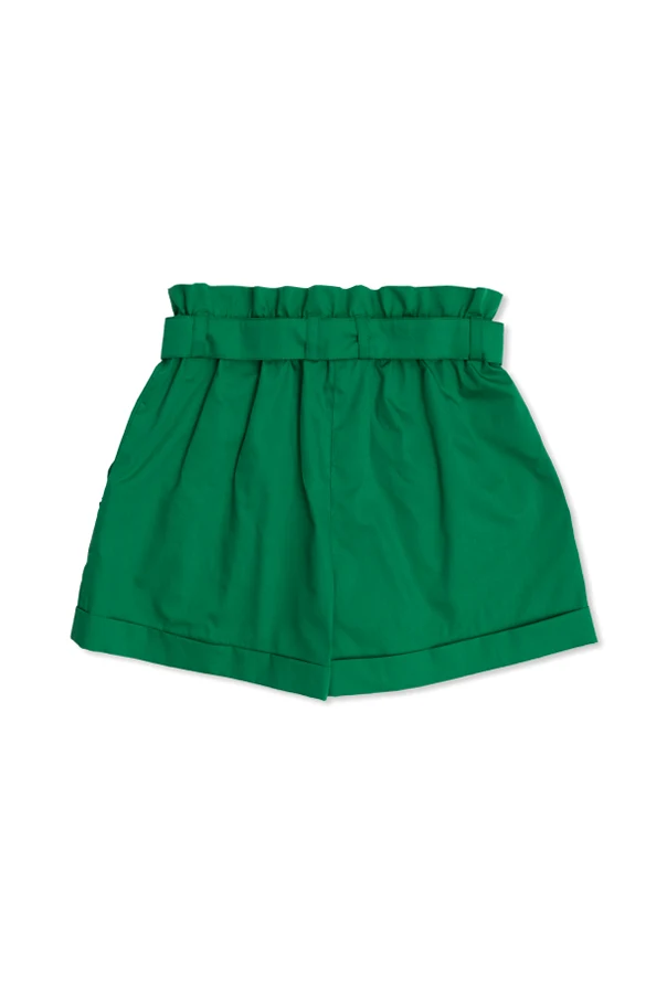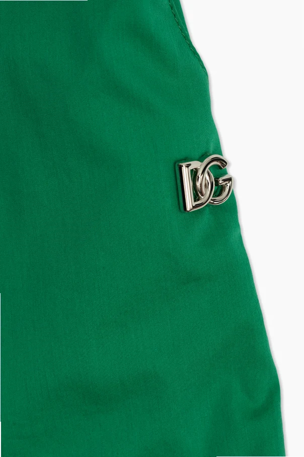Introducing the Dolce & Gabbana Kids Logo Shorts , a distinguished addition to any young fashionista's wardrobe. Crafted from a sumptuous blend of cotton and silk, these shorts boast an exquisite texture that speaks to the high standards of elite fashion. Cloaked in a vibrant green hue, they exude a fresh, trendy allure.