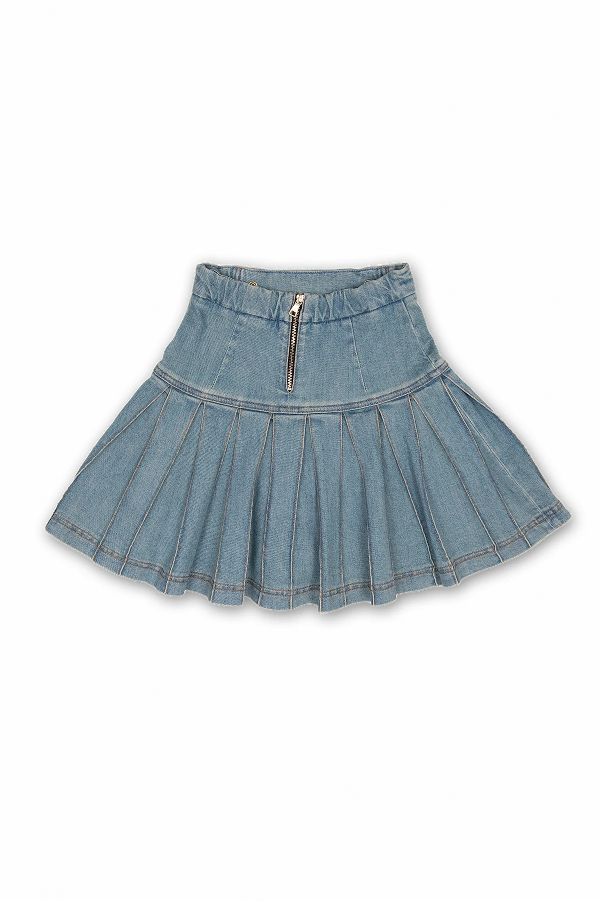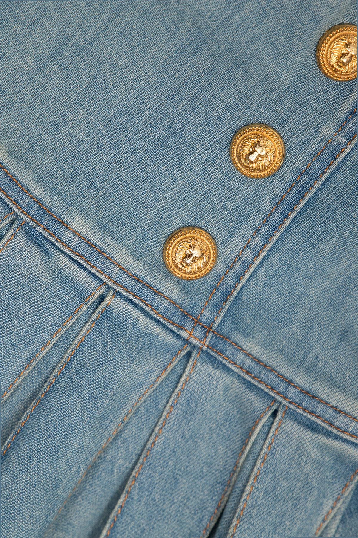 Blue denim skirt with pleats from Balmain Kids. Fastened at back with a zipper, this style has beige stitching details and decorative gold-tone buttons featuring the brand\'s signature lion\'s head.