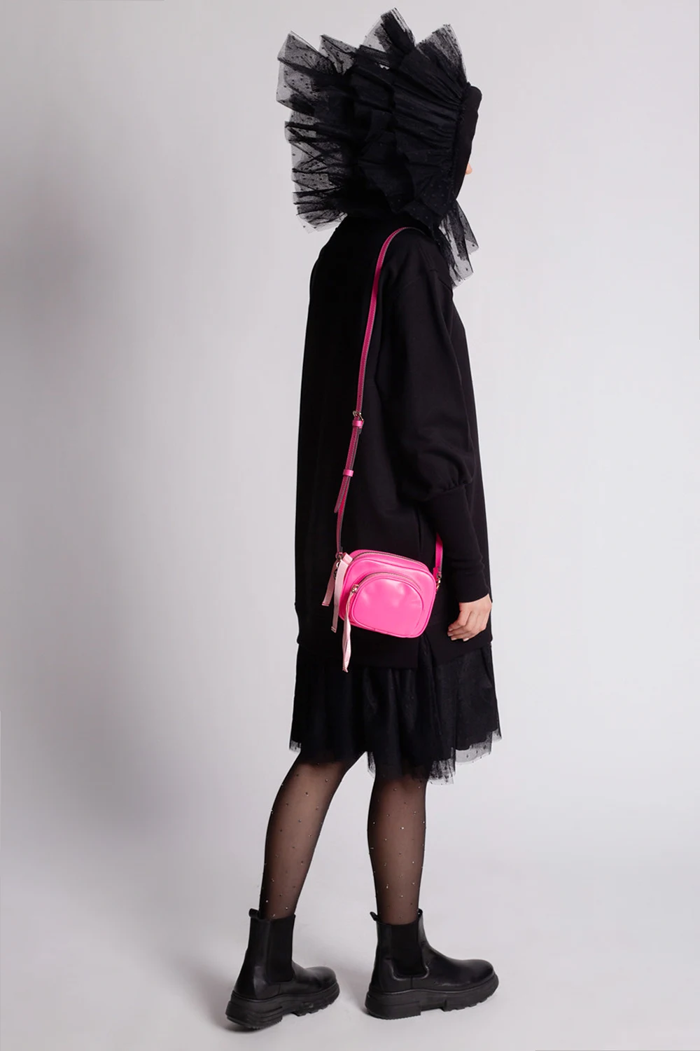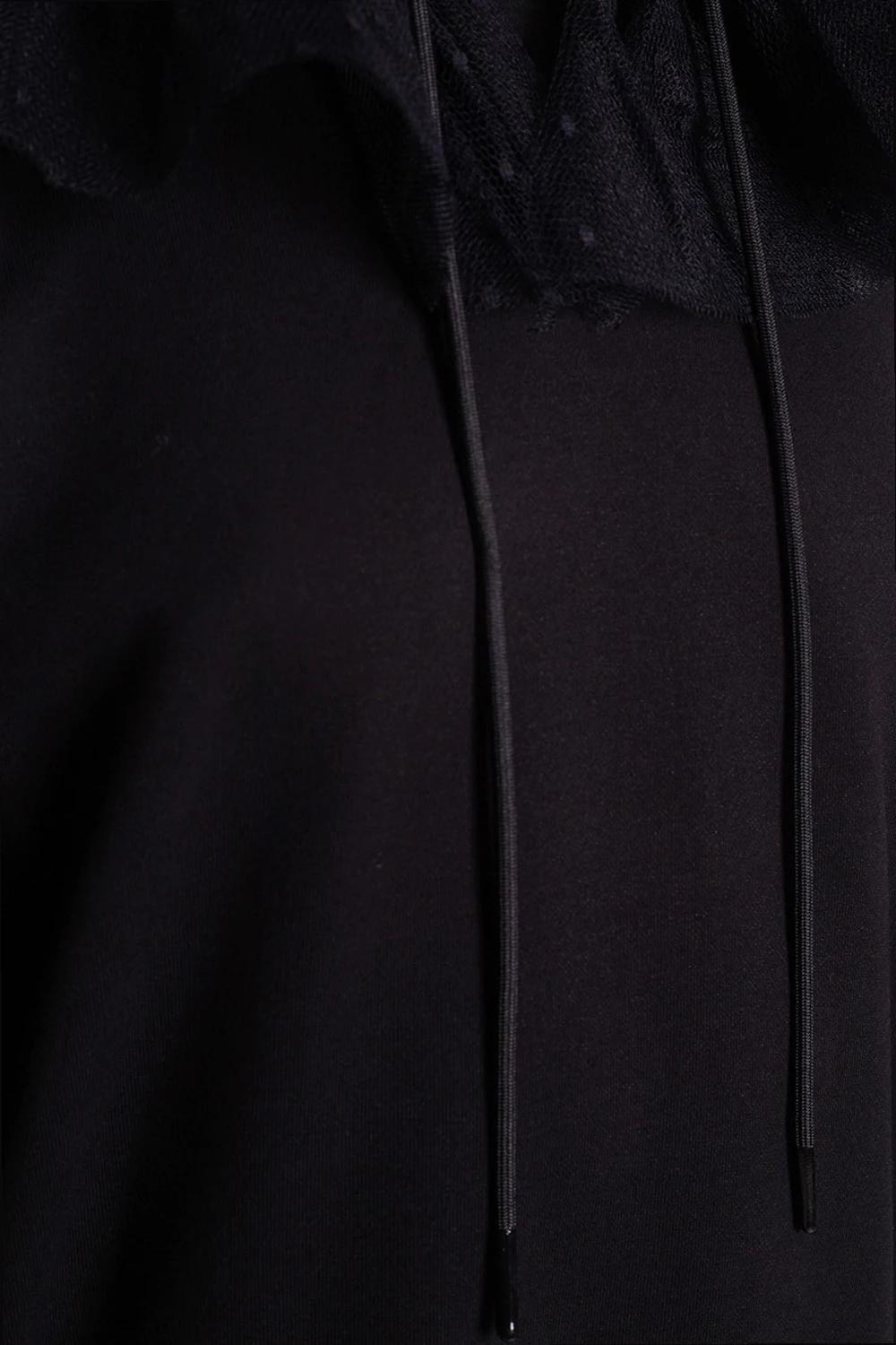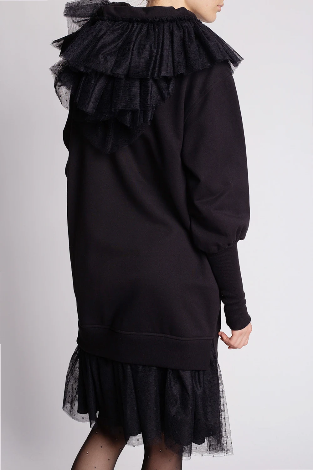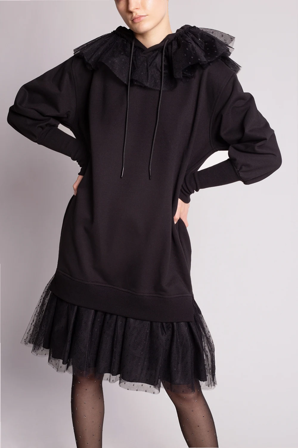 Black dress from Red Valentino. Made of cotton, this design features tulle trims, a drawstring hood, side pockets and long sleeves with ribbed cuffs.