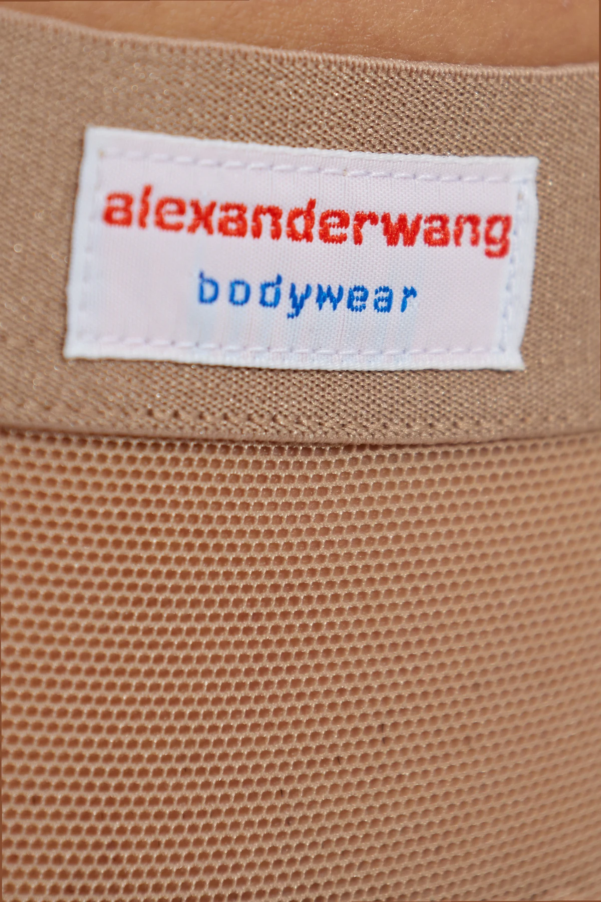 Introducing the Transparent Briefs from our exclusive collection, designed by the illustrious Alexander Wang. Elevate your wardrobe with this exquisite piece of bodywear, crafted for those who appreciate the subtle intricacies of style and comfort. These beige-hued briefs are meticulously fashioned from a delicate mesh-like material, offering a sheer, elegant appearance. The fabric’s transparency not only exudes sophistication but also provides a sense of lightness and breathability, making them a perfect addition to any modern wardrobe. The classic cut ensures a seamless fit, accentuated by an elastic waistband that promises superior comfort. A distinctive touch is the front label emblazoned with the \"alexanderwang bodywear\" logo in vibrant red and blue, a testament to the brand\'s unparalleled attention to detail. Why Choose This Product? Exquisite design by Alexander Wang. Crafted from premium mesh-like material for breathability. Features a signature logo detail for brand authenticity. Combines luxury with everyday comfort.