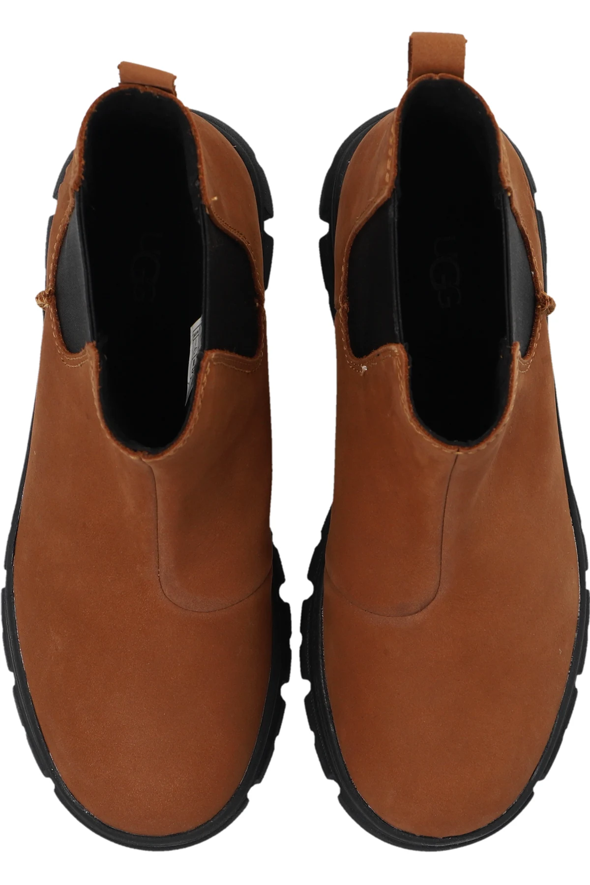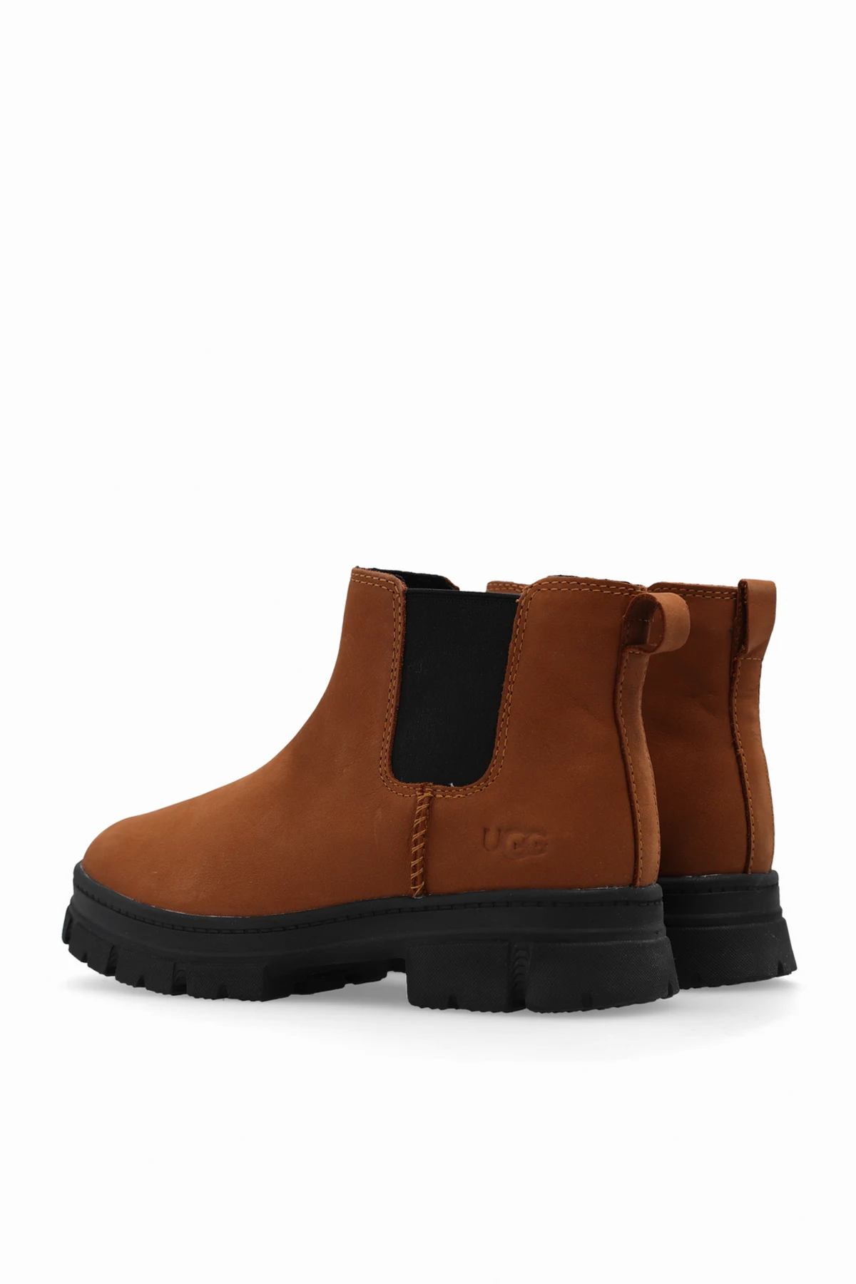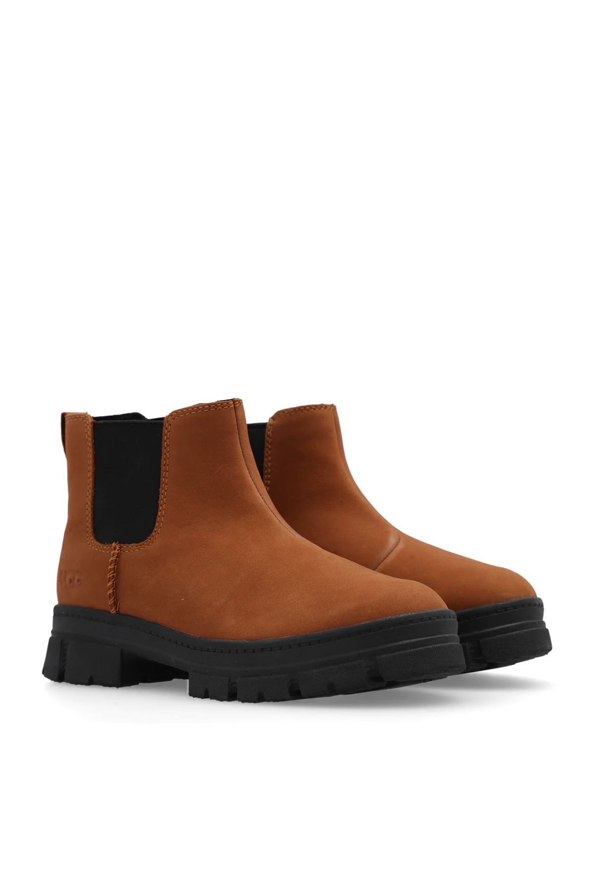 Brown ‘Ashton’ ankle boots from UGG Kids. Made from leather with hydrophobic coating, this model sits on a black rubber sole and features an embossed logo and elastic panels on the sides.