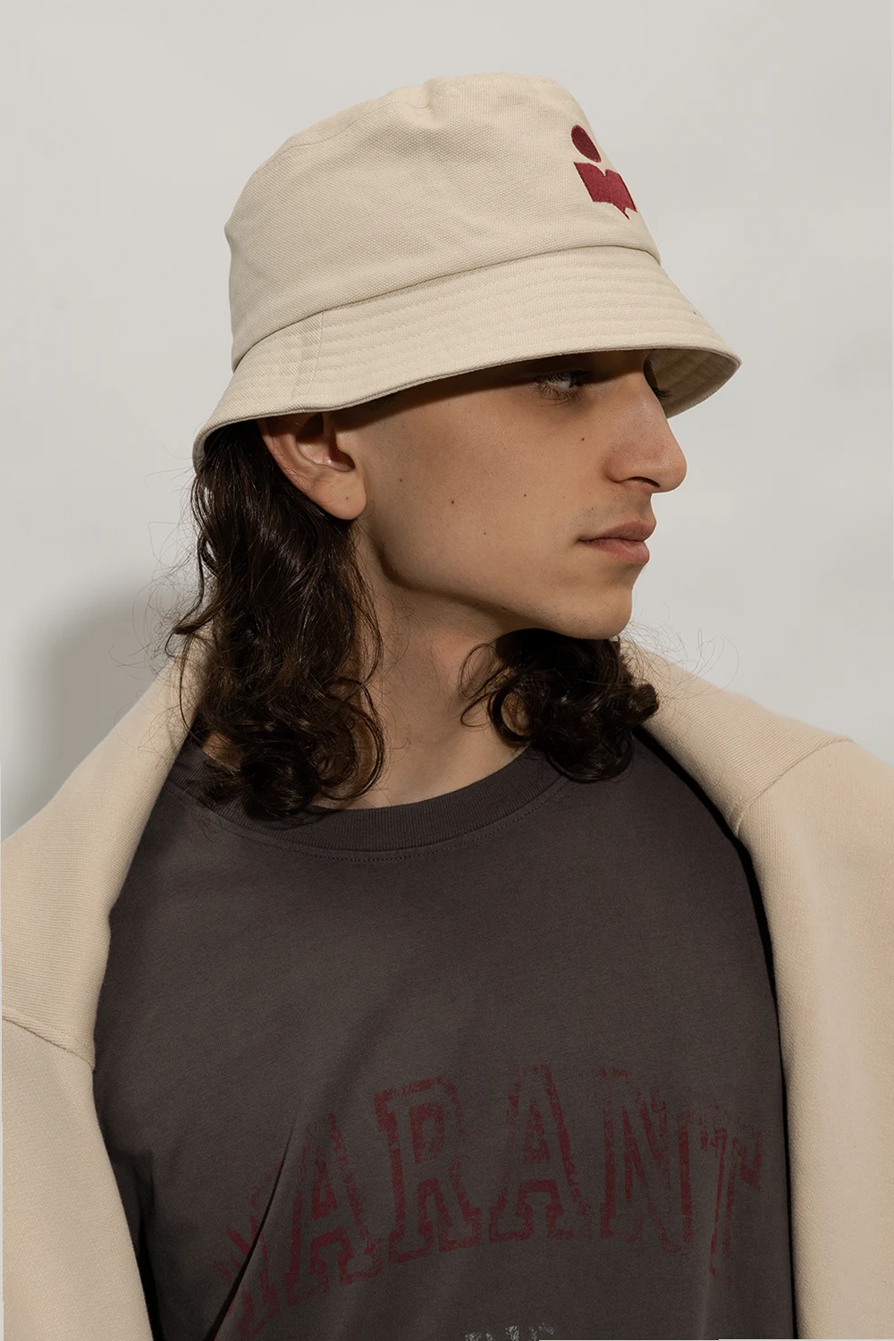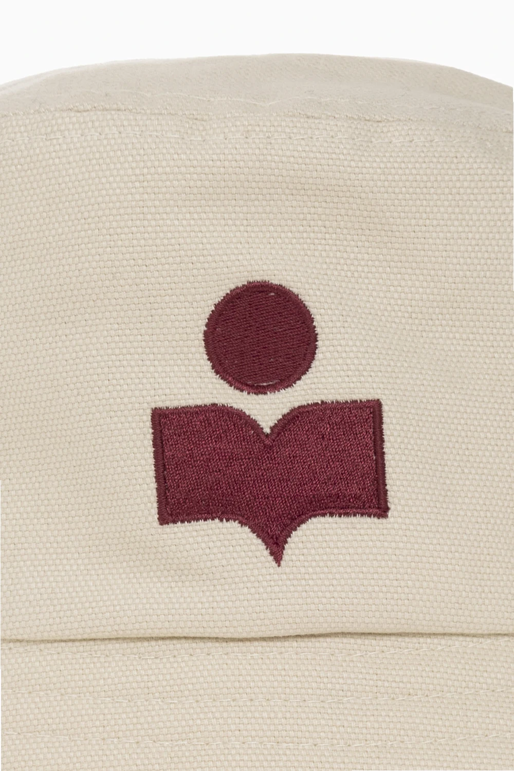 Light beige ‘Haley’ bucket hat from MARANT. Made of cotton, this item features an embroidered maroon logo.