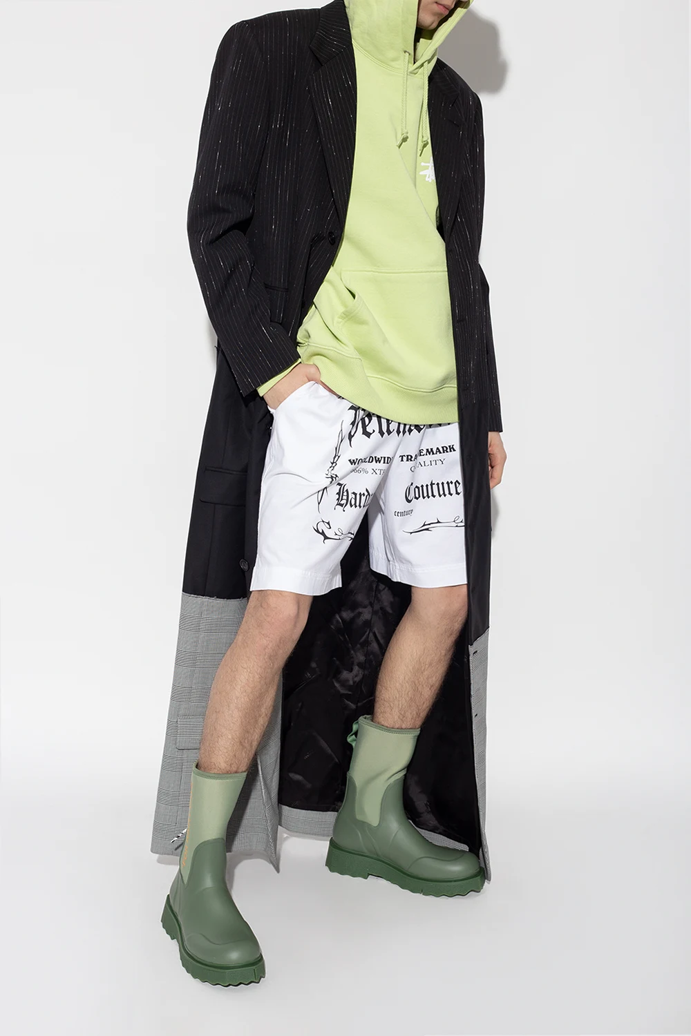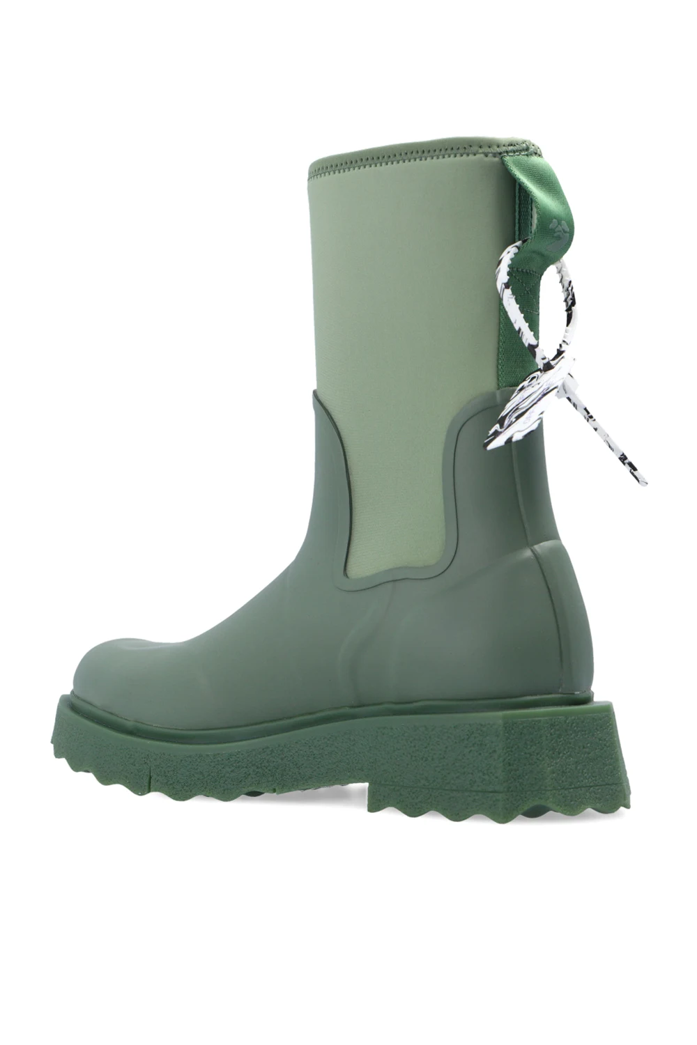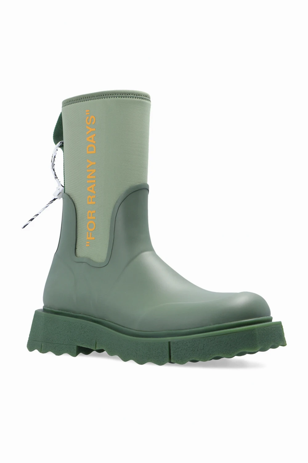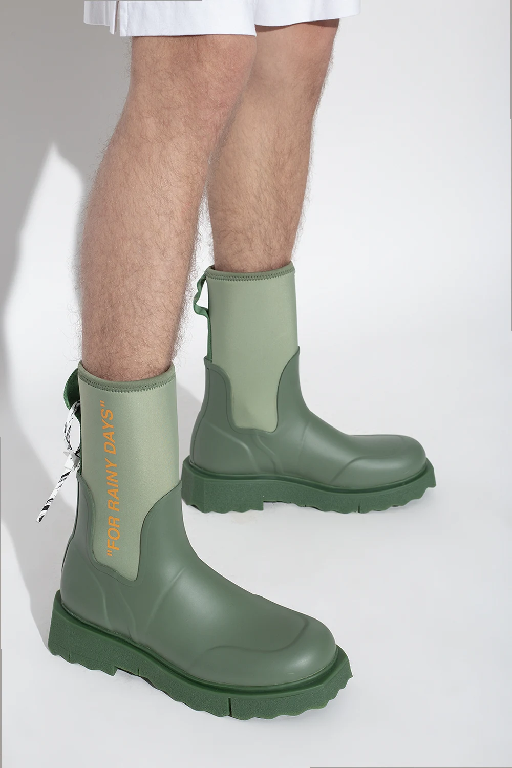 Green rain boots from Off-White. Resting on a green rubber sole, this pair features a sock, ‘For Rainy Days’ text in orange and the iconic zip tie tag in black and white.