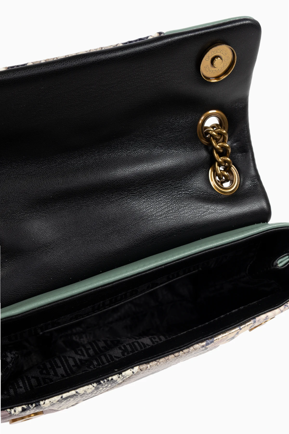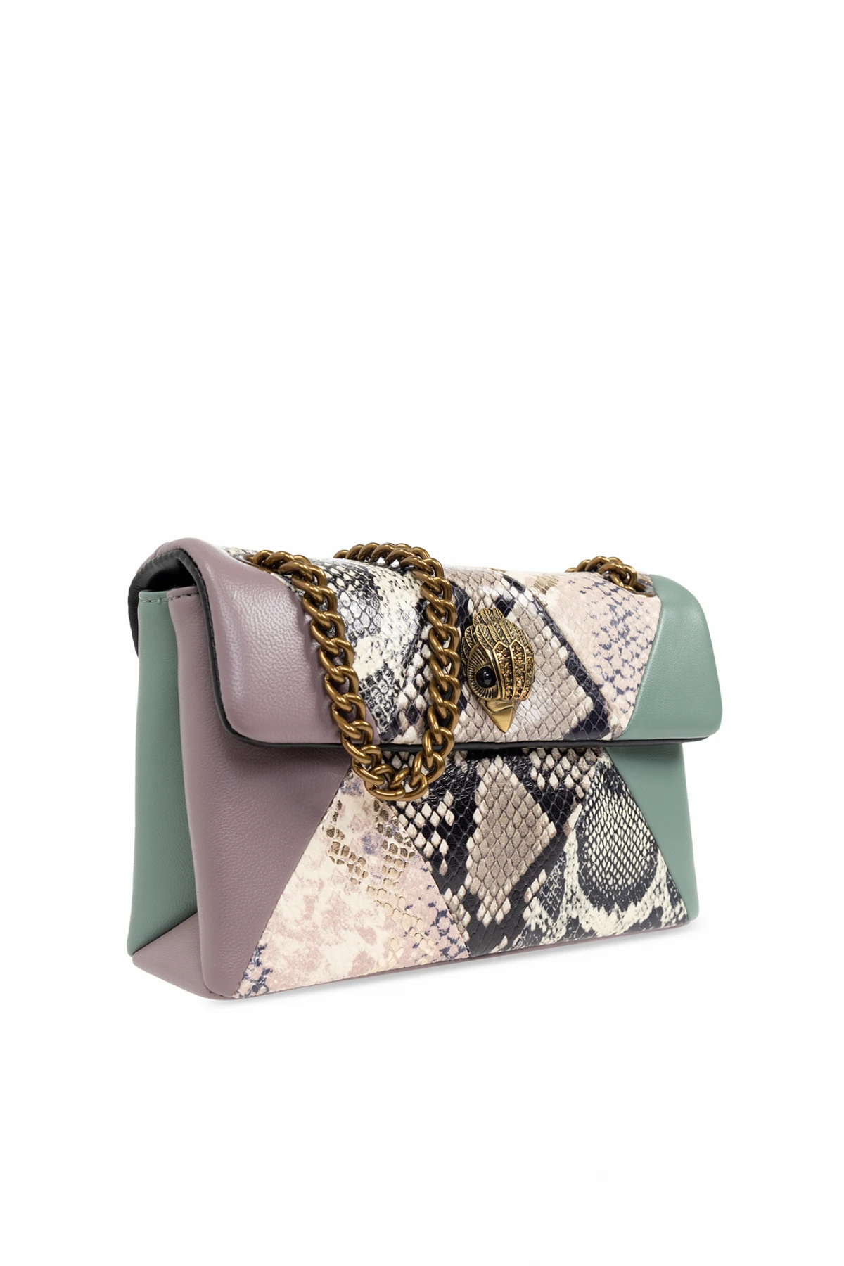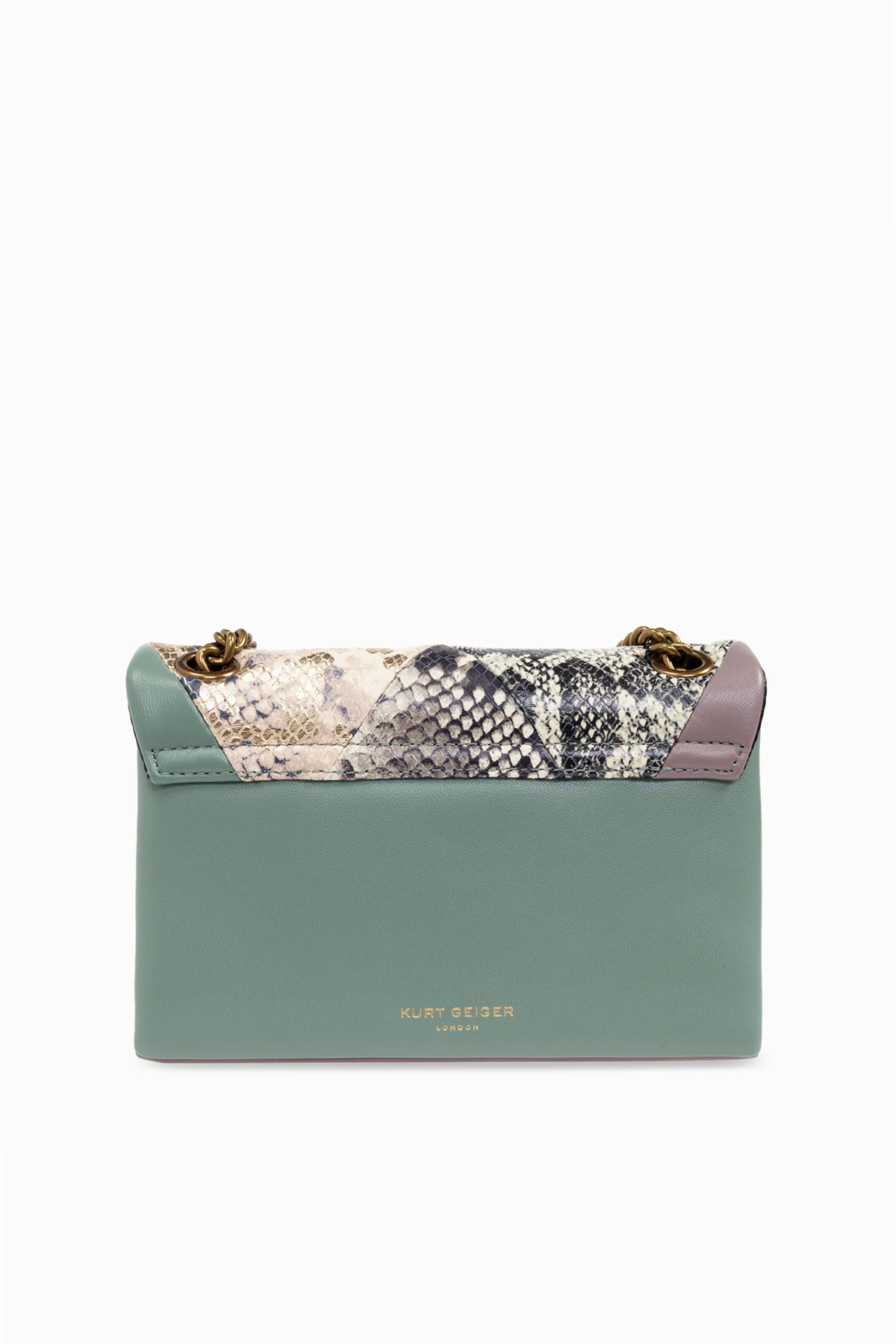 Experience the allure of British sophistication with the Kensington Mini Shoulder Bag from the esteemed Kurt Geiger collection. This exquisite accessory boasts a multicolor snake-skin pattern in refined hues of beige, black, green, and pink, crafted from premium materials that exude luxury. The bag\'s compact, rectangular silhouette is enhanced by a flap secured with an ornamental clasp, while the chain strap provides an elegant touch for shoulder wear. A standout feature is the decorative metal eagle head adorned with crystals, adding a unique flair. Inside, the bag is lined with a dark fabric featuring the brand\'s insignia, reflecting meticulous attention to detail. The Kurt Geiger logo graces the back in a subtle golden hue, affirming its prestigious origin. Why Choose This Product? Distinctive design with a multicolor snake-skin pattern. Compact and stylish \"Kensington Mini\" structure. Unique metal eagle head embellishment. Elegant chain strap for versatile wearing options. Luxurious brand detailing and craftsmanship.