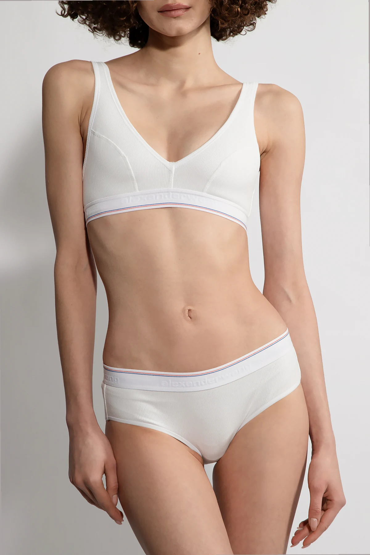 White briefs from Alexander Wang. Made of ribbed cotton, this pair features an elasticated waistband decorated with a logo and stripes in red and blue.