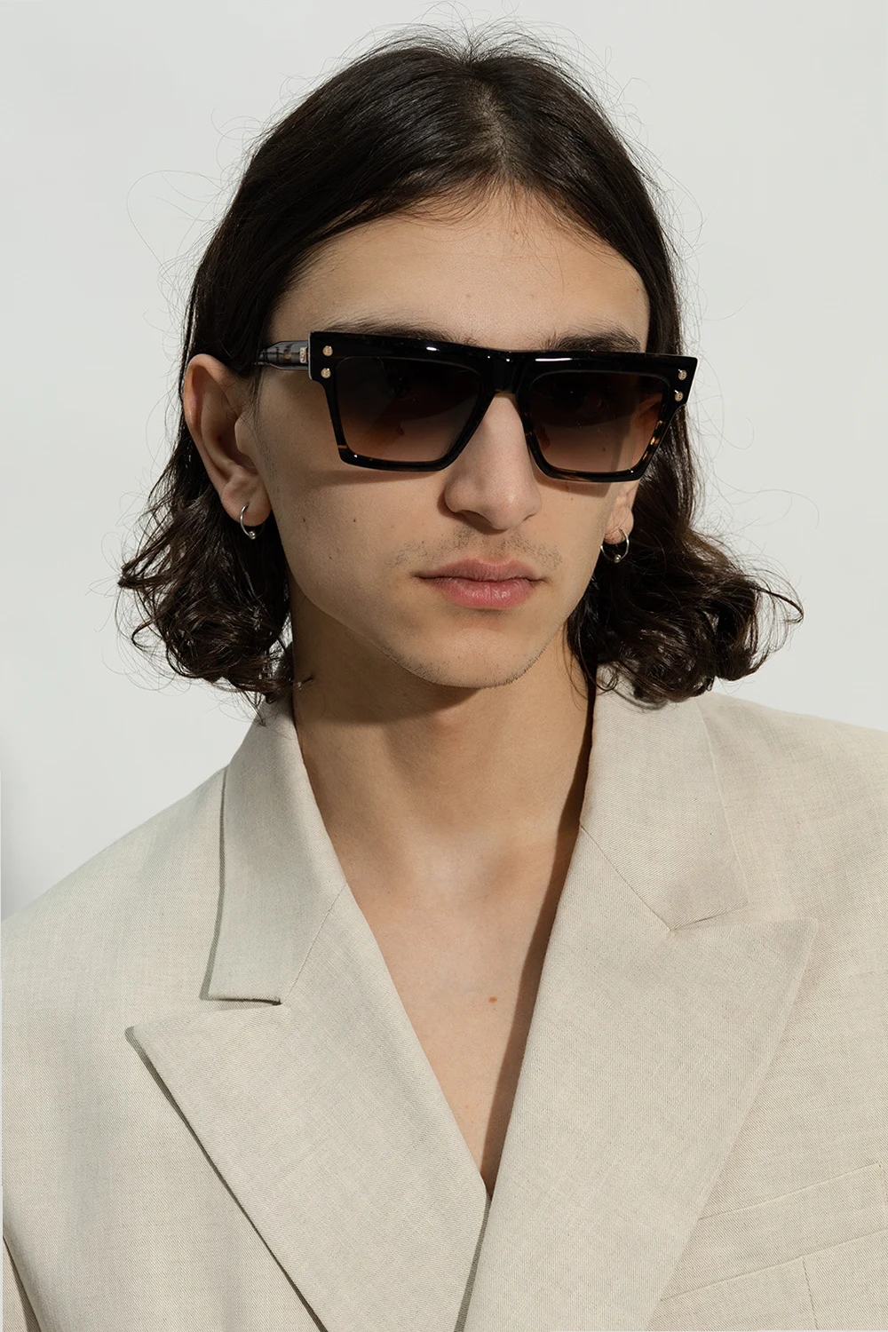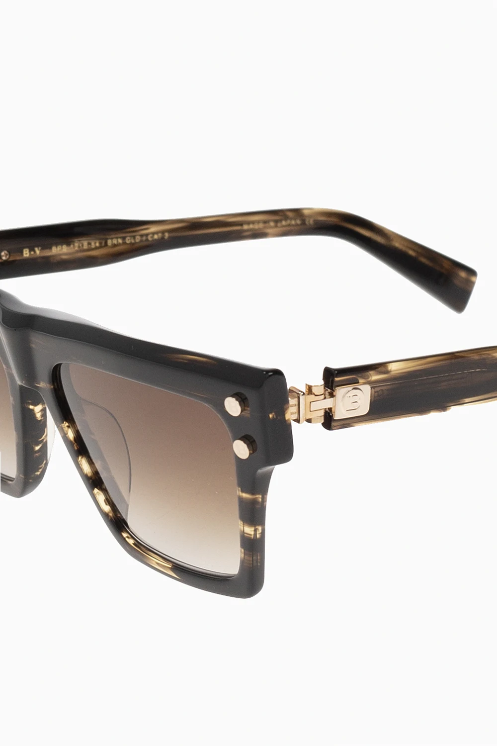 Brown ‘B-V’ sunglasses from Balmain. This pair features rectangular frames with a pattern and metal monogram details, temples with a logo and brown anti-glare gradient lenses with UV protection. Case included.
