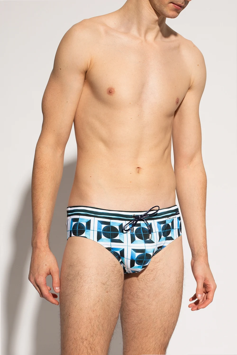 Navy blue, white and blue swim briefs from Dolce & Gabbana. Embellished with an all-over logo print.