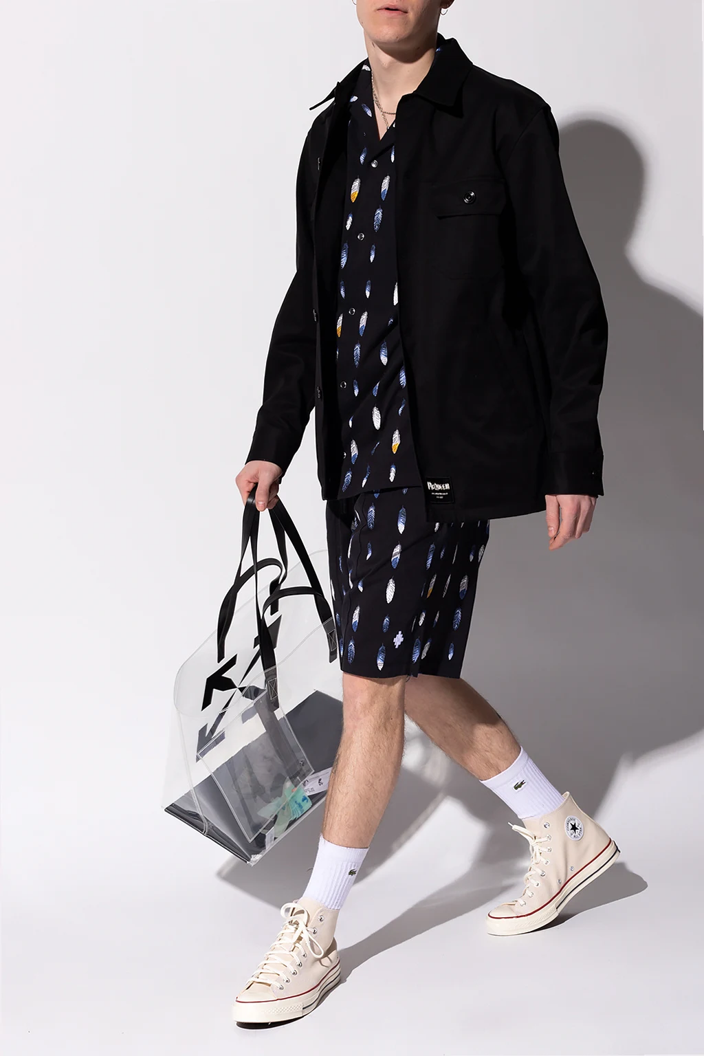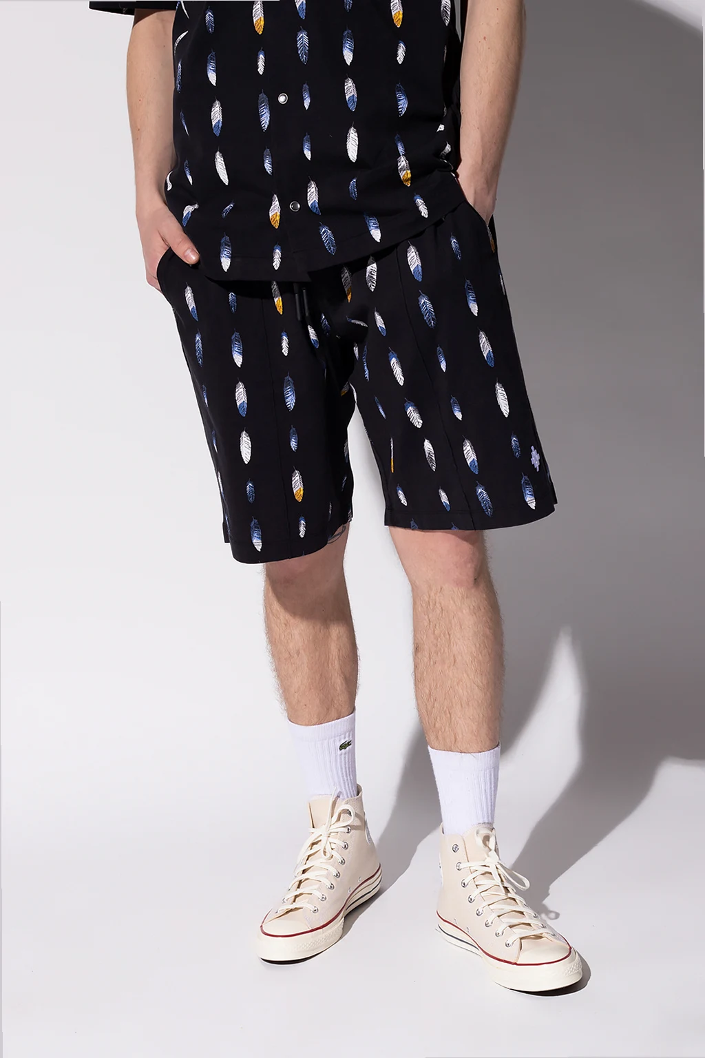 Black shorts from Marcelo Burlon. Enriched by a printed graphic pattern, this cotton-crafted pair features a drawstring waist, two side seam pockets and one back button pocket.