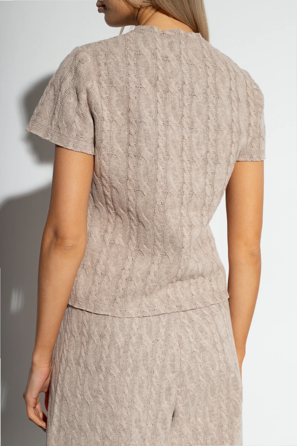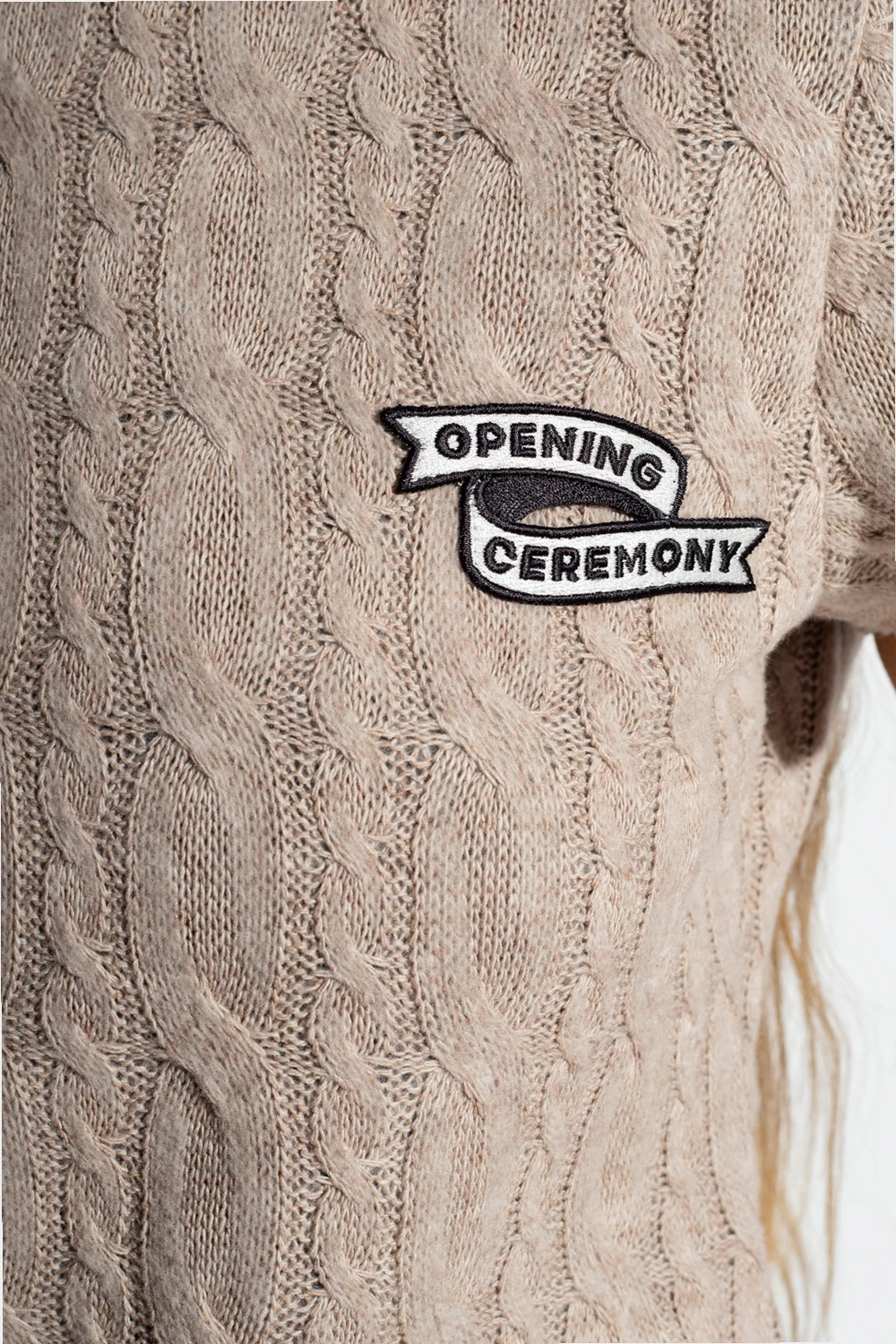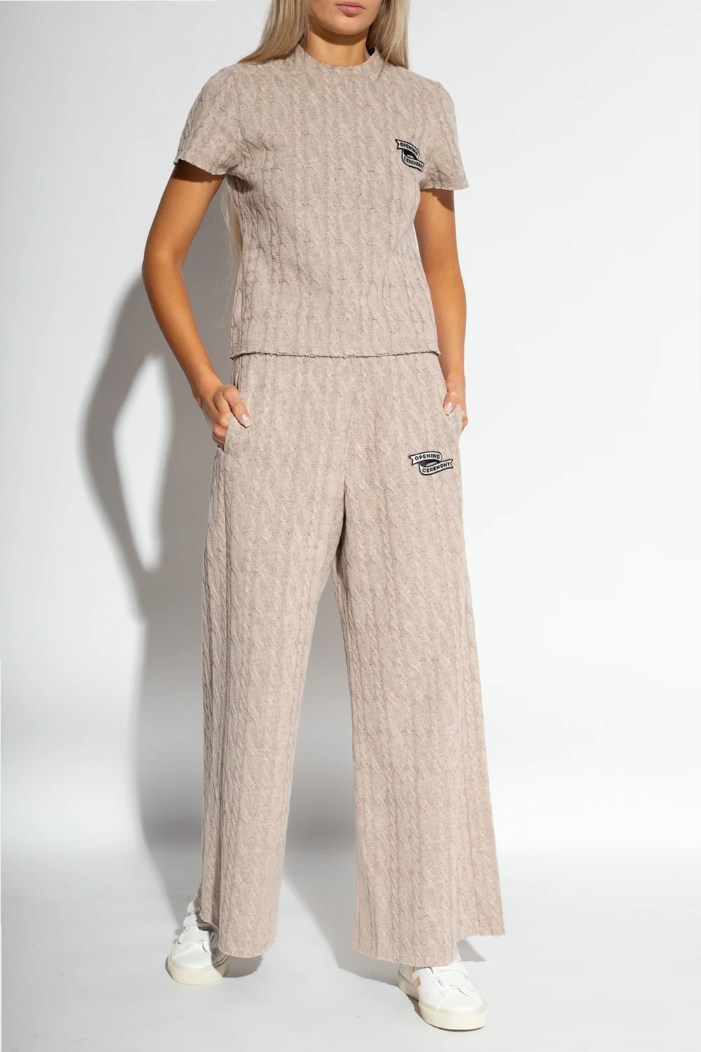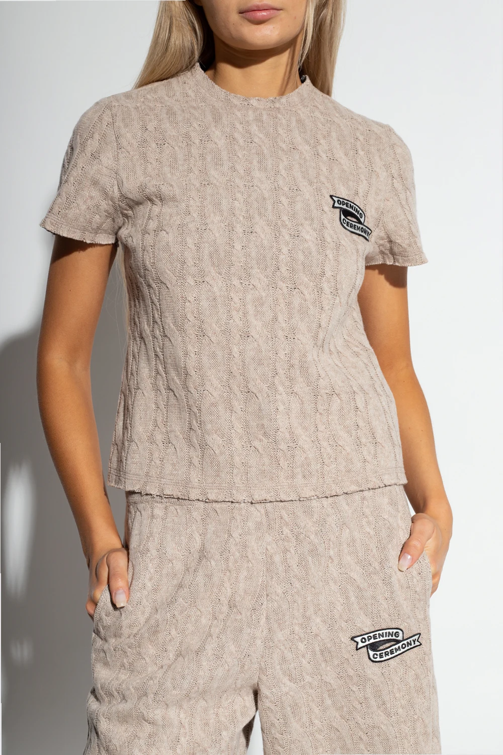 Beige top from Opening Ceremony. Crafted with a distinctive knit, this style features a round neck, short sleeves and a white and black logo patch on the front.