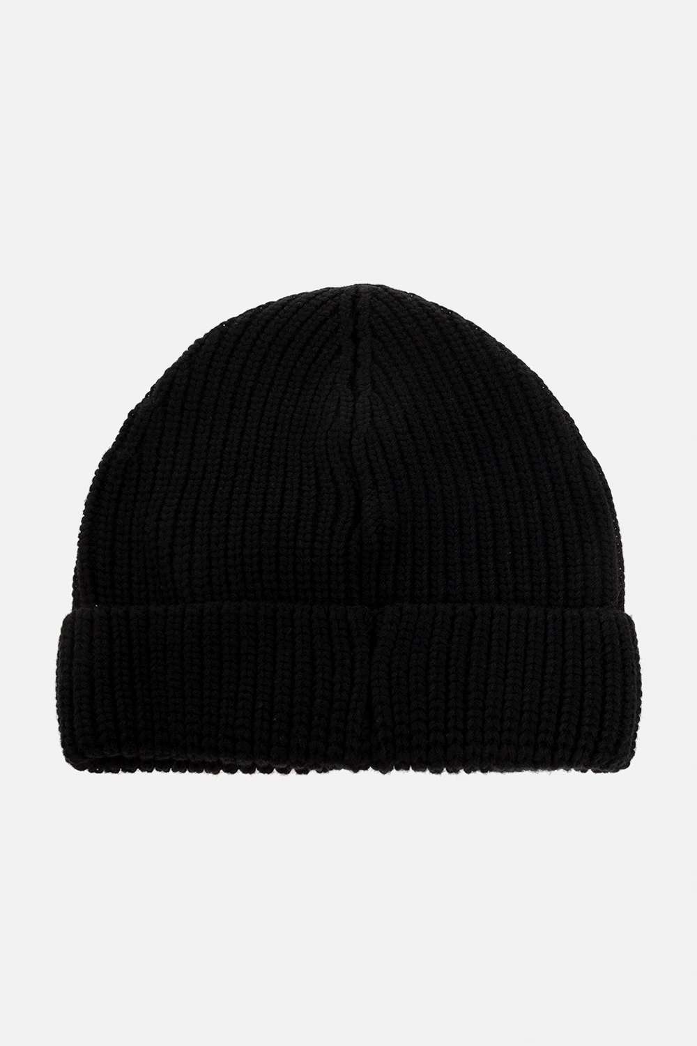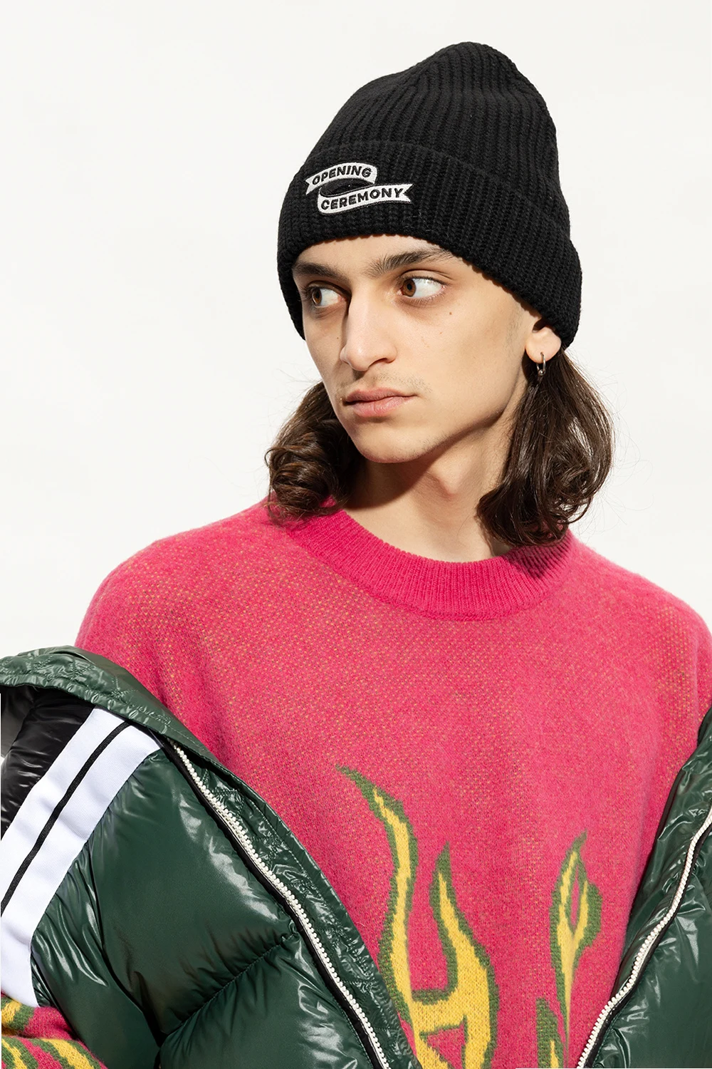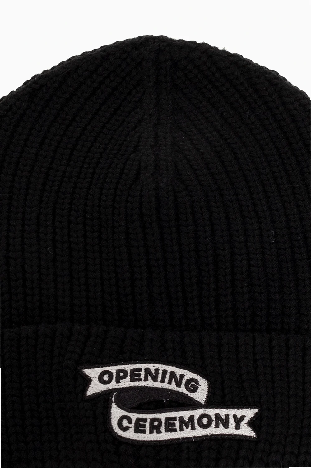 Black ribbed beanie with a white and black logo patch and ribbed brim from Opening Ceremony.