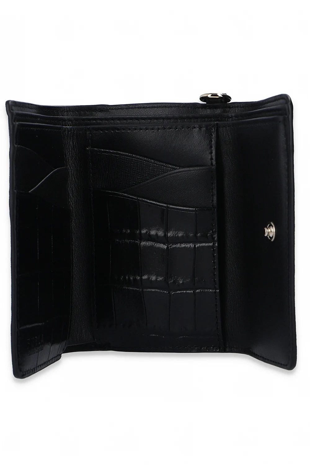 Black ‘Armonia’ bifold wallet from Furla. Crafted from leather, this model features a snap fastening, logo appliqué, one zip pocket, silver-tone metal hardware as well as six card slots, two slip pockets and one bill compartment.