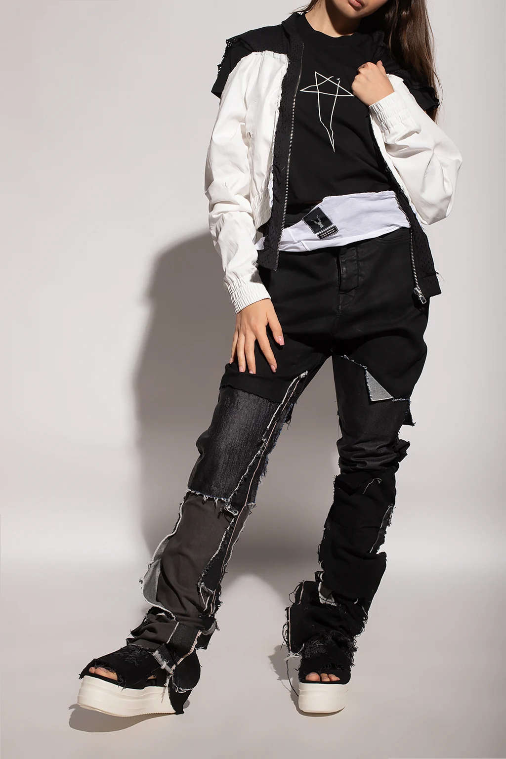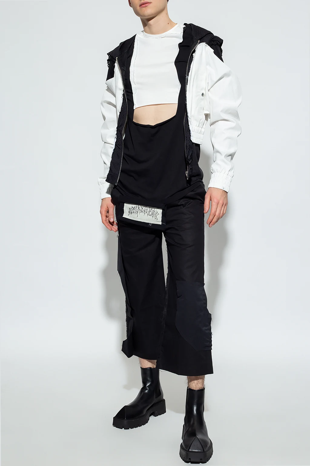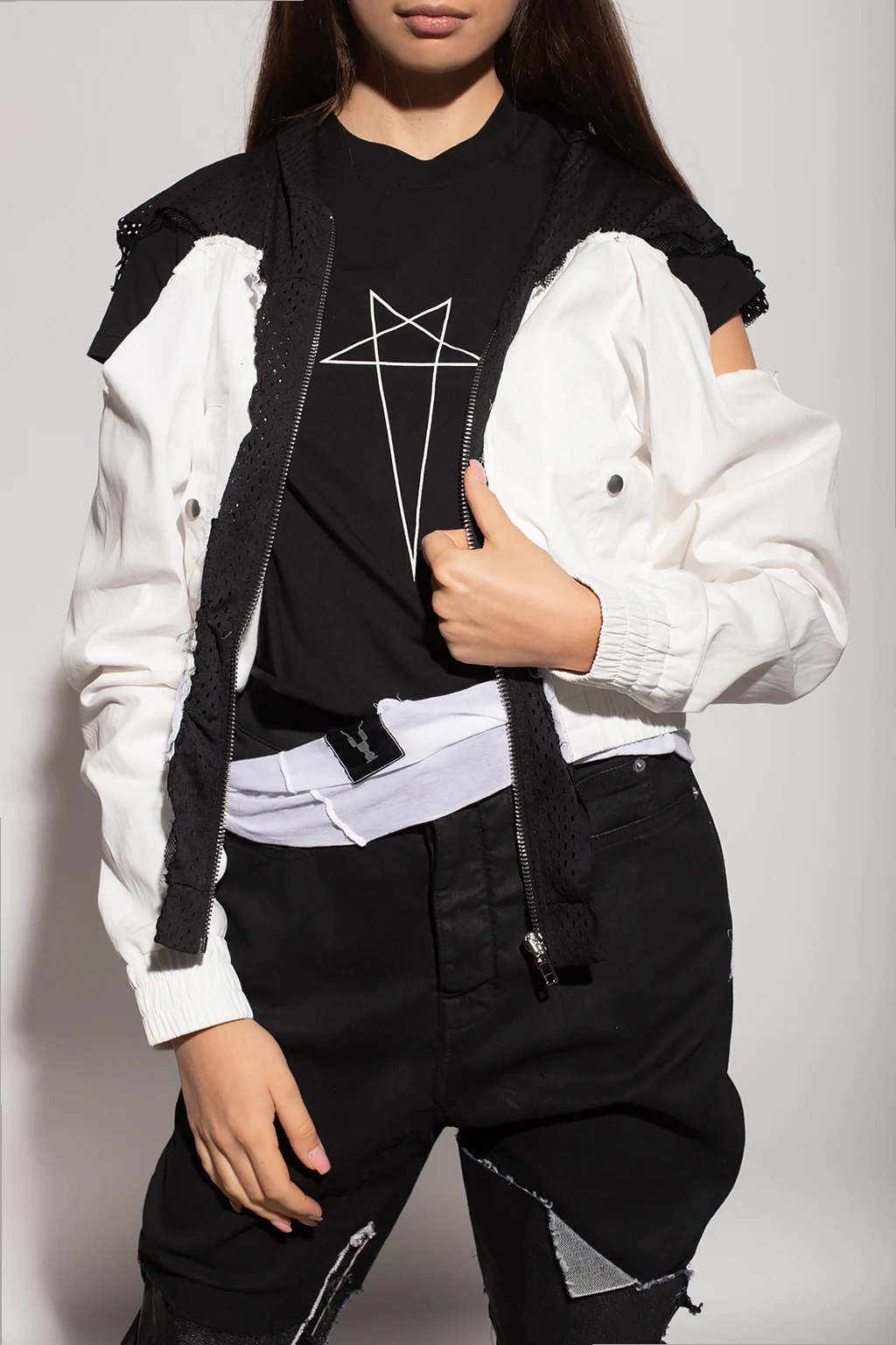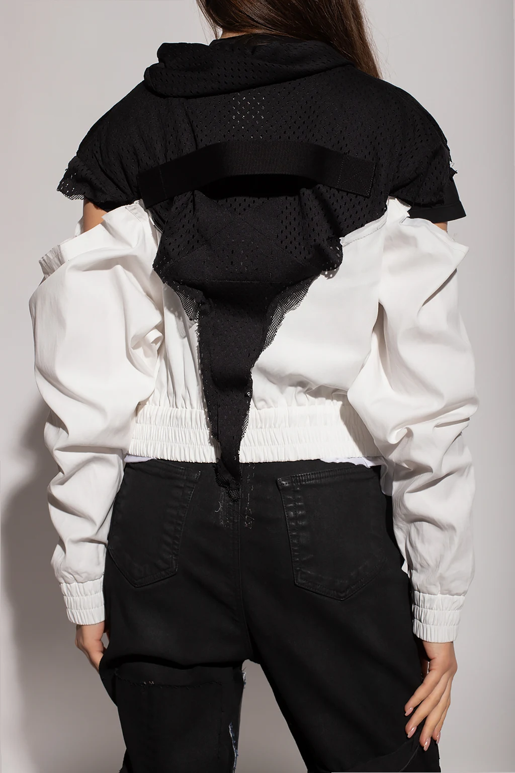Black and white jacket with a hood from Owens x Swampgod. Crafted from different fabric panels assembled together, this style features a zip fastening, distinctive cut-outs and raw hems, two snap-fastened pockets and an elasticated bottom hem and cuffs. Item designed to celebrate the 10th anniversary of VITKAC.