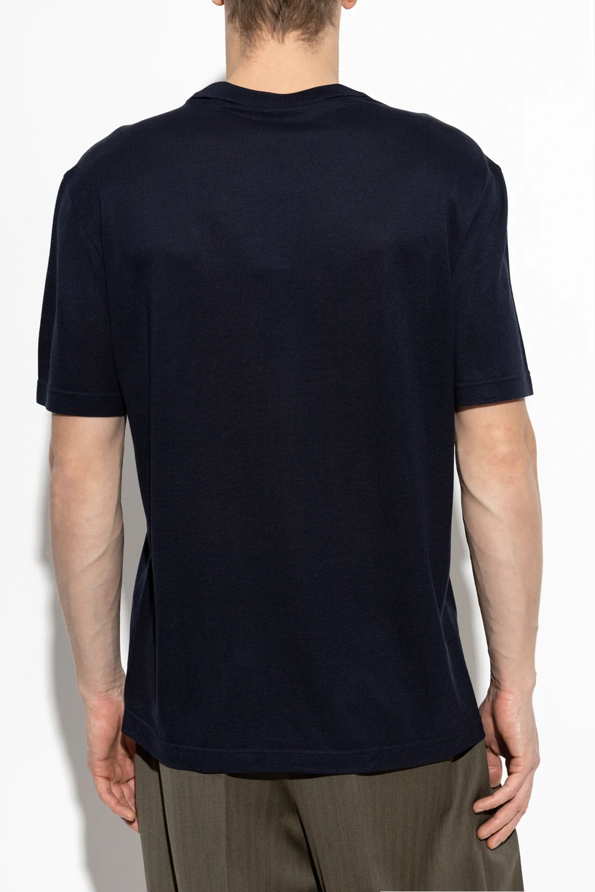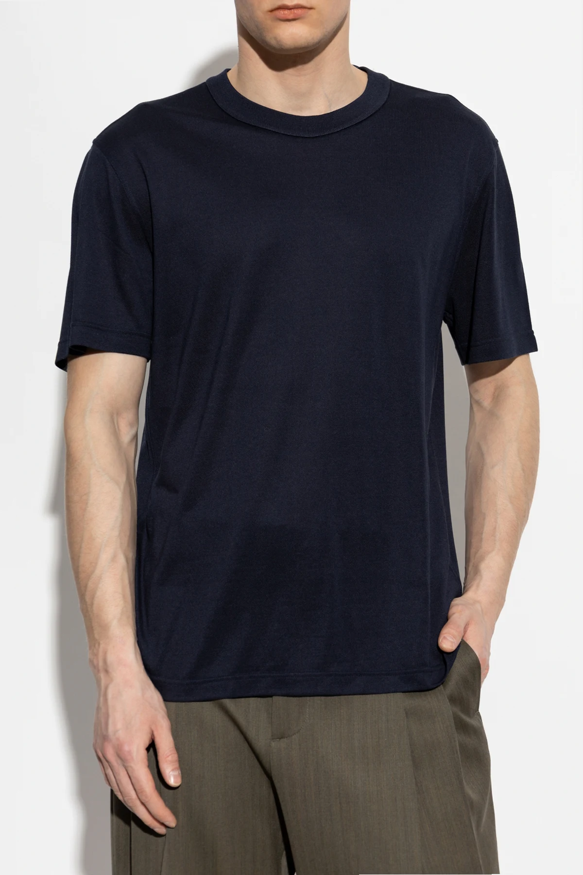 Introducing the Silk T-Shirt with Round Neck from the esteemed designer Brioni. This exquisite piece embodies the epitome of refined elegance, hailing from the iconic Italian fashion house founded by Nazareno Fonticoli and Gaetano Savini. Rendered in a deep, solid navy hue, this t-shirt is the quintessence of understated luxury. Crafted from sumptuous silk, the fabric exudes a delicate sheen, ensuring both opulence and unrivaled comfort. The classic silhouette, featuring short sleeves and a round neckline, offers a timeless appeal, making it a versatile staple for sophisticated ensembles as well as casual affairs. Meticulously constructed with impeccable stitching, this t-shirt boasts a minimalist design devoid of any external branding, allowing its superior craftsmanship to take center stage. Why Choose This Product? Luxurious silk material with a subtle sheen Versatile design suitable for various occasions Flawless craftsmanship with precise stitching Minimalist aesthetic with no external logos