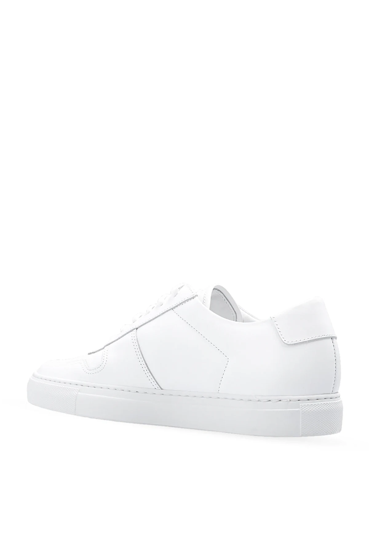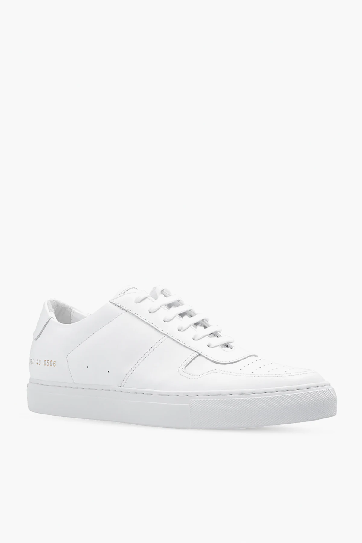 White ‘Bball Low’ sneakers from Common Projects. Crafted from leather, this lace-up model features a gold-tone print on the side, a perforated toe, and a white rubber sole. Swappable shoelaces included.