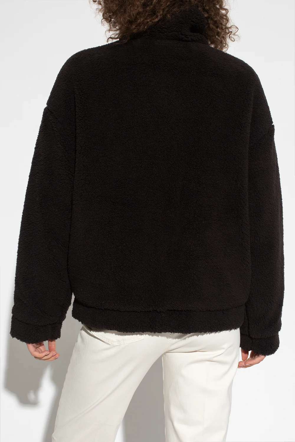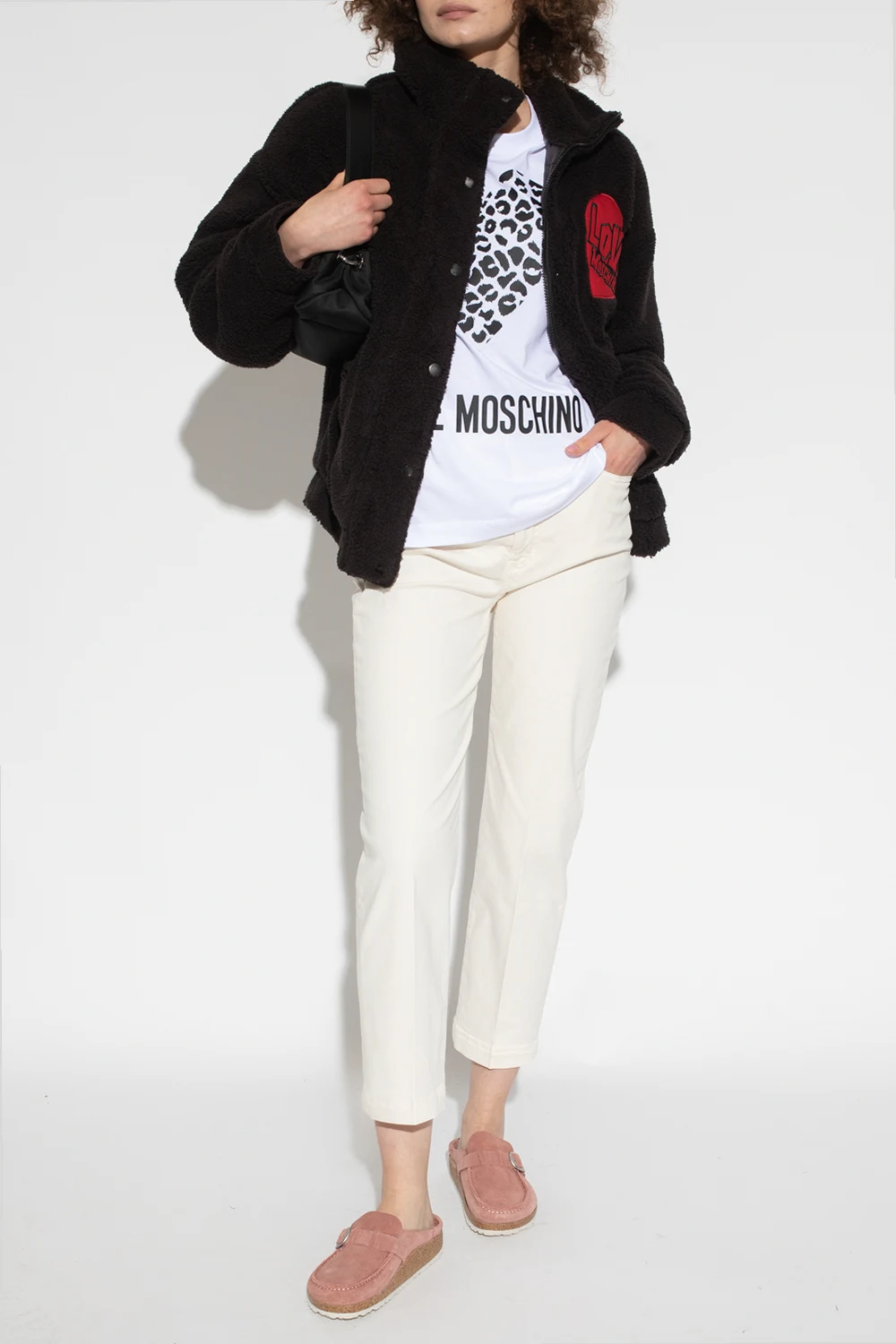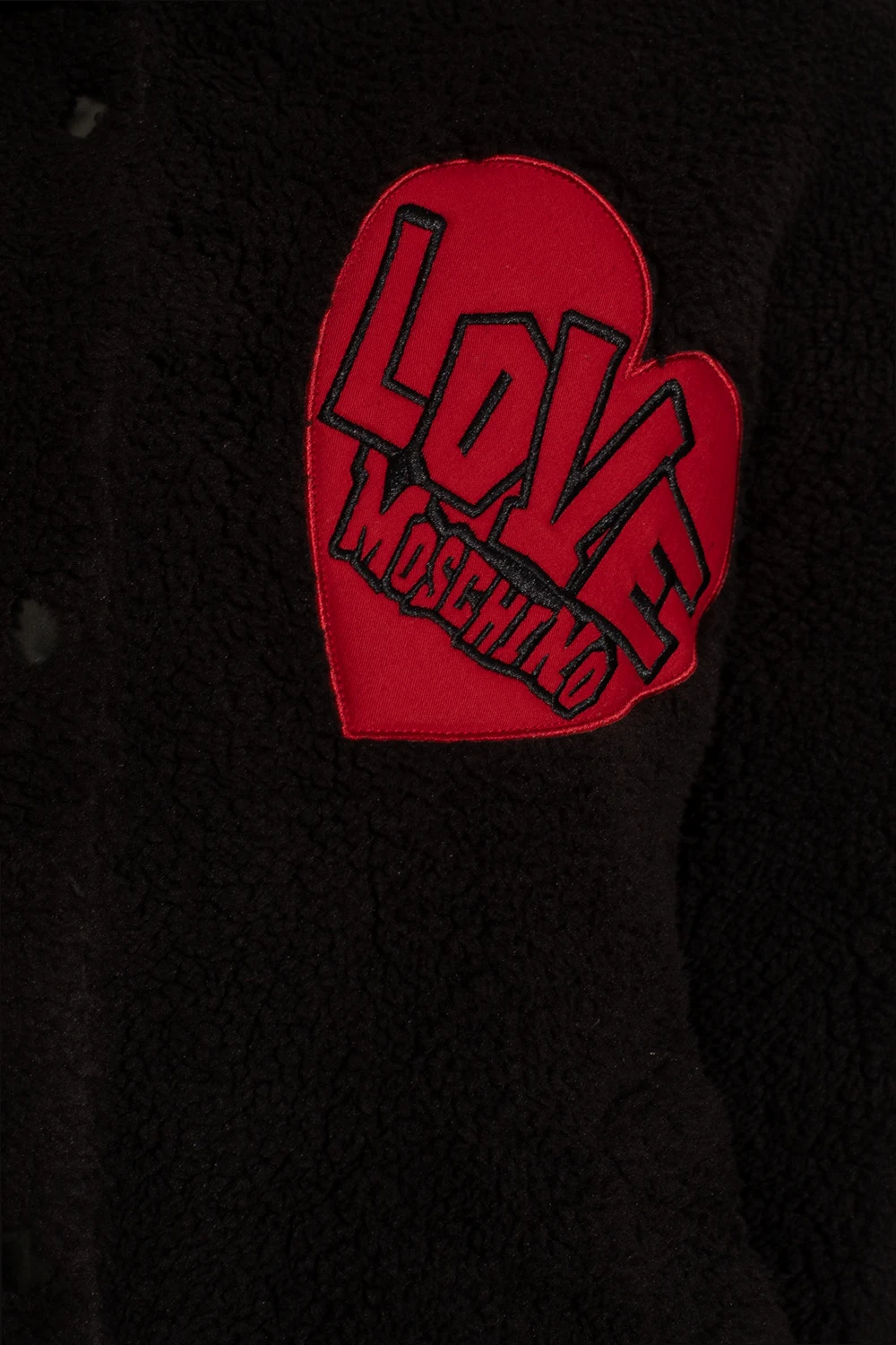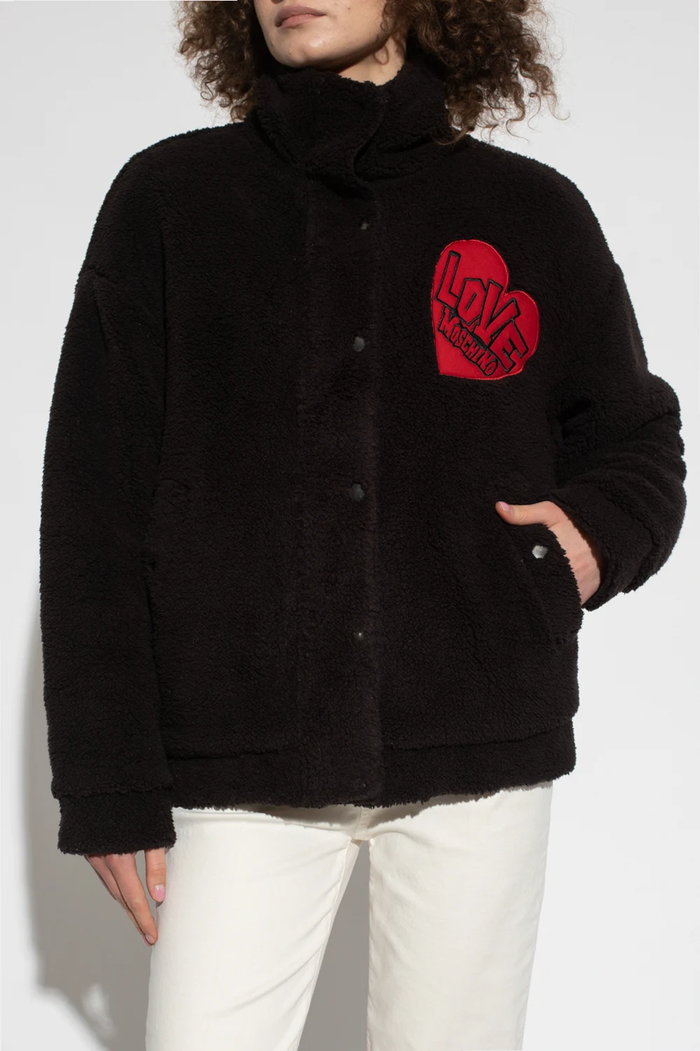 Black furry jacket with a stand collar from Love Moschino. Fastened with snaps, this garment features a black and red logo patch, two snap-fastened pockets and ribbed trims at the hem and cuffs.