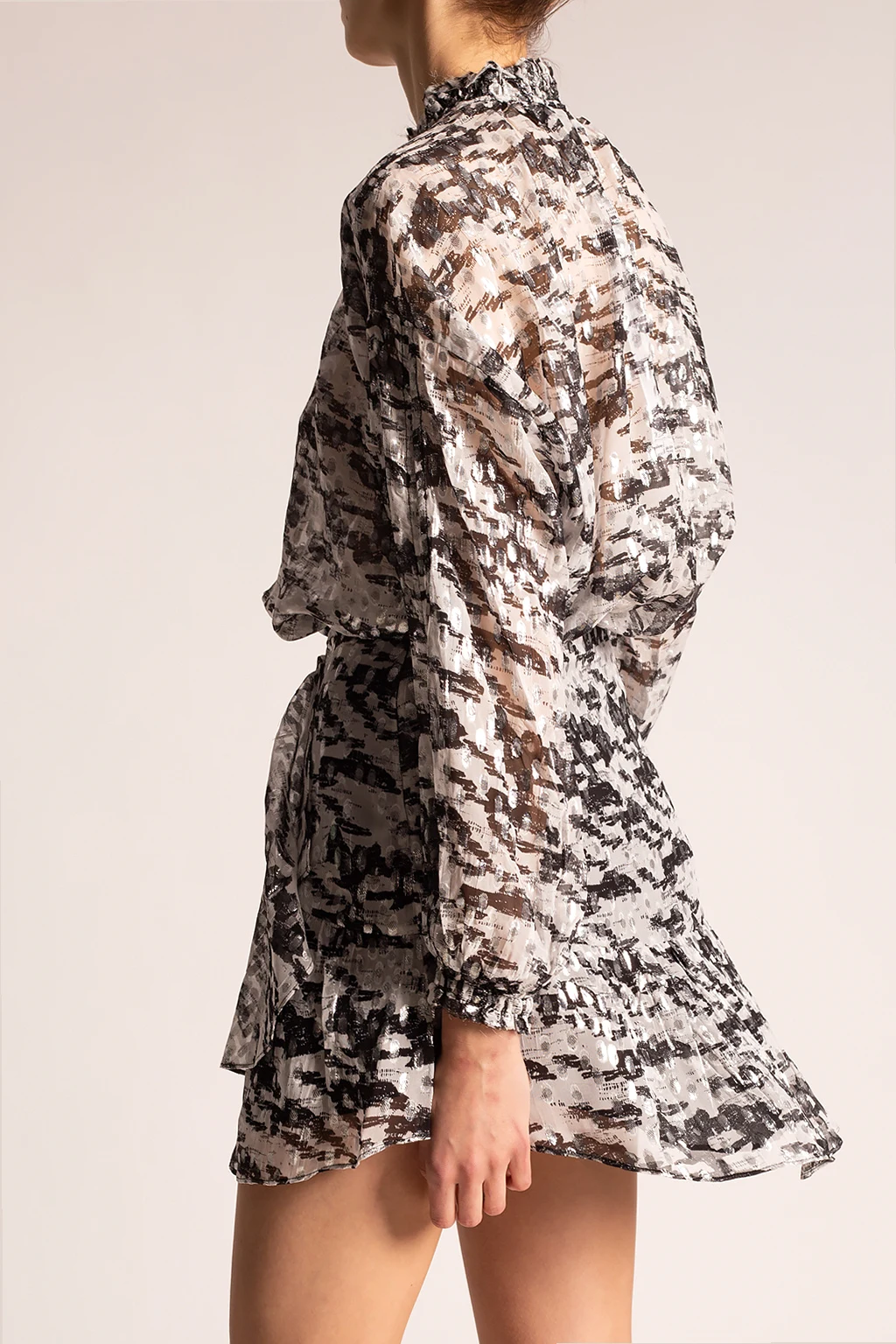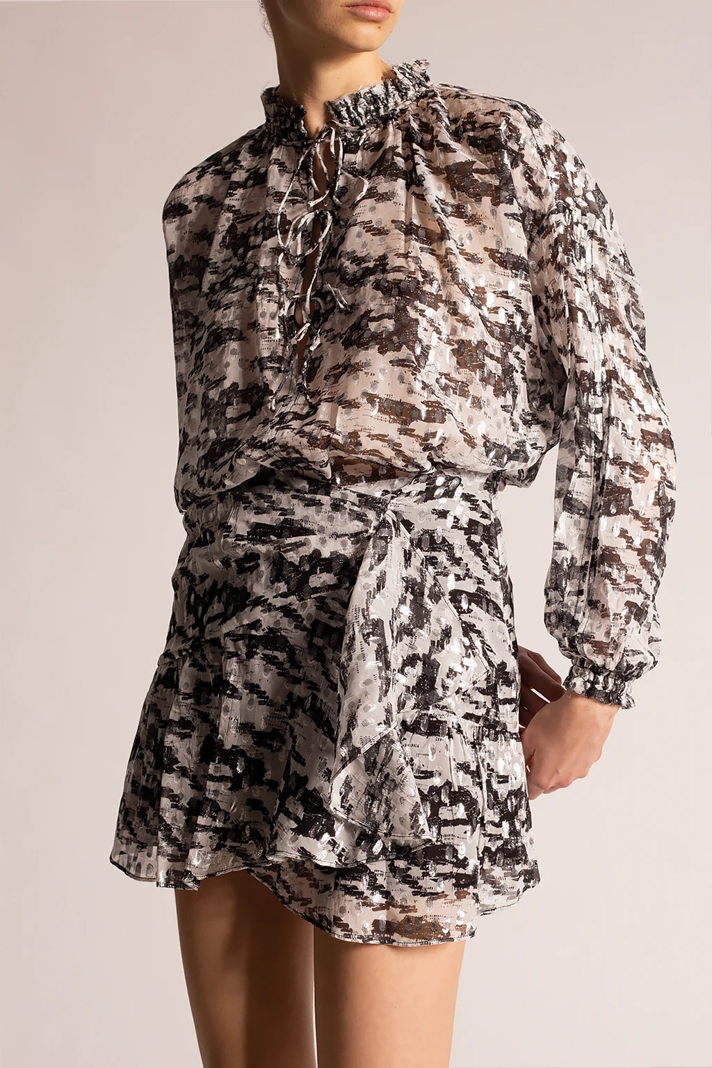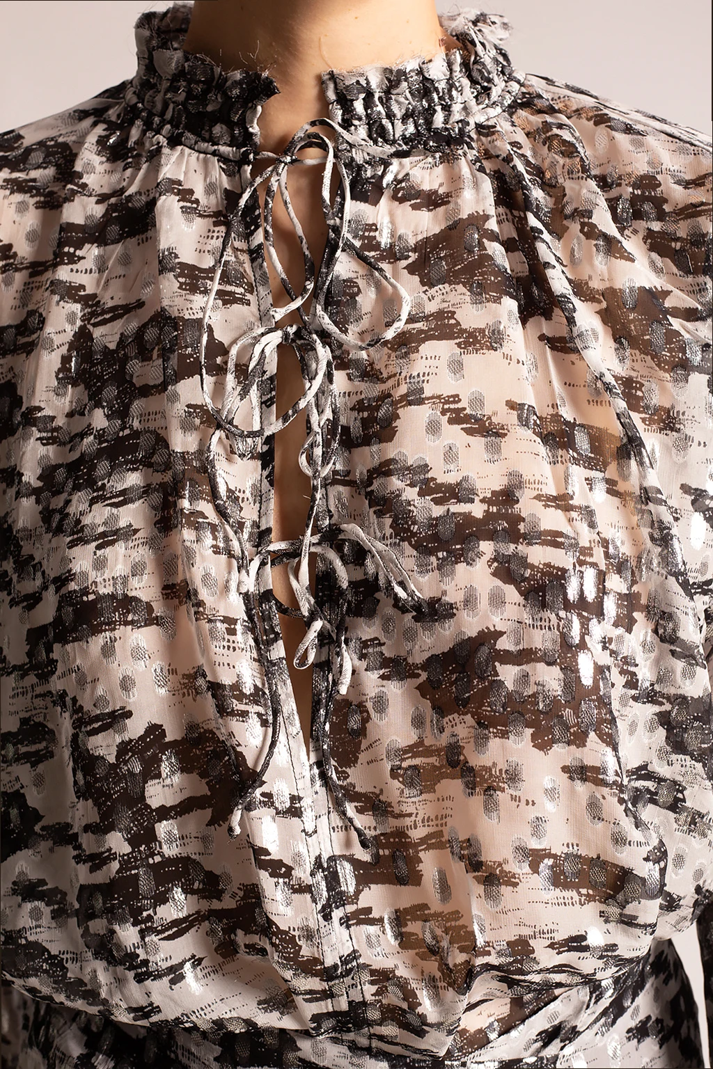 Grey and black top from Iro. Crafted from a silk blend, this style features a self-tie fastening on the front, silver-tone lurex trims and long sleeves with elasticated cuffs.