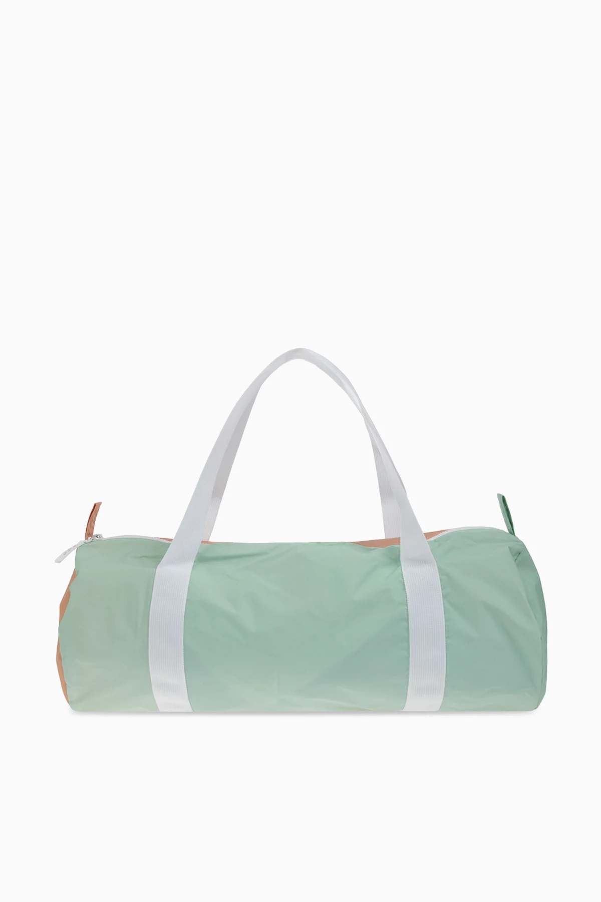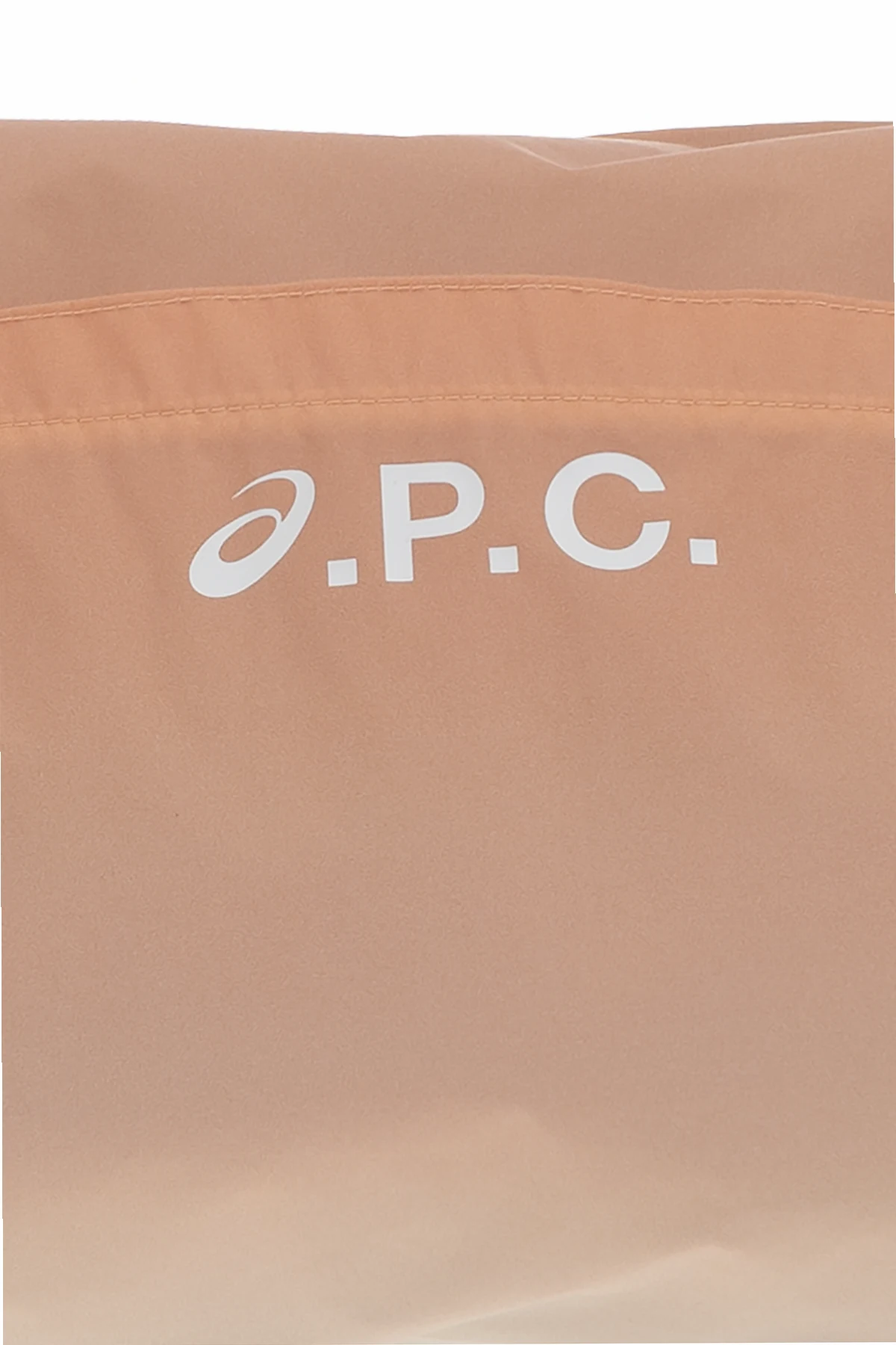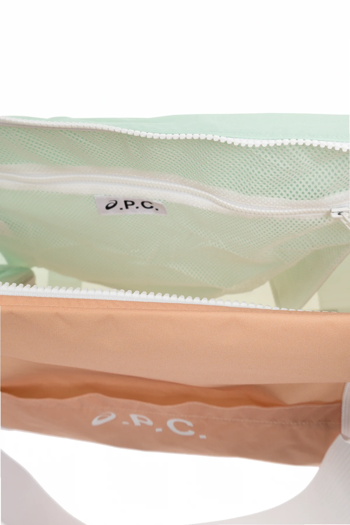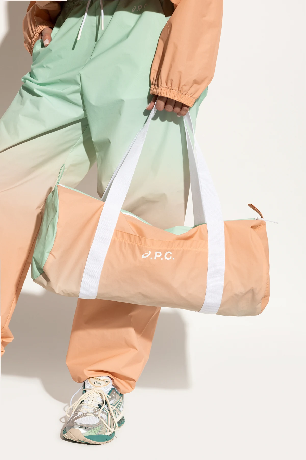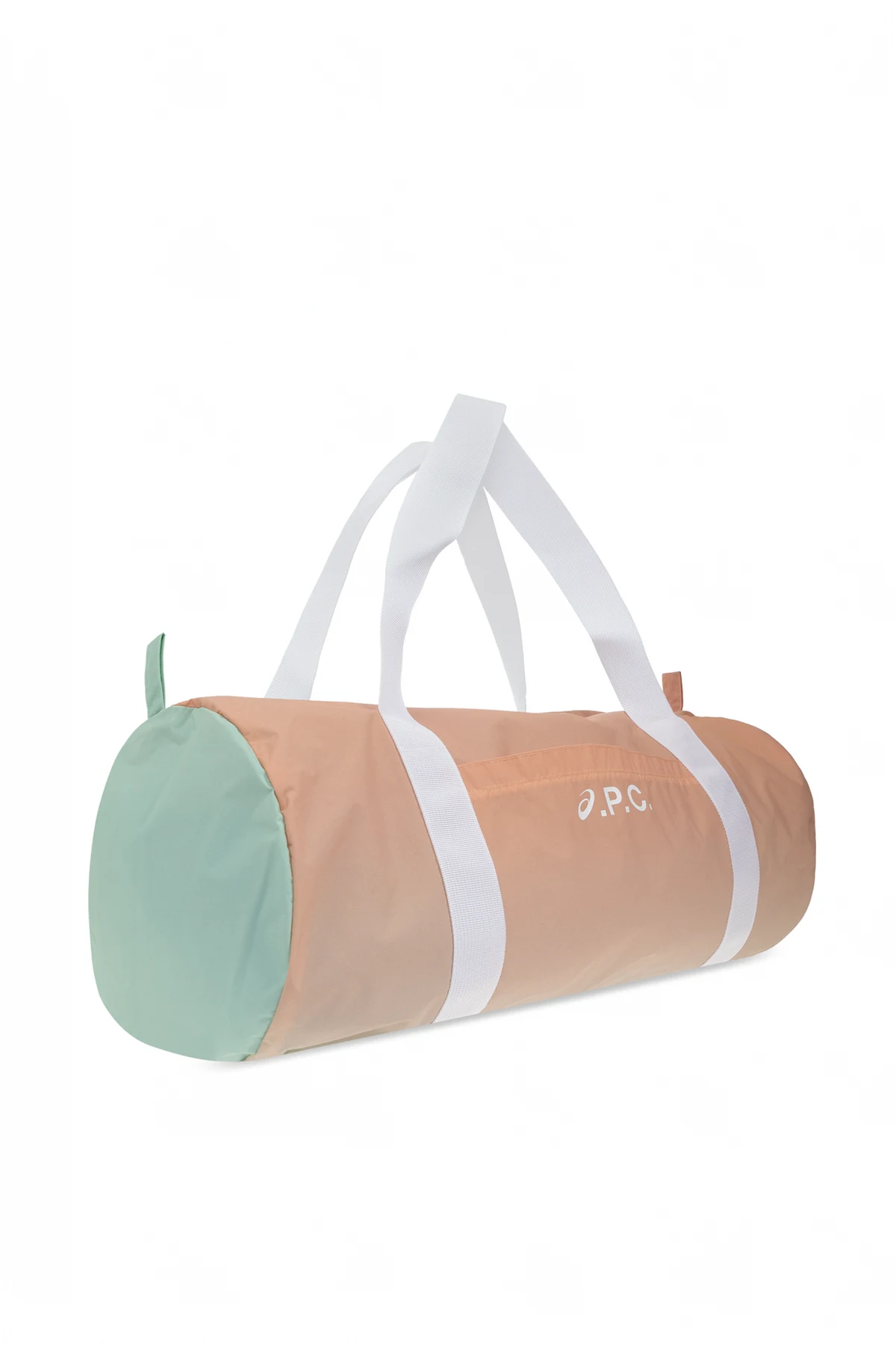 Introducing the exquisite APC x ASICS bag, an embodiment of modern sophistication and dynamic style. This unisex cylindrical masterpiece, crafted from lightweight synthetic material, is adorned in pastel hues of peach and mint, exuding a subtle elegance that complements any ensemble. The bag\'s distinctive A.P.C. logo graces the front, a testament to its prestigious heritage rooted in Parisian chic since 1987. A.P.C., known for its minimalist approach under the visionary Jean Touitou, offers a design that defies ostentatious trends, focusing instead on timeless urban wear. Featuring crisp white handles that provide a striking contrast, this bag is as functional as it is fashionable. Its interior boasts a zippered compartment, ensuring your essentials are secure and easily accessible. Why Choose This Product? Elegant pastel colors with a modern cylindrical design. Lightweight and practical for everyday use. Iconic A.P.C. branding for a touch of luxury. Secure zippered interior compartment for enhanced functionality. Unisex design suitable for both men and women.
