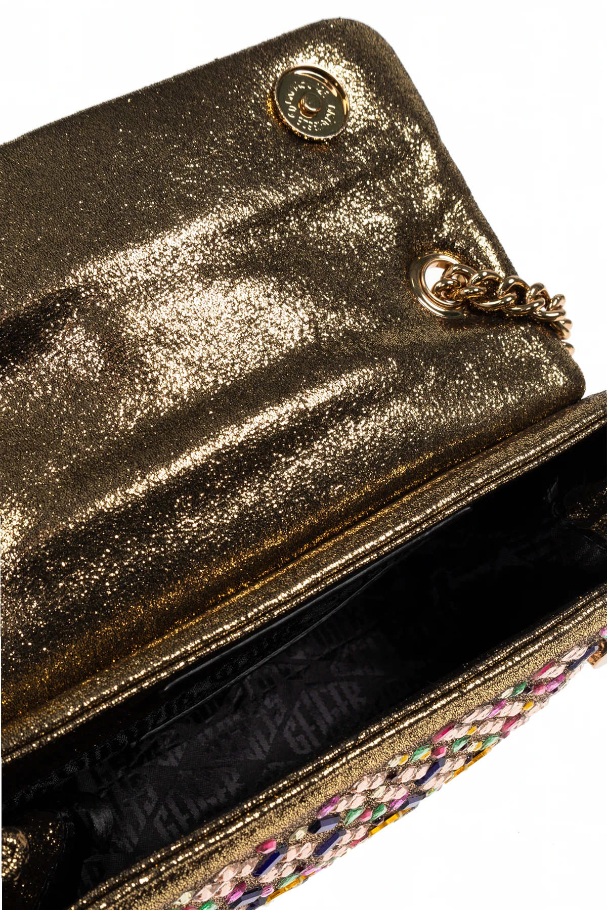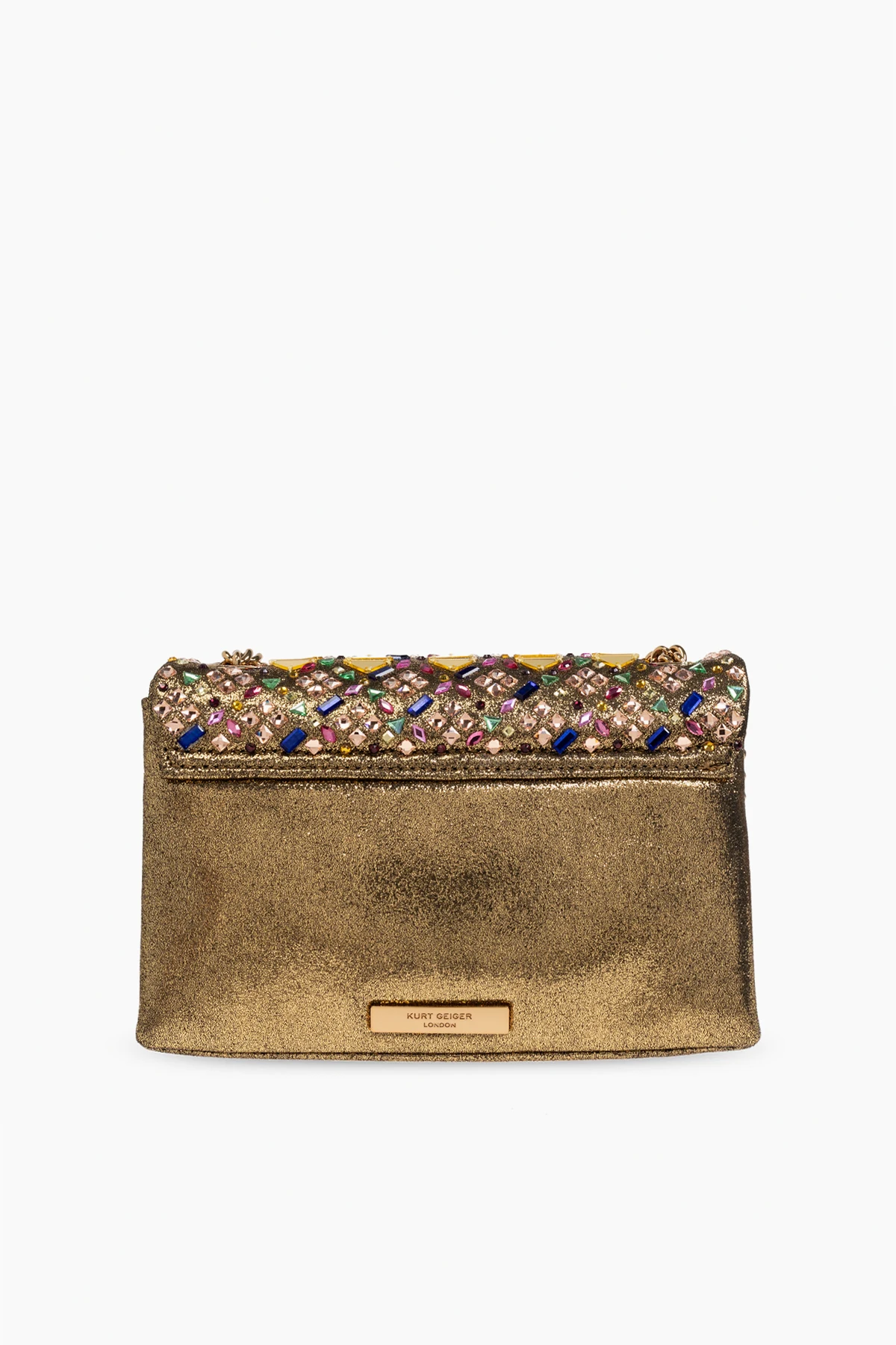 Introducing the exquisite MD Kensington shoulder bag from the prestigious Kurt Geiger collection. This iconic piece embodies a harmonious blend of classic elegance and modern sophistication, perfect for distinguished occasions. The bag boasts a rectangular shape, adorned with a lavish pattern of vibrant hues and golden squares. Crafted from a luxurious material with a golden sheen, it exudes opulence, further accentuated by a striking animal-head embellishment on the front flap. The golden chain strap adds a touch of refinement, while the interior, lined with dark fabric and featuring the brand\'s logo, provides a spacious compartment secured by a magnetic closure. The dominant gold tone, enhanced with pink, blue, green, and purple accents, creates a visual masterpiece. Why Buy This Product? Unique Design: A beautiful blend of traditional and contemporary elements. Premium Materials: Crafted for durability and luxurious appeal. Exclusive Brand: From the renowned Kurt Geiger, a symbol of style and innovation. Functional Elegance: Spacious interior with secure closure.