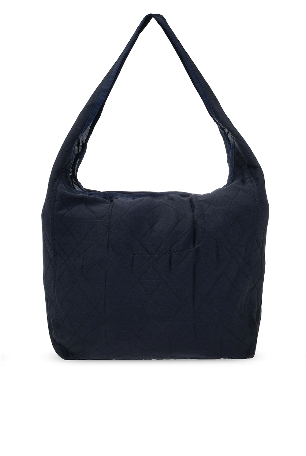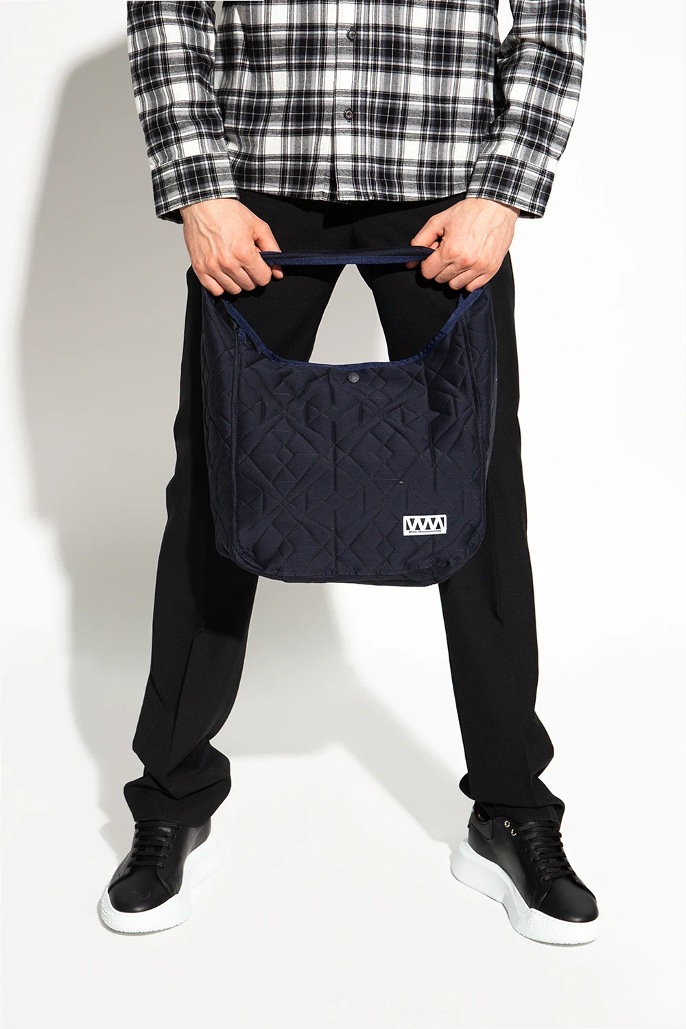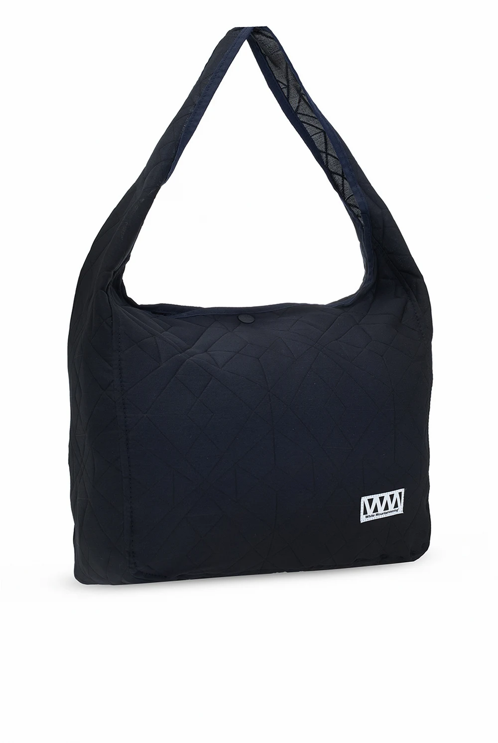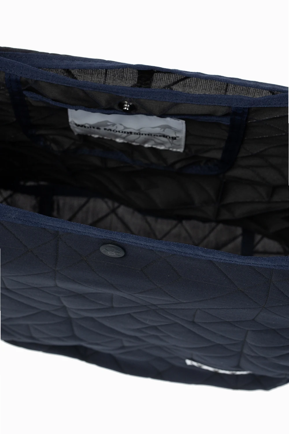 Navy hand bag from White Mountaineering. Fastened with snaps, this design features an embroidered pattern, logo patch in black and white, half-round handle and one internal compartment with one slip pocket.