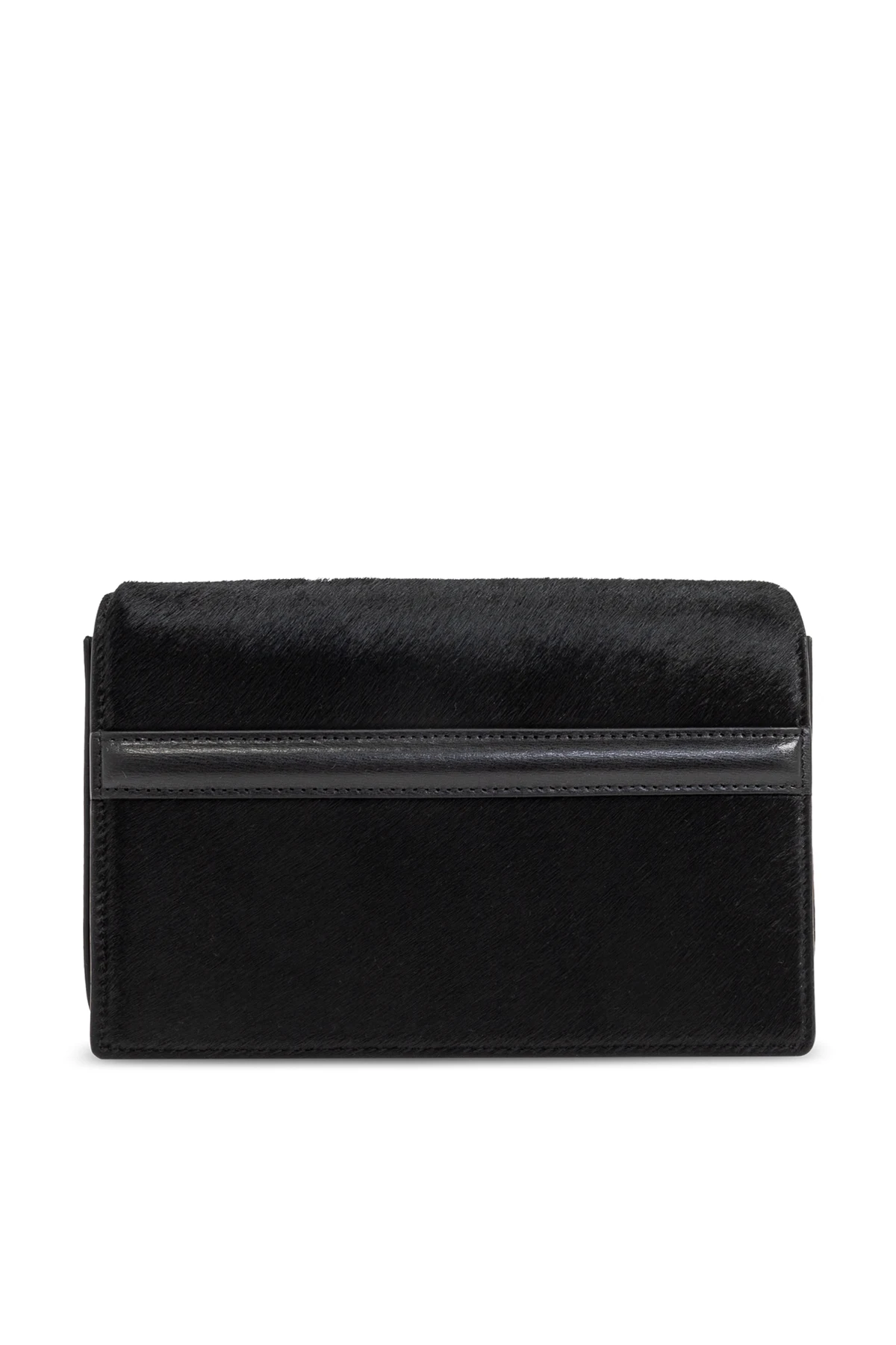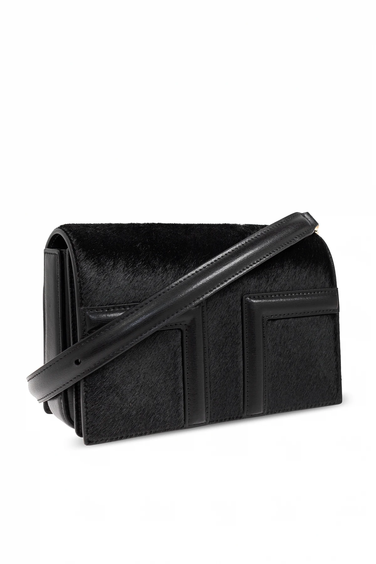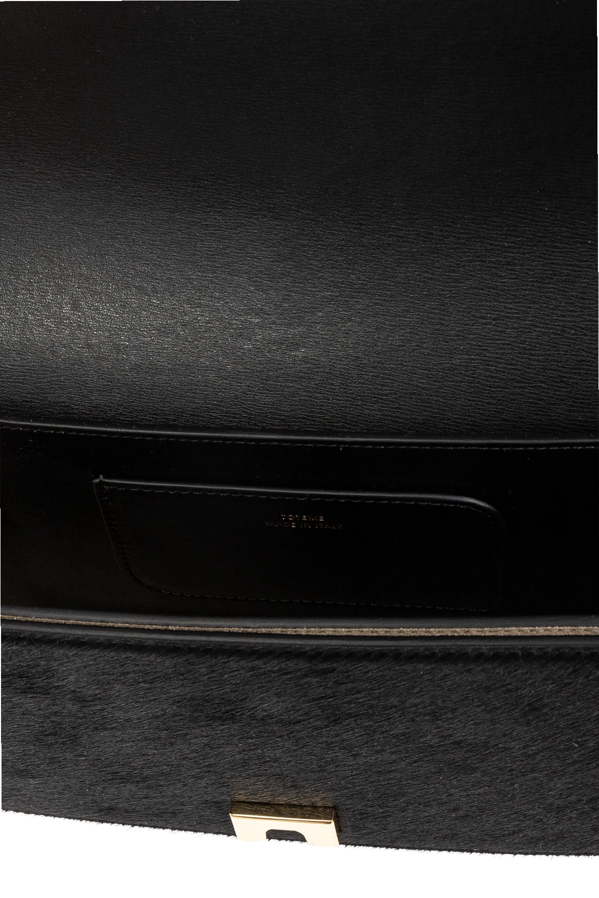 Discover the epitome of refinement with the Mini T-Flap handbag, a masterpiece from the illustrious TOTEME collection. Exquisitely crafted from cowhide leather with a subtle fur-like texture, this handbag exudes an air of sophistication. Boasting a sleek rectangular silhouette with a top flap, it features a long, adjustable shoulder strap for versatile styling. The front displays two vertical panels, creating a distinctive T-shaped motif, while the interior offers a discreet pocket, ensuring both style and functionality. The gold-toned metal snap closure adds a touch of luxury, making it an ideal companion for formal occasions. In classic black, the Mini T-Flap bag is a testament to TOTEME\'s commitment to modern elegance, seamlessly blending minimalism with urban chic. Why Choose This Product? Luxurious cowhide leather with a unique texture. Iconic design with a distinctive T-shaped front motif. Adjustable strap for personalized style. Perfect size for formal events and daily sophistication.