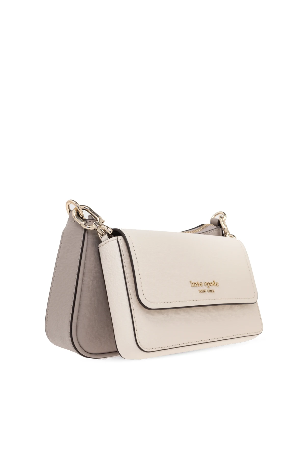 Introducing the Kate Spade Double Shoulder Bag, a paragon of minimalist elegance and functional sophistication. Crafted from 100% high-quality leather, this exquisite piece boasts a classic, rectangular shape with gently rounded corners, embodying timeless style. Its cream hue, accentuated by subtle brown accents, radiates understated luxury and versatility. The bag\'s surface is unadorned, save for the distinctive golden logo of the designer, Kate Spade, that serves as both a hallmark of authenticity and a touch of opulence. The interior, accessible via a secure zip closure complemented by a magnetic clasp, is meticulously lined and organized into two main compartments and three card slots, ensuring your essentials are neatly stored and easily accessible. An adjustable strap, crafted from durable fabric and enhanced with metal elements, offers the convenience of shoulder wear, adding a layer of contrast and practicality to this elegant accessory. Why Purchase This Product? Exquisite Craftsmanship: Made from 100% leather, promising durability and a luxurious feel. Timeless Design: The bag\'s classic shape and cream color offer endless styling possibilities. Functional Elegance: Equipped with a secure zip and magnetic closure, along with internal compartments and card slots for organization. Versatile Wear: Features an adjustable shoulder strap for comfortable, custom fit. Designer Appeal: Embellished with Kate Spade\'s iconic logo, adding a prestigious touch to your accessory collection.