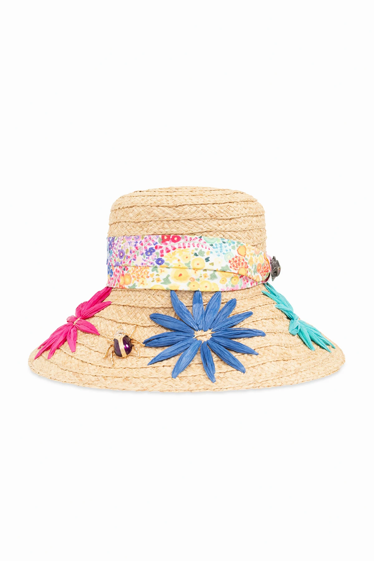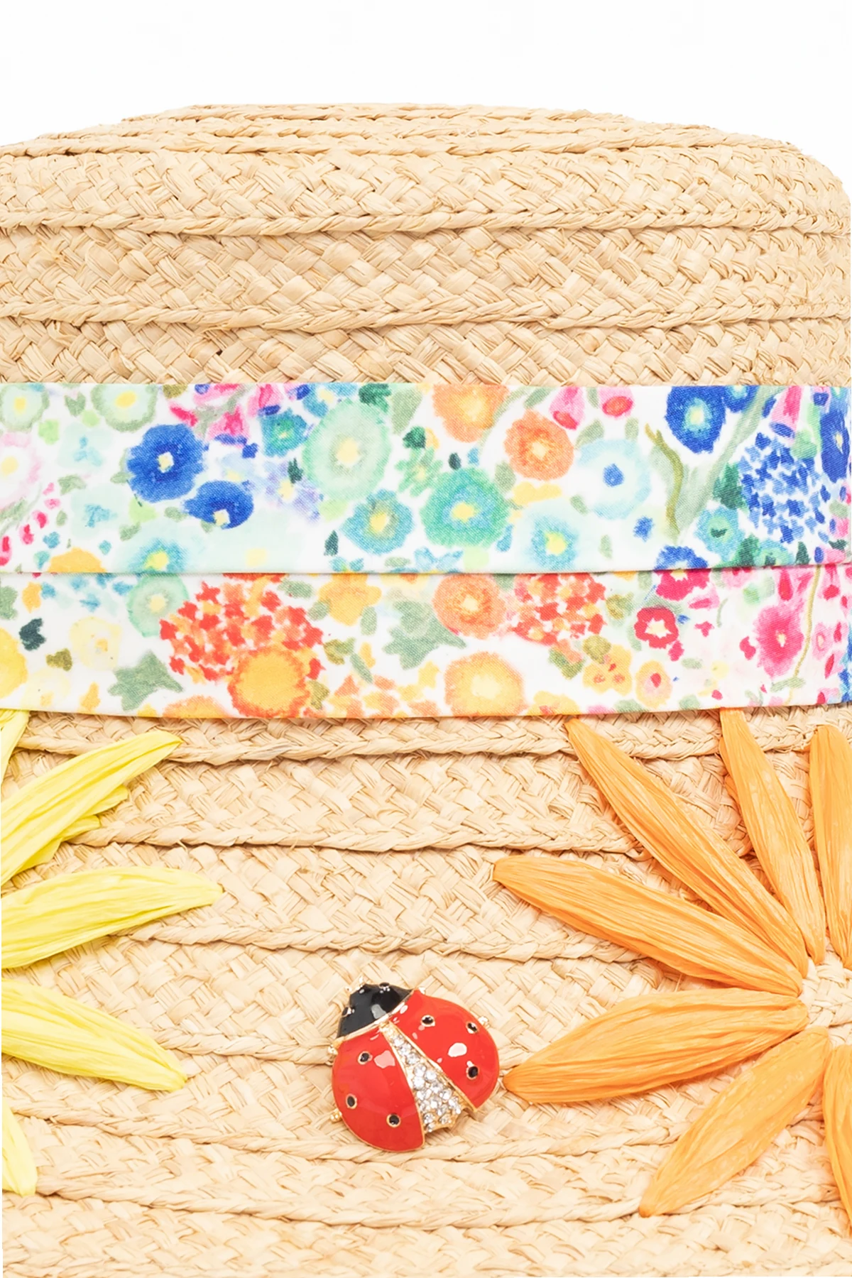 Discover the epitome of summer elegance with the Floral Couture hat by Kurt Geiger. This exquisite piece, crafted from intricately woven materials that mimic the natural beauty and lightness of straw, is a testament to sophisticated craftsmanship and delicate aesthetics. Its classic wide-brim silhouette is complemented by a vibrant, multicolored floral ribbon that encircles the crown, offering a burst of color and an impression of an eternal spring. The hat\'s allure is further enhanced by its unique details: three-dimensional floral appliqués and a charming ladybug figure, meticulously crafted from textile or felt materials, adding a playful yet elegant touch. These intricate embellishments are set against a versatile beige palette, making this hat an easily adaptable accessory to a myriad of summer outfits, from a casual day at the beach to a more composed ensemble paired with a light blazer. Why Purchase This Product? Timeless design with a classic wide-brimmed silhouette and an indented crown, offering both style and sun protection. Exquisite watercolor floral pattern on the ribbon, adding a vibrant, artistic touch to any outfit. Handcrafted decorative appliqués, including a whimsical ladybug, infusing the piece with uniqueness and charm. Made from high-quality woven material that resembles natural straw, ensuring durability and comfort. Part of the Floral Couture collection by renowned designer Kurt Geiger, symbolizing luxury and exclusivity.