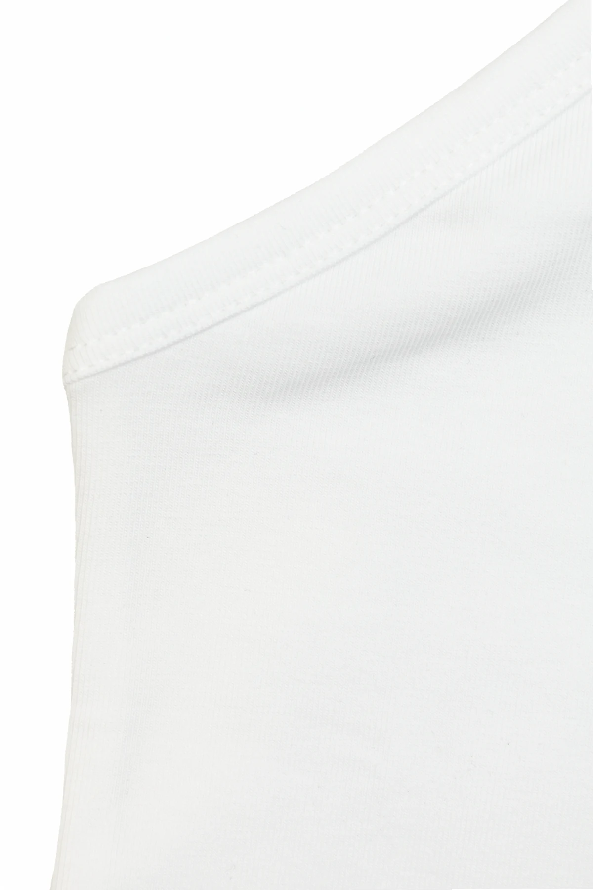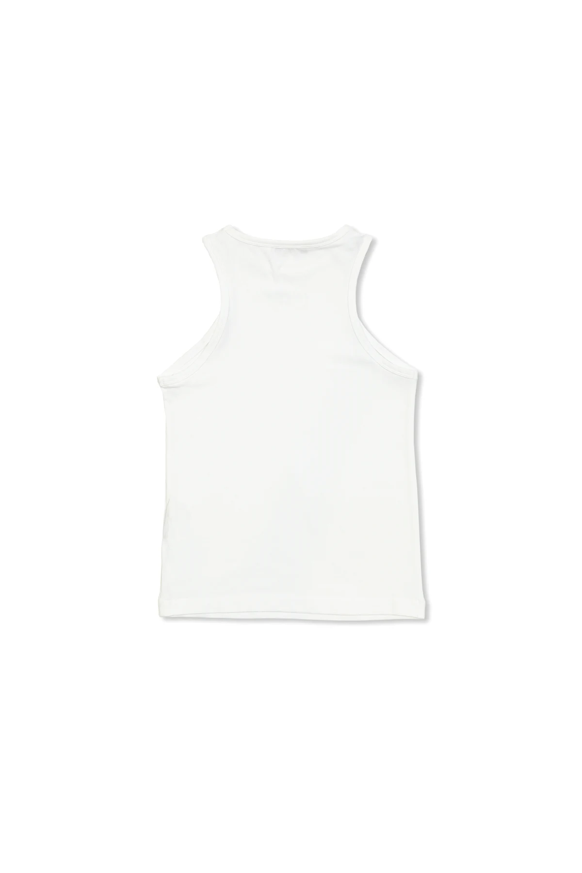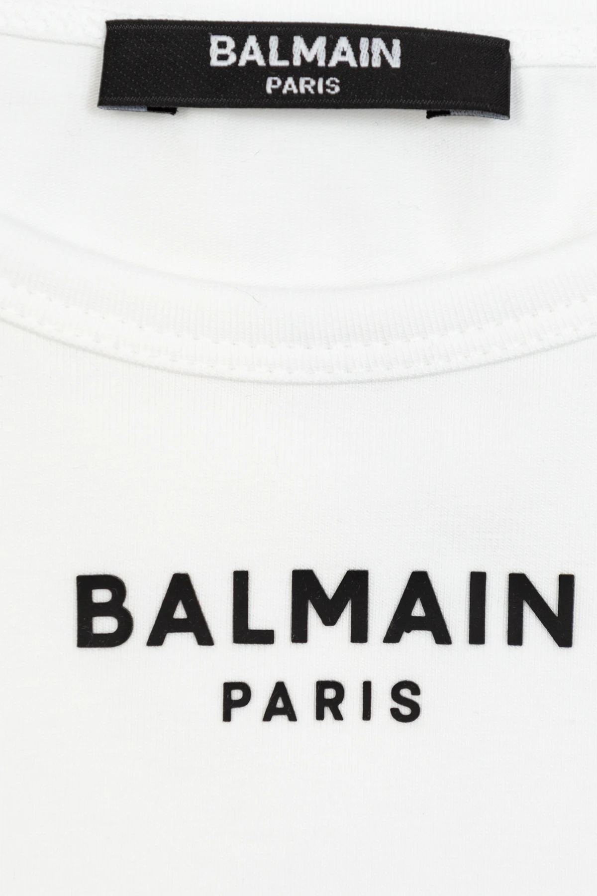 Embrace the epitome of refined fashion with this exquisite white top from the exclusive Balmain Kids collection. Designed with wide straps and a sleeveless cut, this top exudes a sporty elegance that is both chic and versatile. Crafted from a smooth, elastic fabric, it offers unparalleled comfort while maintaining a polished appearance. The bold black \"BALMAIN PARIS\" inscription adorning the front adds a distinctive flair, synonymous with the brand\'s luxurious heritage. This top, with its crisp white hue and iconic logo on the inner label, seamlessly integrates into your wardrobe as a staple piece, perfect for warm days or layered outfits. Why Choose This Product? Exclusive Design: Part of the Balmain Kids collection, inspired by high fashion runways. Premium Materials: Crafted from a luxurious blend of cotton and elastane for comfort and style. Iconic Branding: Features the renowned \"BALMAIN PARIS\" logo, a hallmark of elegance.