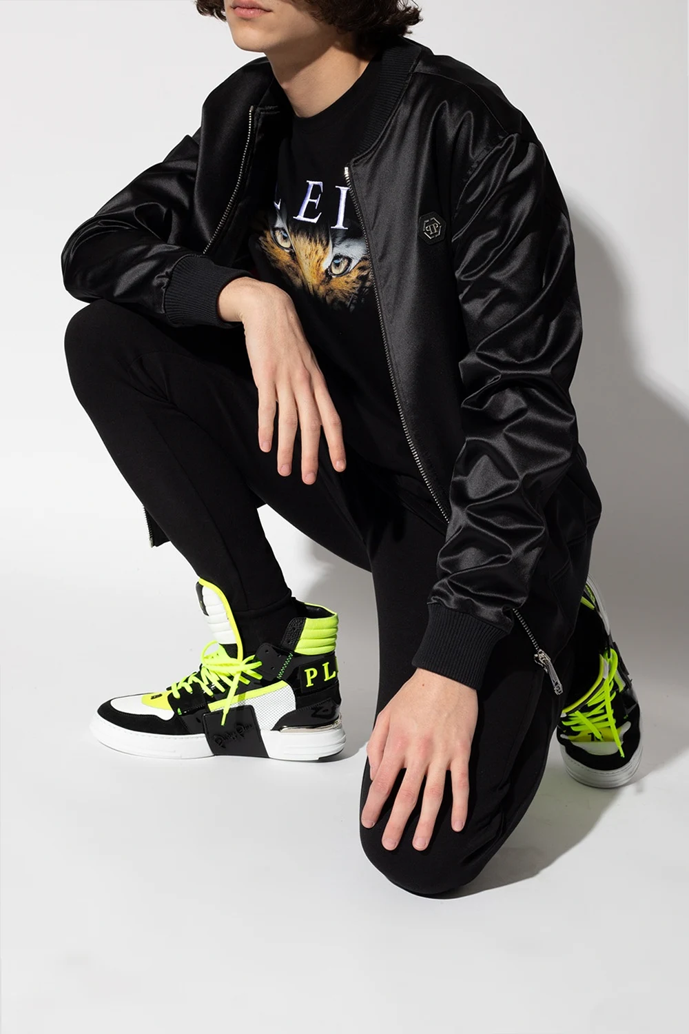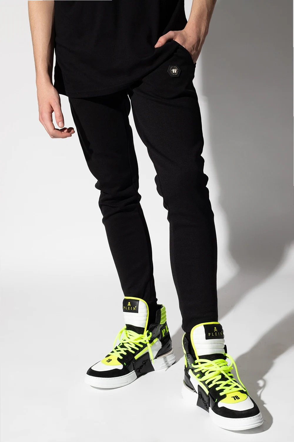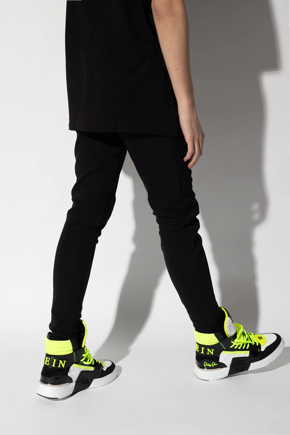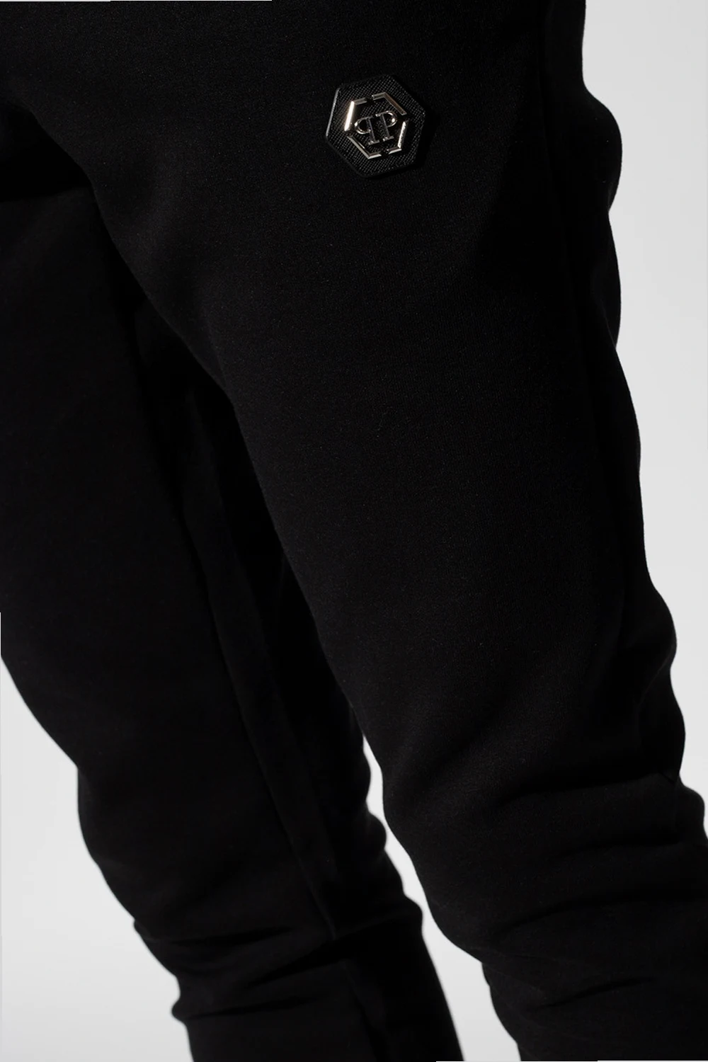Black sweatpants from Philipp Plein. This design features an elastic waistband with drawstrings, logo patch in black and silver-tone, three slip pockets and ribbed cuffs.