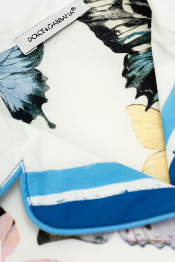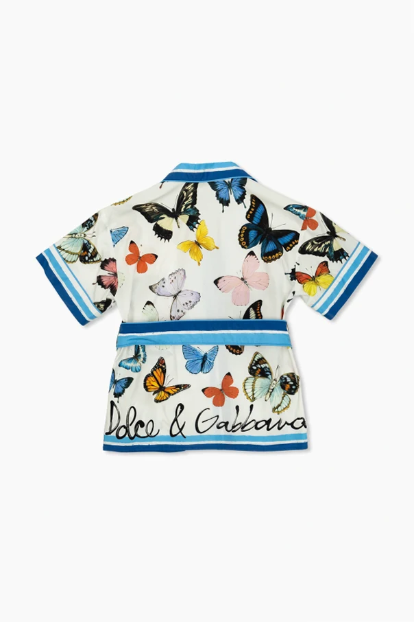 Introducing the Dolce & Gabbana Kids Belted Shirt , a masterpiece of sartorial elegance and playful charm. This exquisite garment, adorned with vibrant colorful butterflies against a pristine white background, encapsulates the vivacity of youth. Crafted from luxurious 100% cotton , it offers comfort without compromising style.
