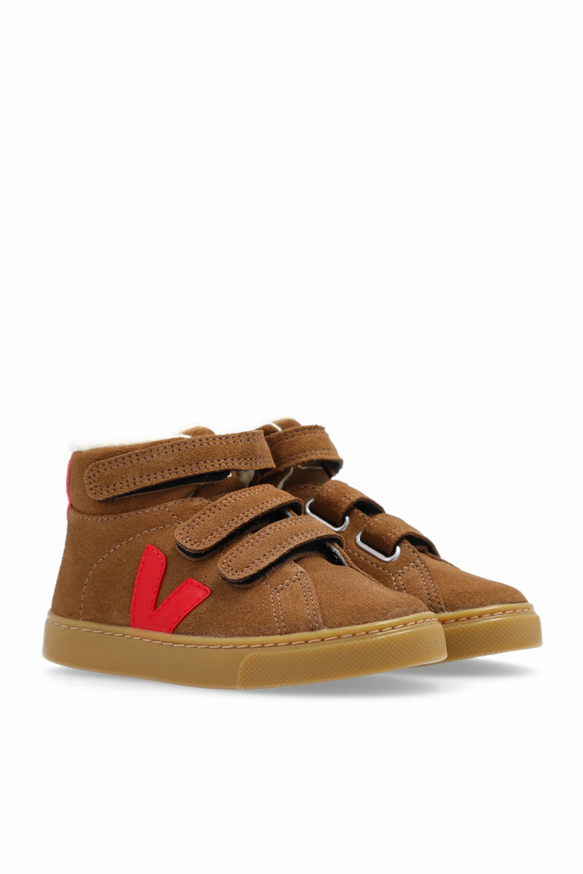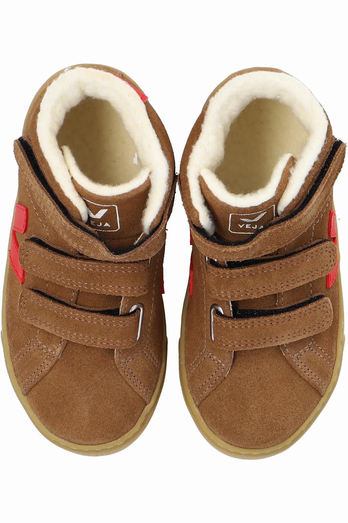 Brown ‘Pekin’ boots from Veja. Made of suede, this pair sits on a brown rubber sole and features velcro fastening, a red logo patch and insulating fleece lining.