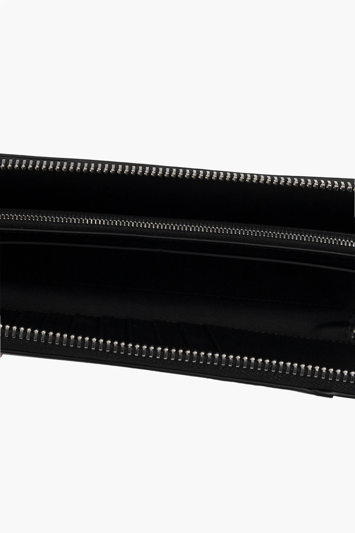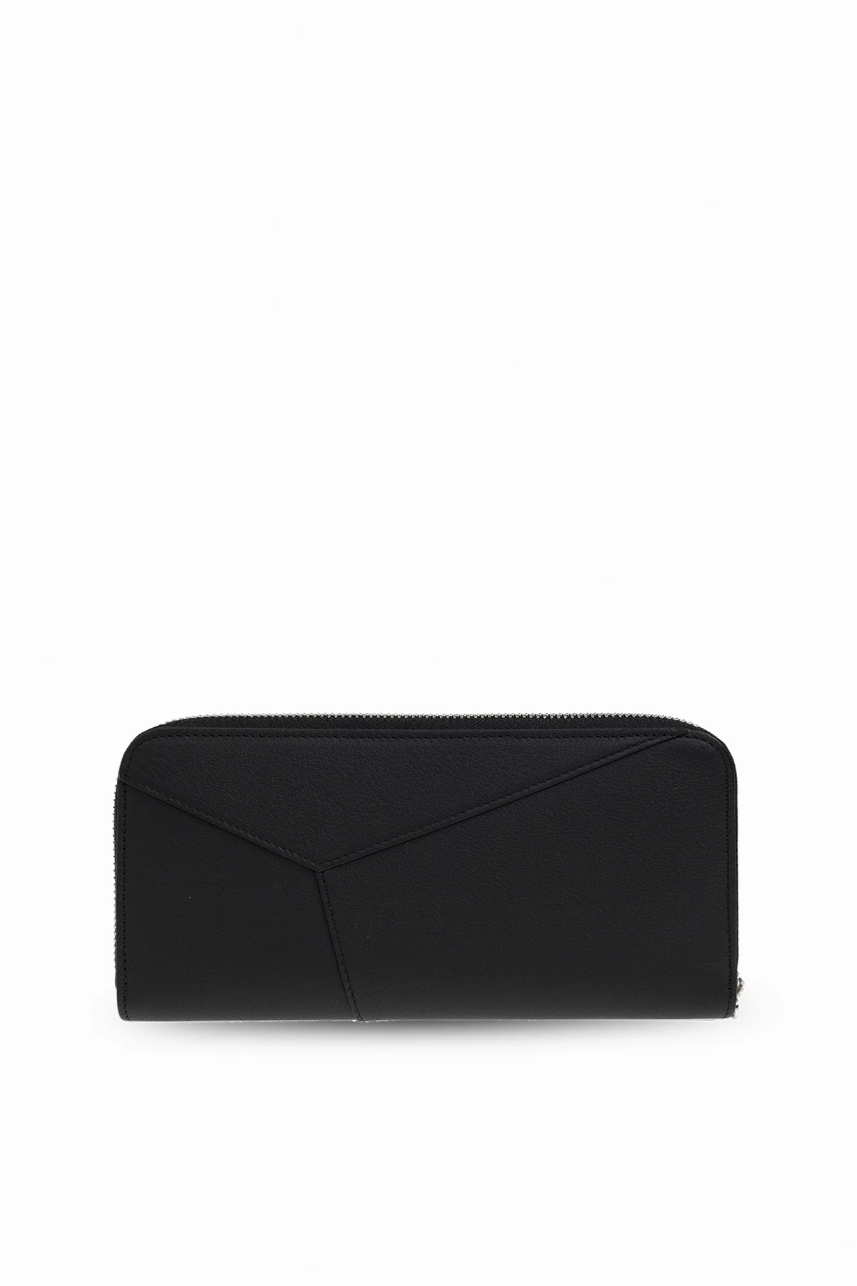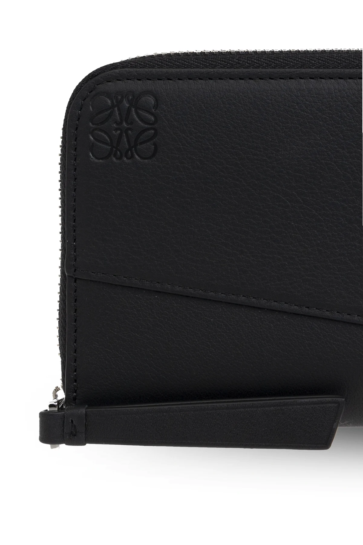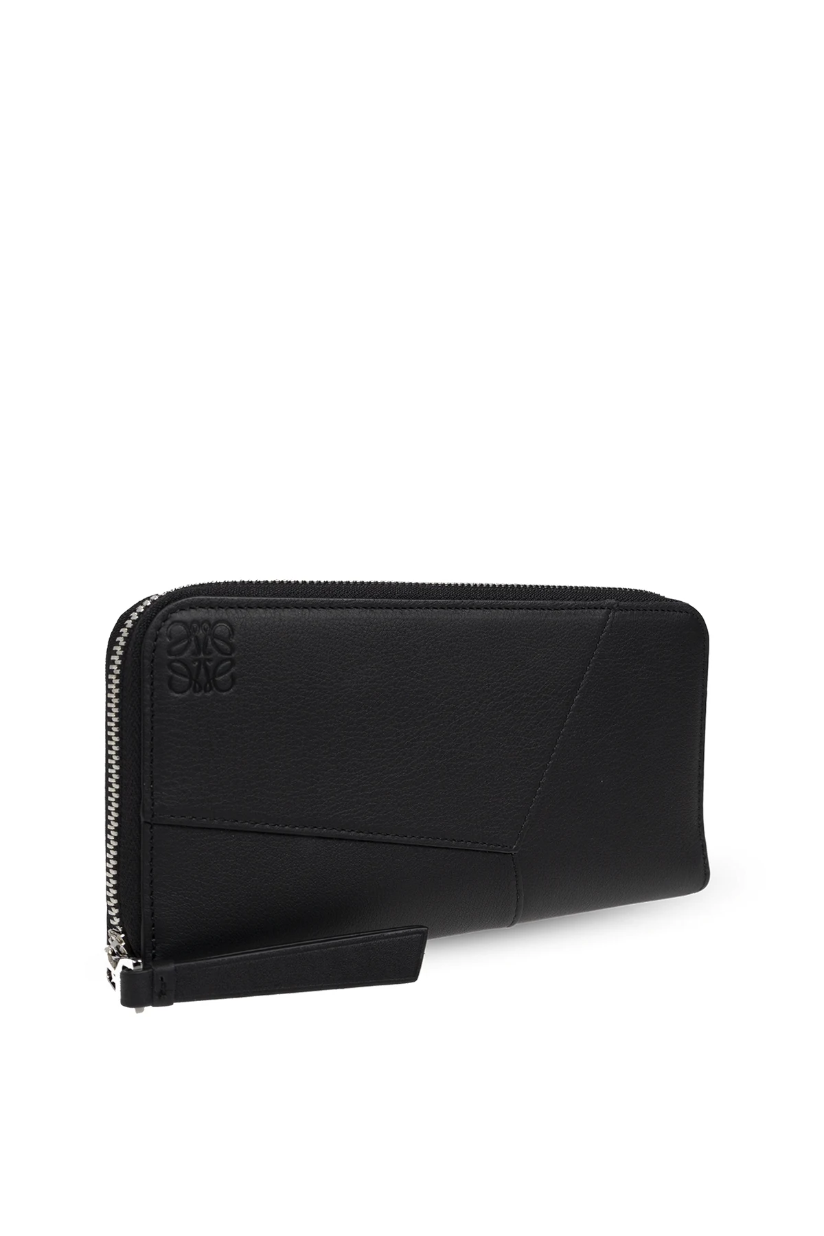 Introducing the Loewe Leather Wallet, an epitome of classic elegance intertwined with modern functionality. Crafted from exquisite calf leather, this wallet showcases a sleek black hue, accentuated by a subtly embossed designer logo on its front. The wallet\'s design is a testament to contemporary aesthetics, featuring geometric stitching that exudes sophistication. Its secure zip closure ensures the protection of your belongings, while the wrist strap offers convenient portability. Inside, the wallet is thoughtfully designed with multiple compartments for cards, banknotes, and a zipped coin pocket, providing ample space for meticulous organization. With ten card slots, two slip pockets, and dedicated sections for bills and coins, it seamlessly blends style with utility. Why Choose This Product? High-quality calf leather with a smooth finish Modern design with elegant geometric stitching Secure zip fastening and wrist strap for ease of carry Ample interior storage with specialized compartments Timeless craftsmanship by the renowned brand Loewe